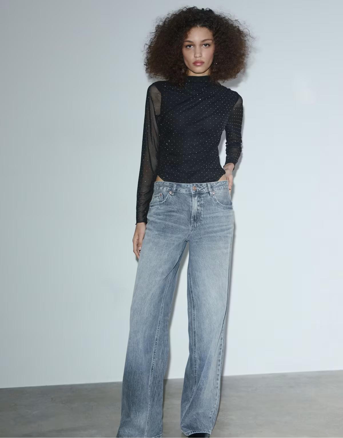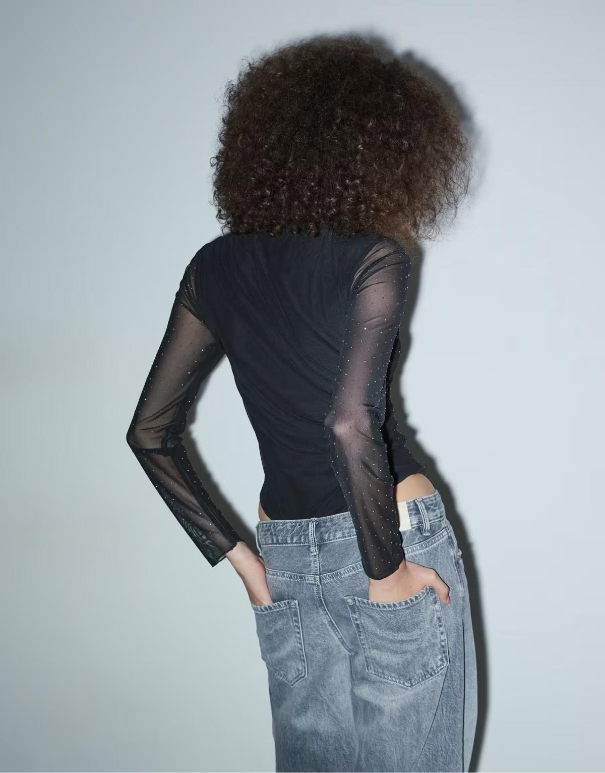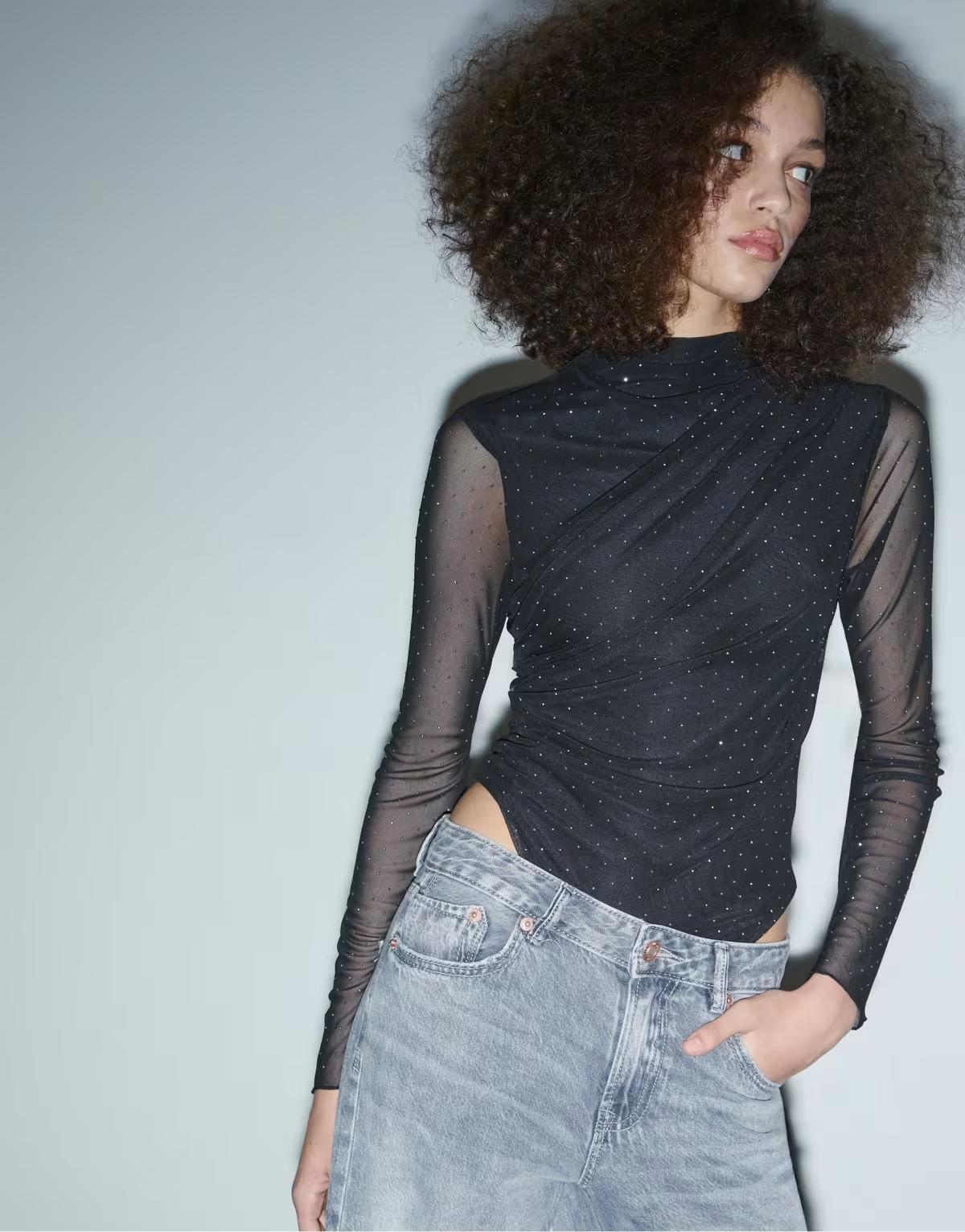 Stradivarius Gathered tulle bodysuit with rhinestones in black