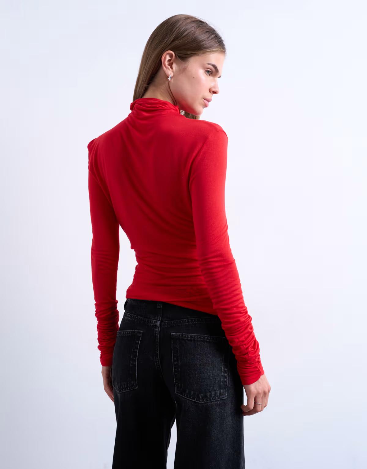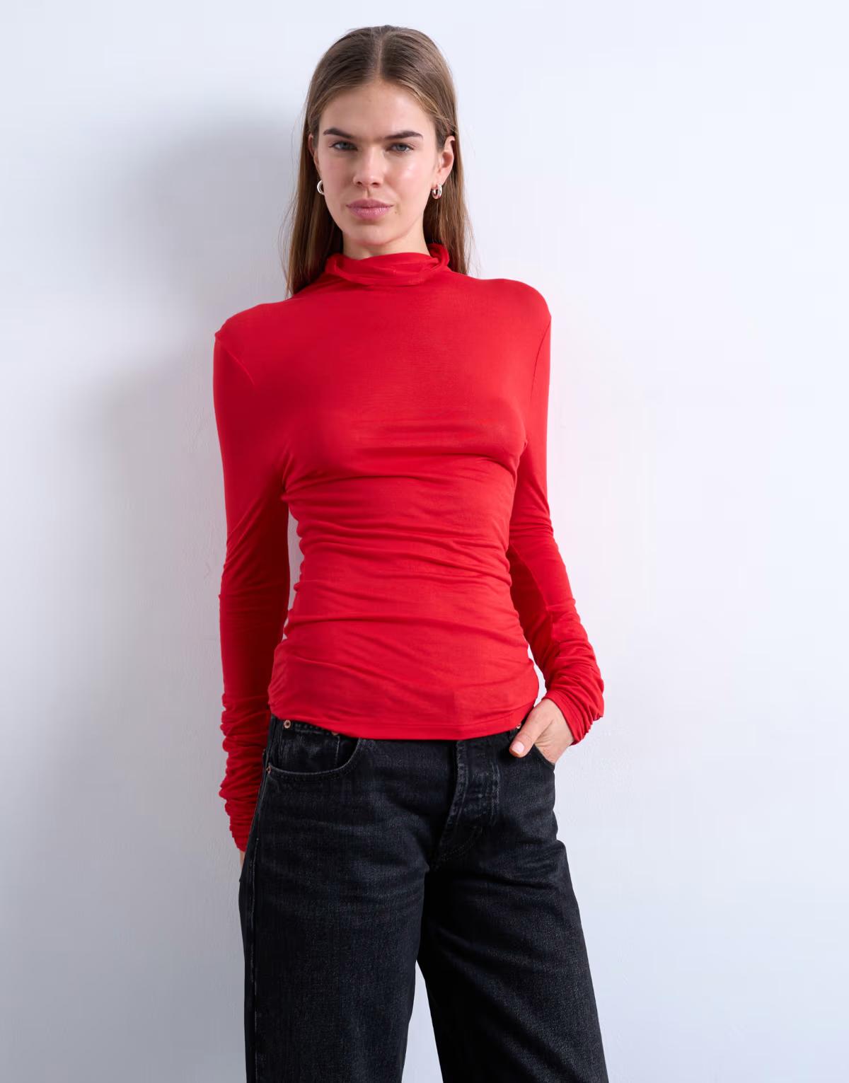 A vibrant piece for your basics collection, this top is created in fiery red. It has a high neck, long sleeves and a flattering slim fit.