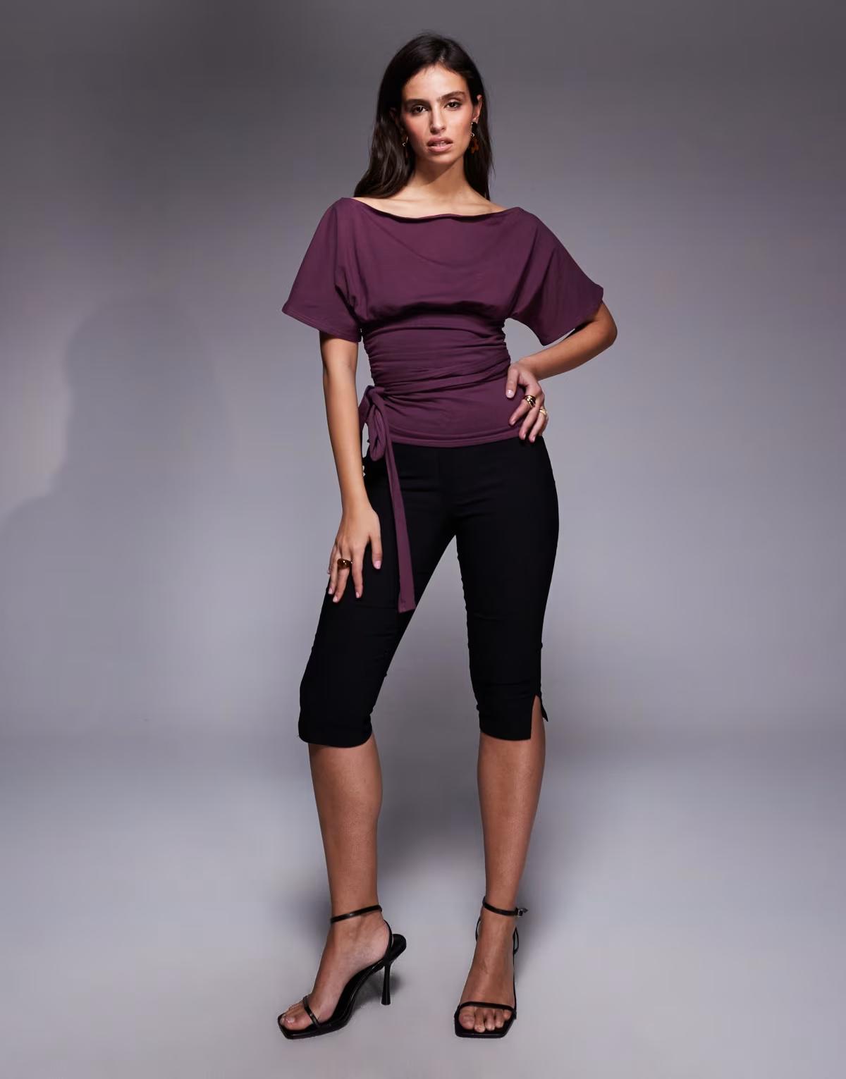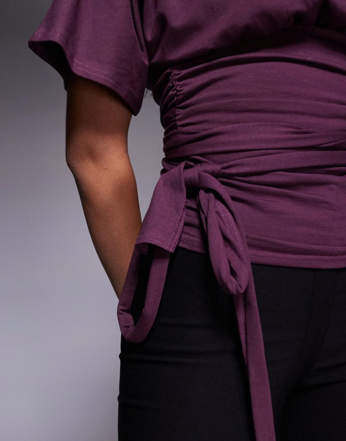 Fashionkilla cotton rich off shoulder long sleeve wrap waist detail t-shirt in burgundy