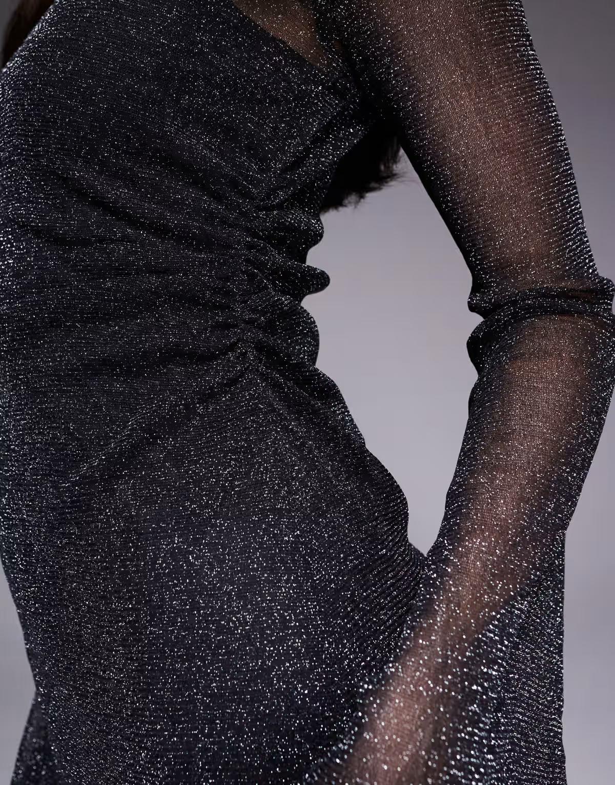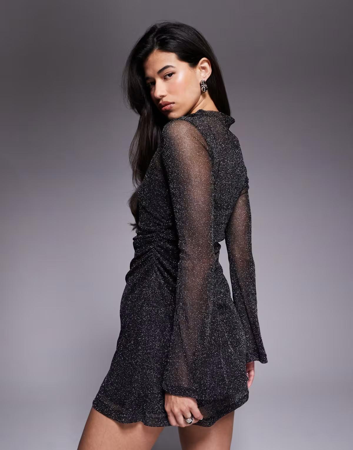 ASOS DESIGN grown on neck flute sleeve mini glitter mesh dress in black