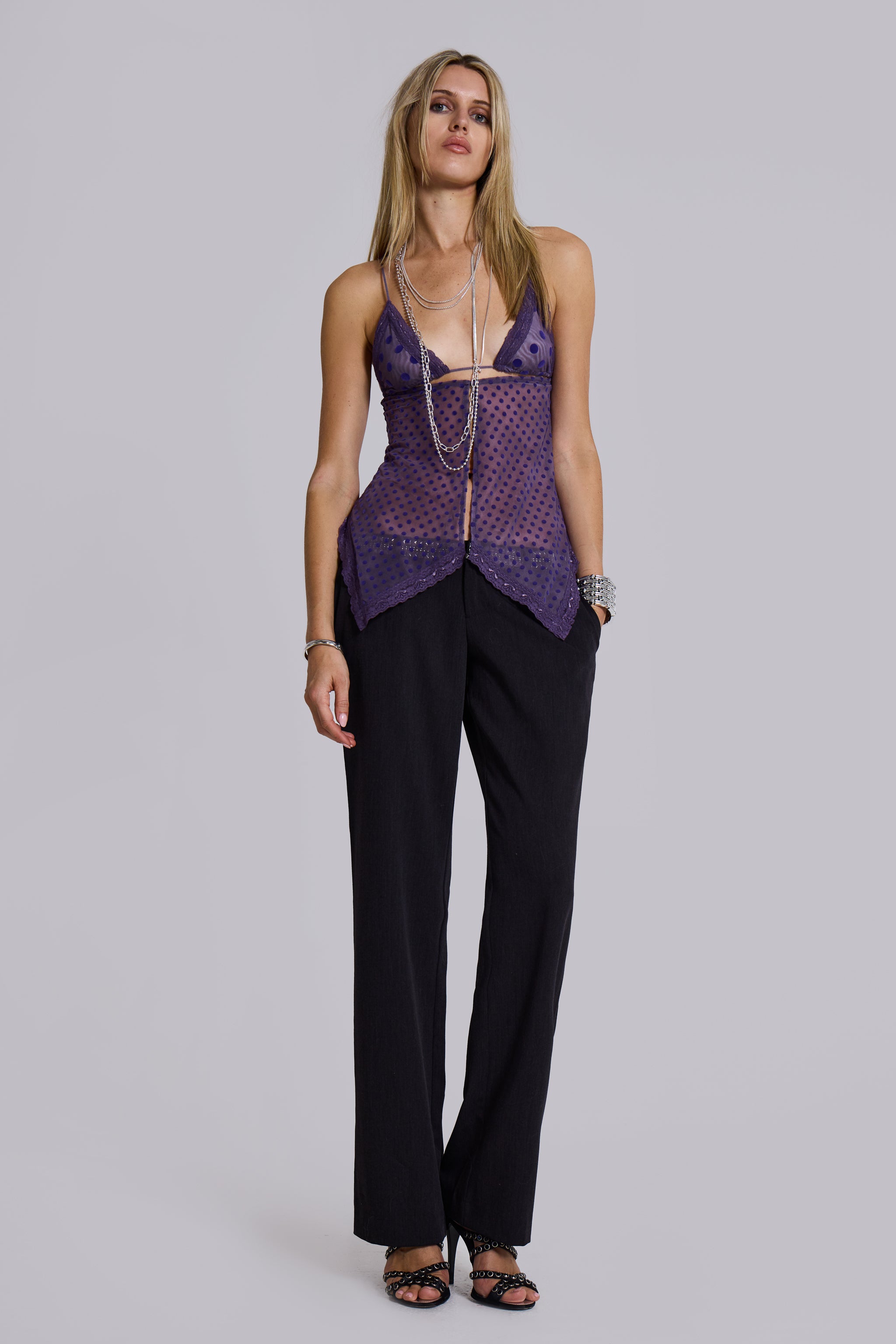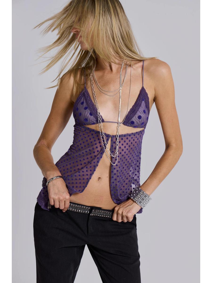 Polka Dot Flocked Mesh Cami with Lace trim Details