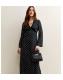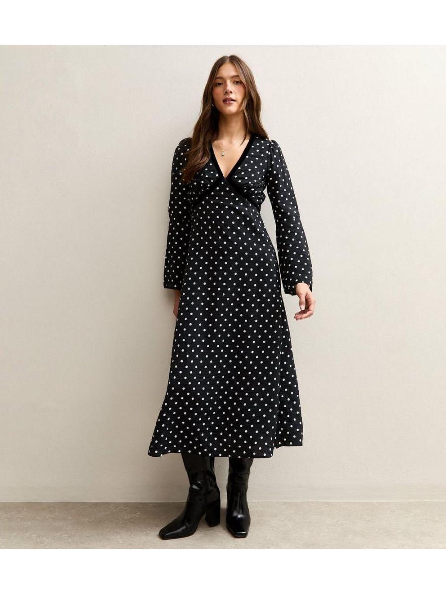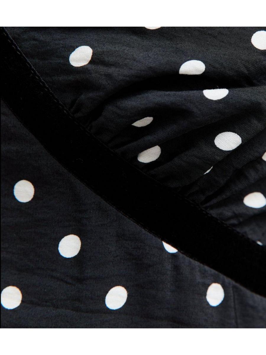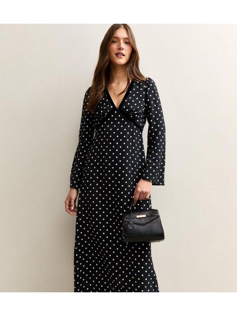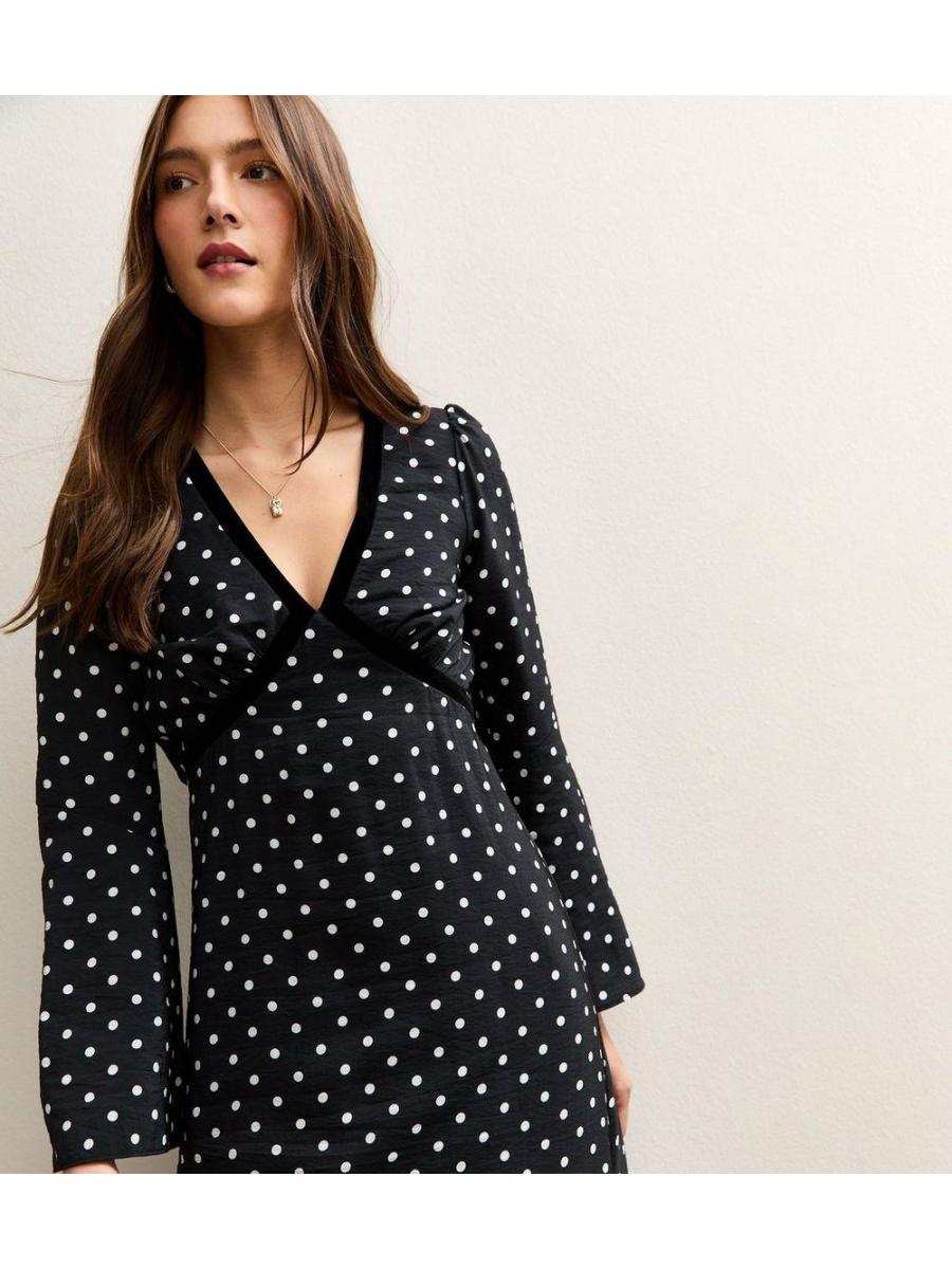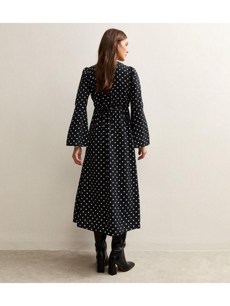Black Polka Dot Flared Sleeve Velvet Detail Midi Dress