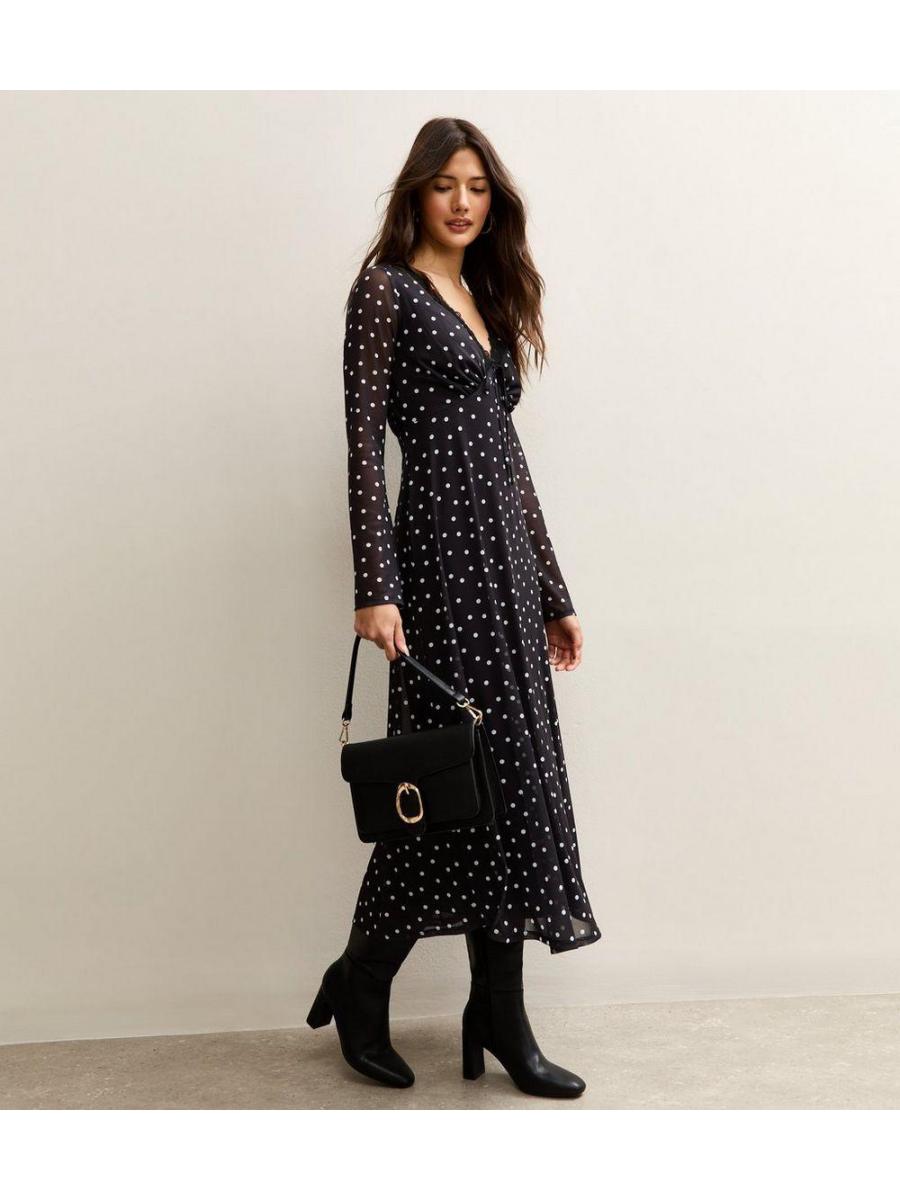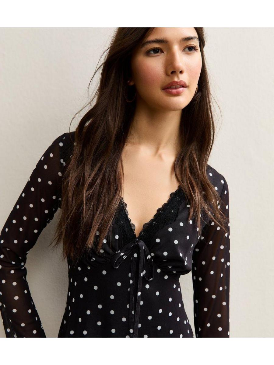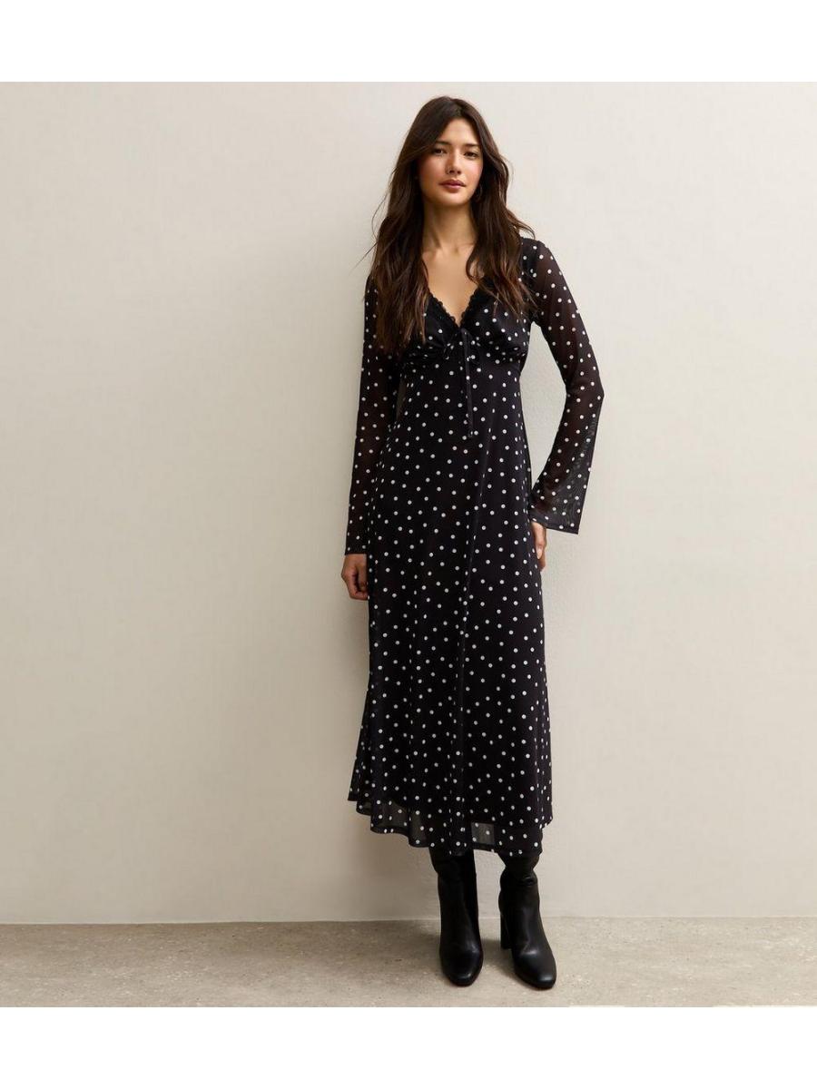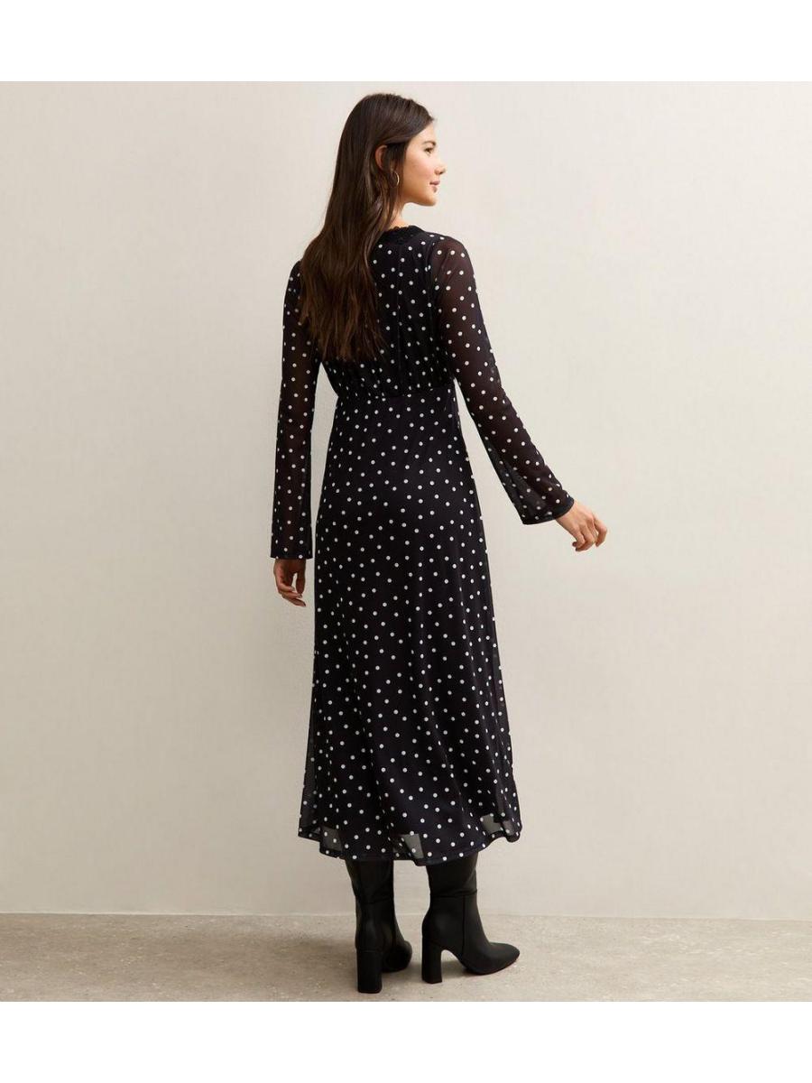 Black Polka Dot Mesh Long Sleeve Midi Dress