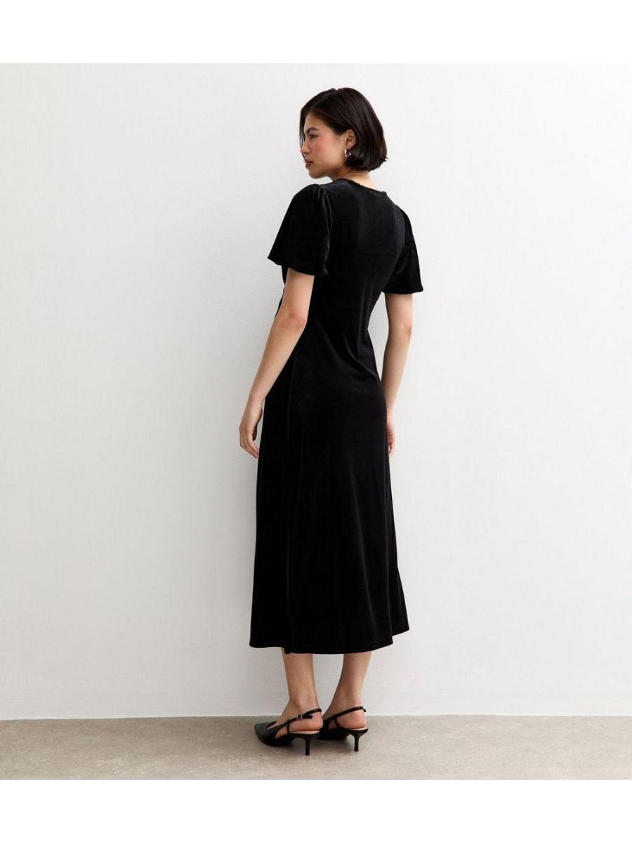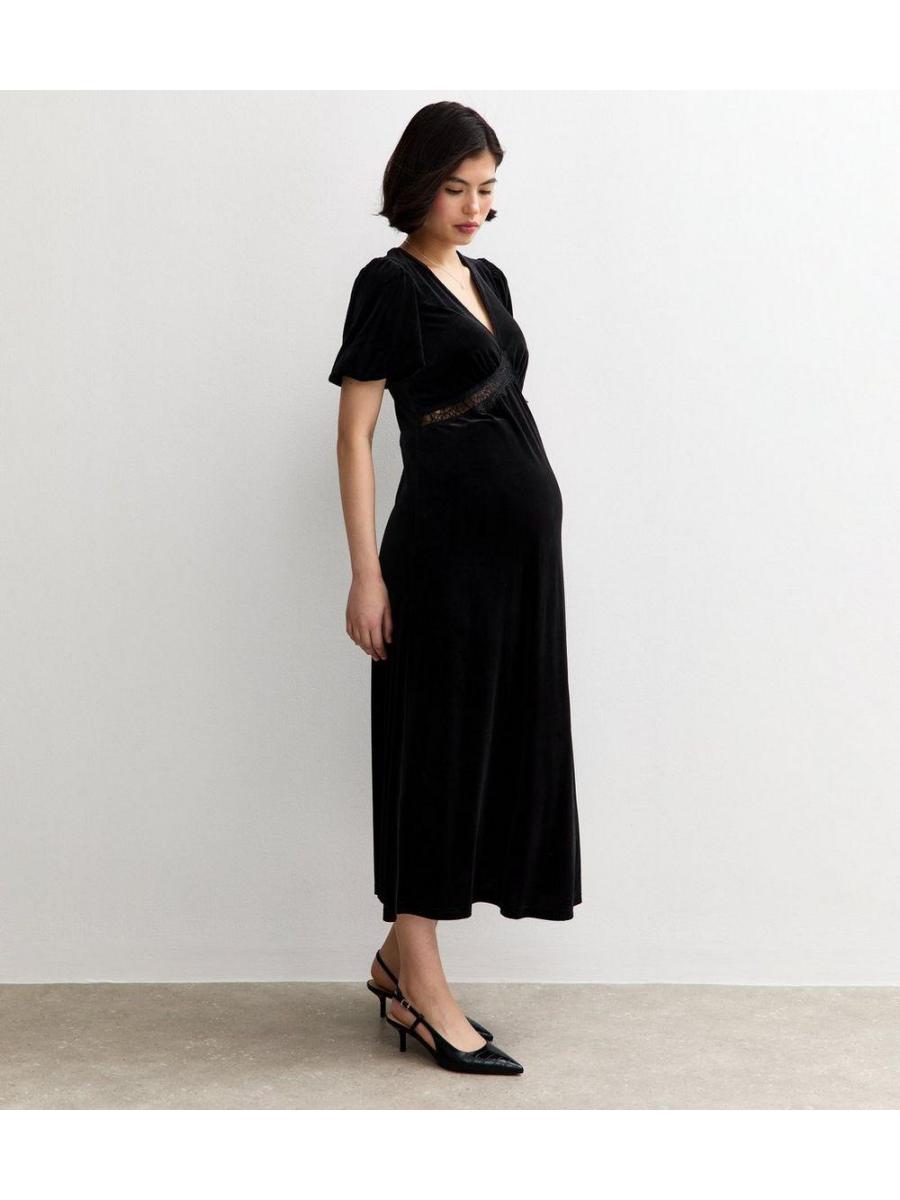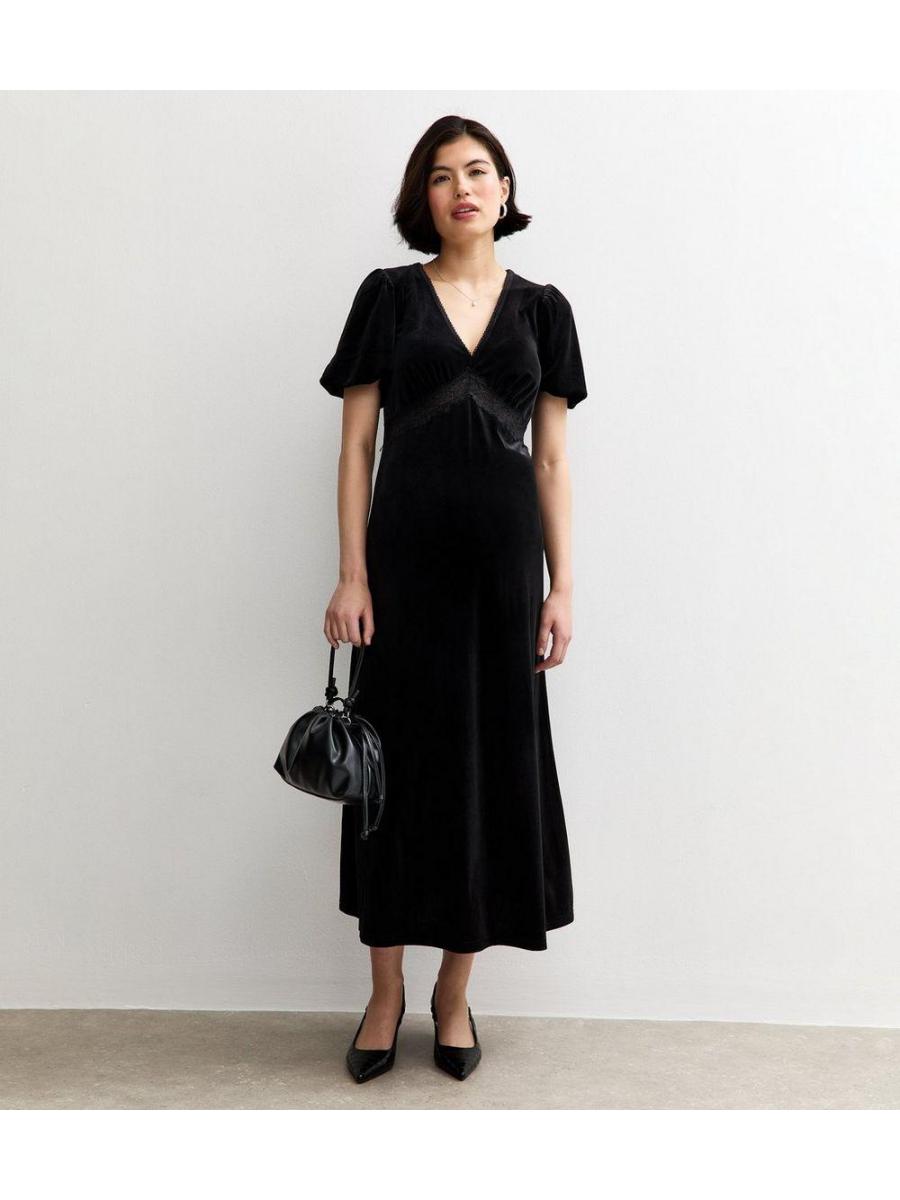 Maternity Black Velvet Short Sleeve Midi Dress