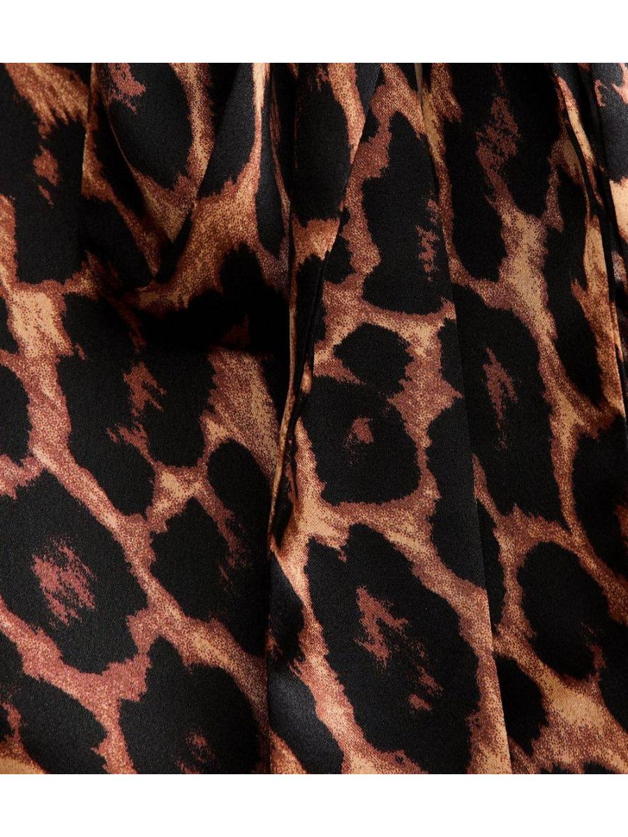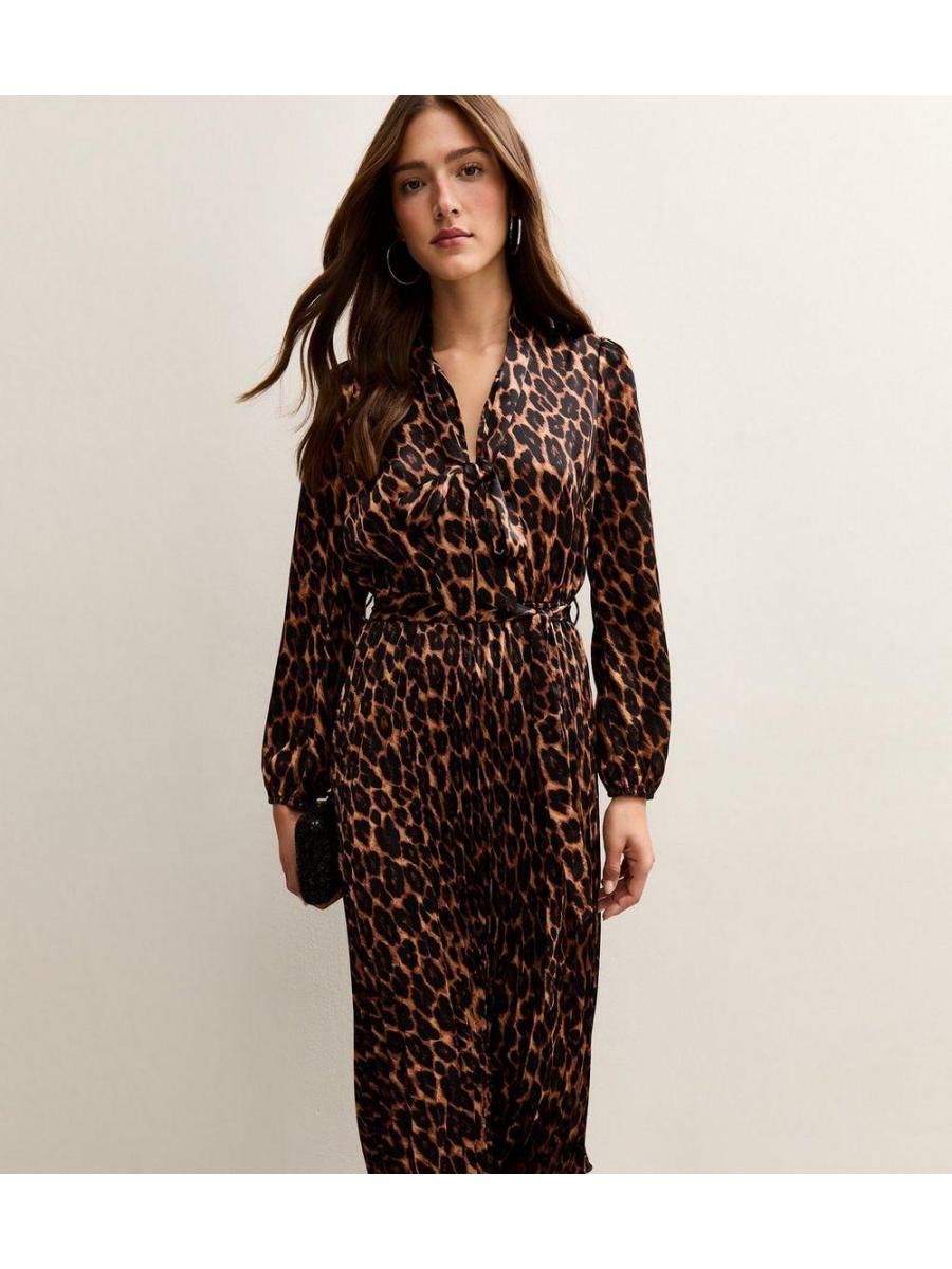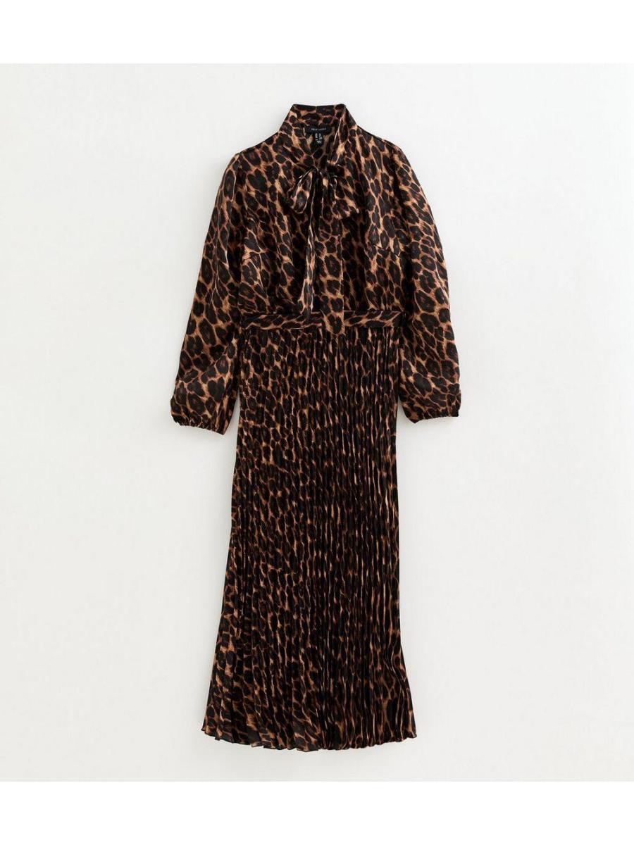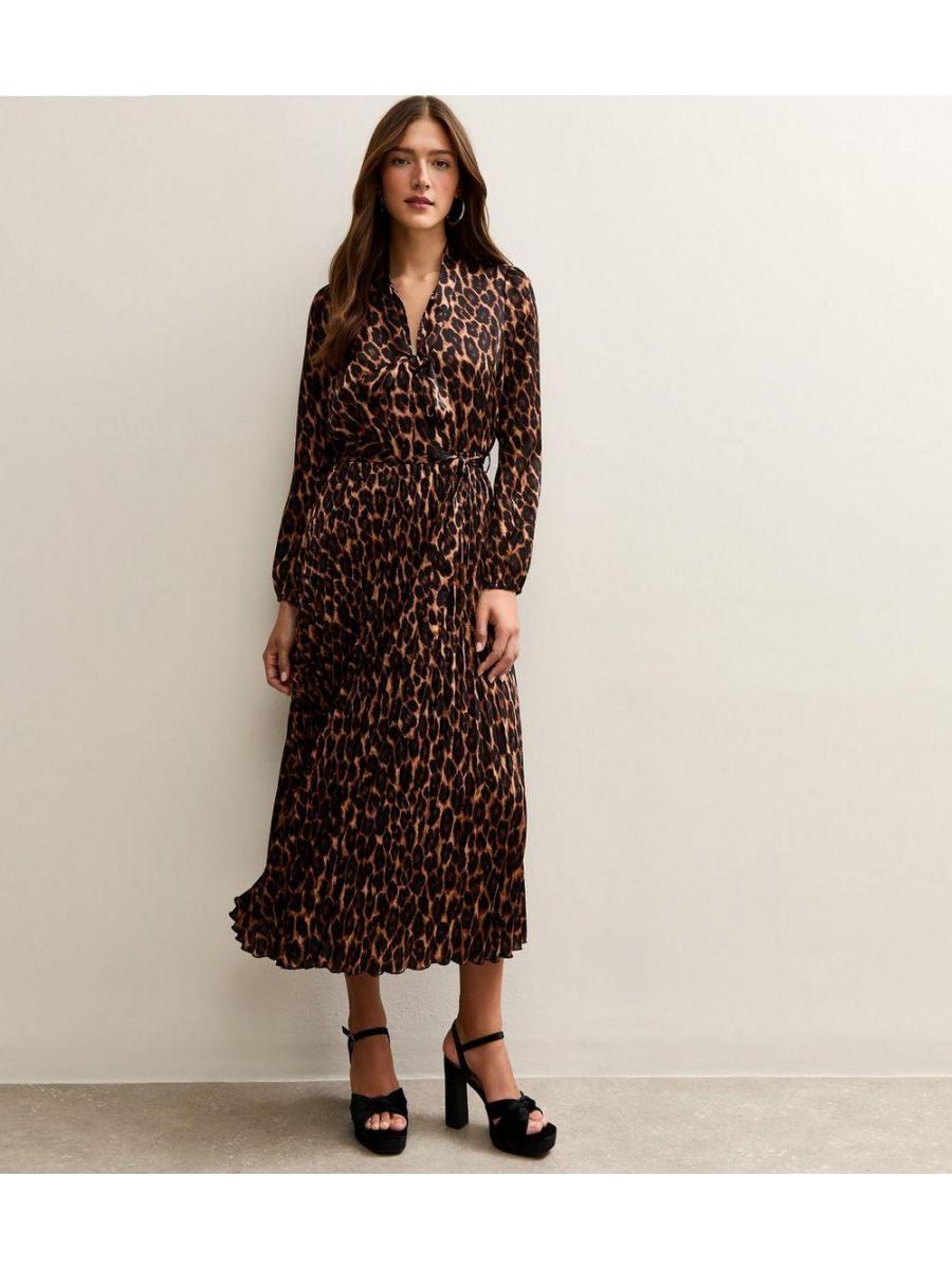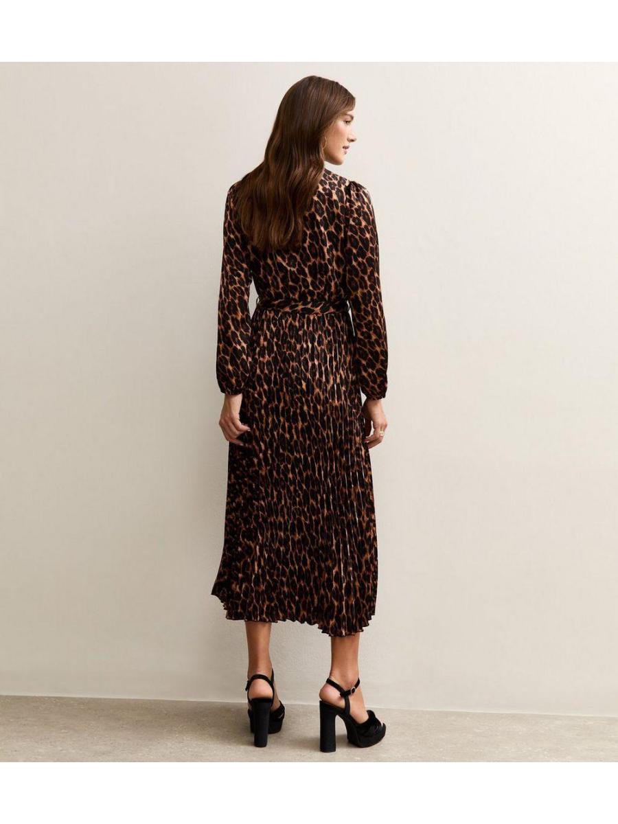 Dark Brown Animal Print Pleated Long Sleeve Midi Dress
