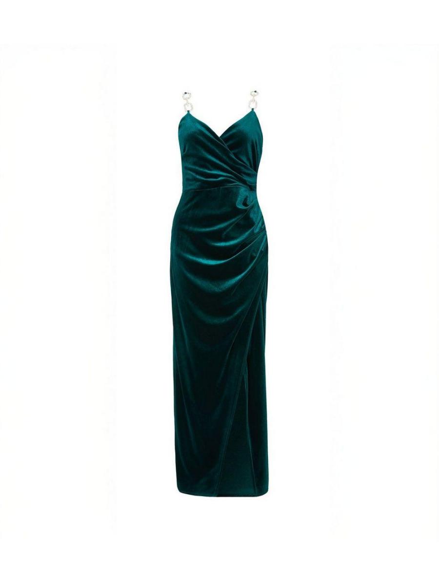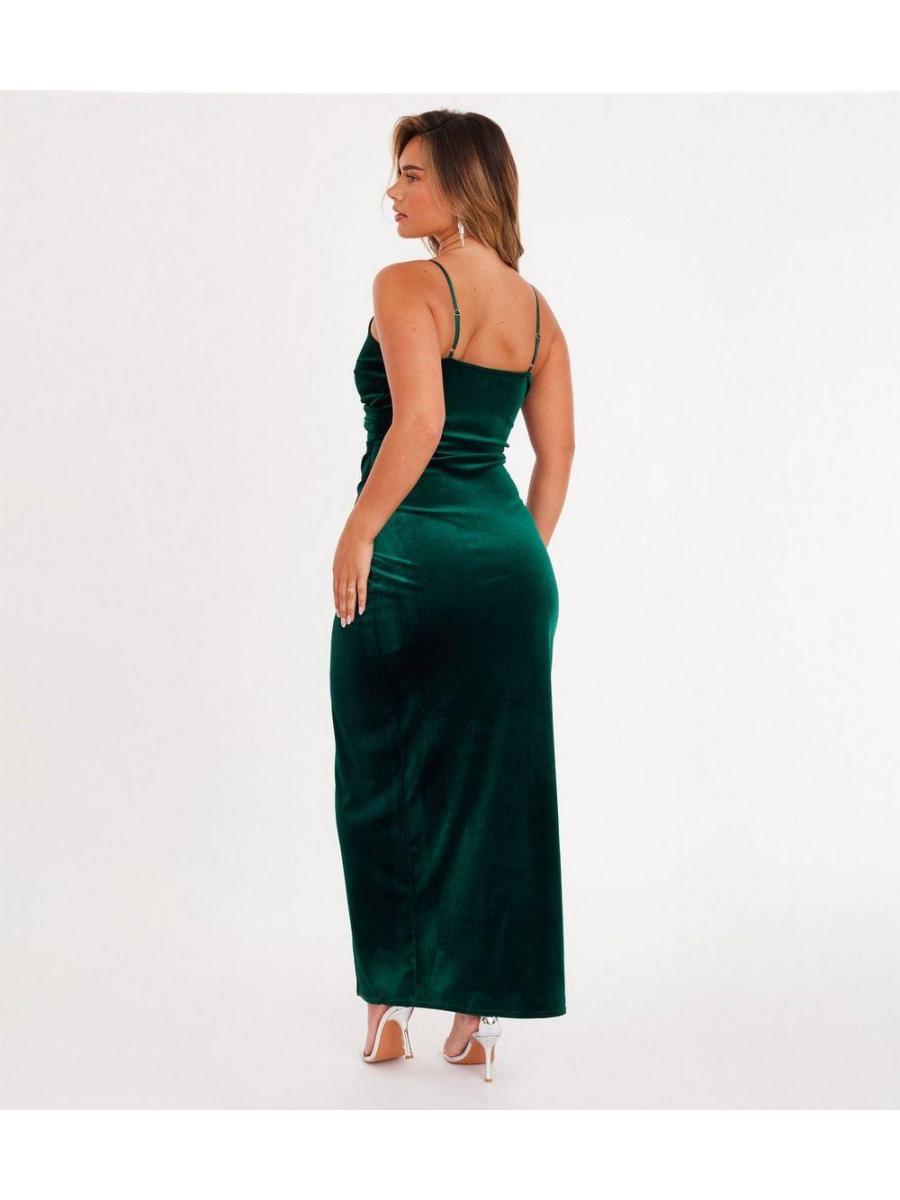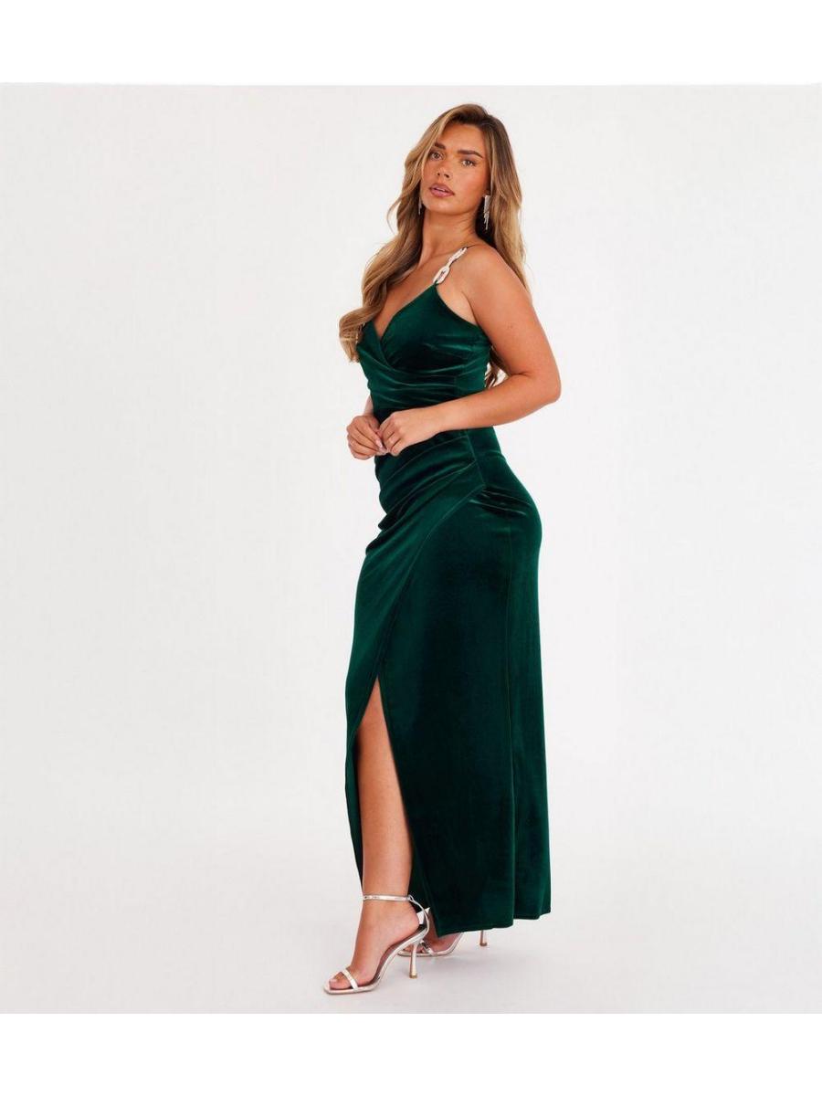 QUIZ Dark Green Velvet Diamante Chain Strap Maxi Dress