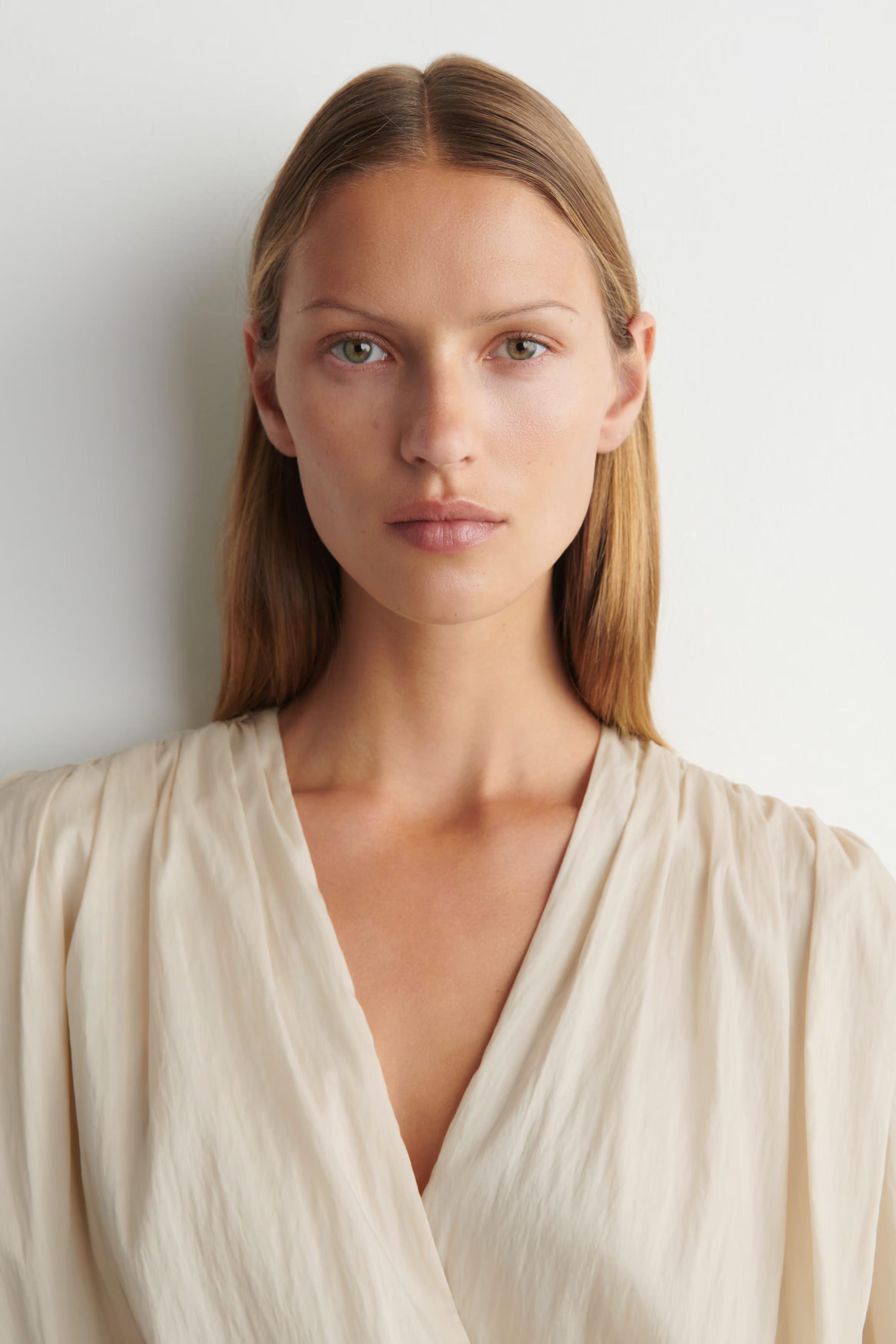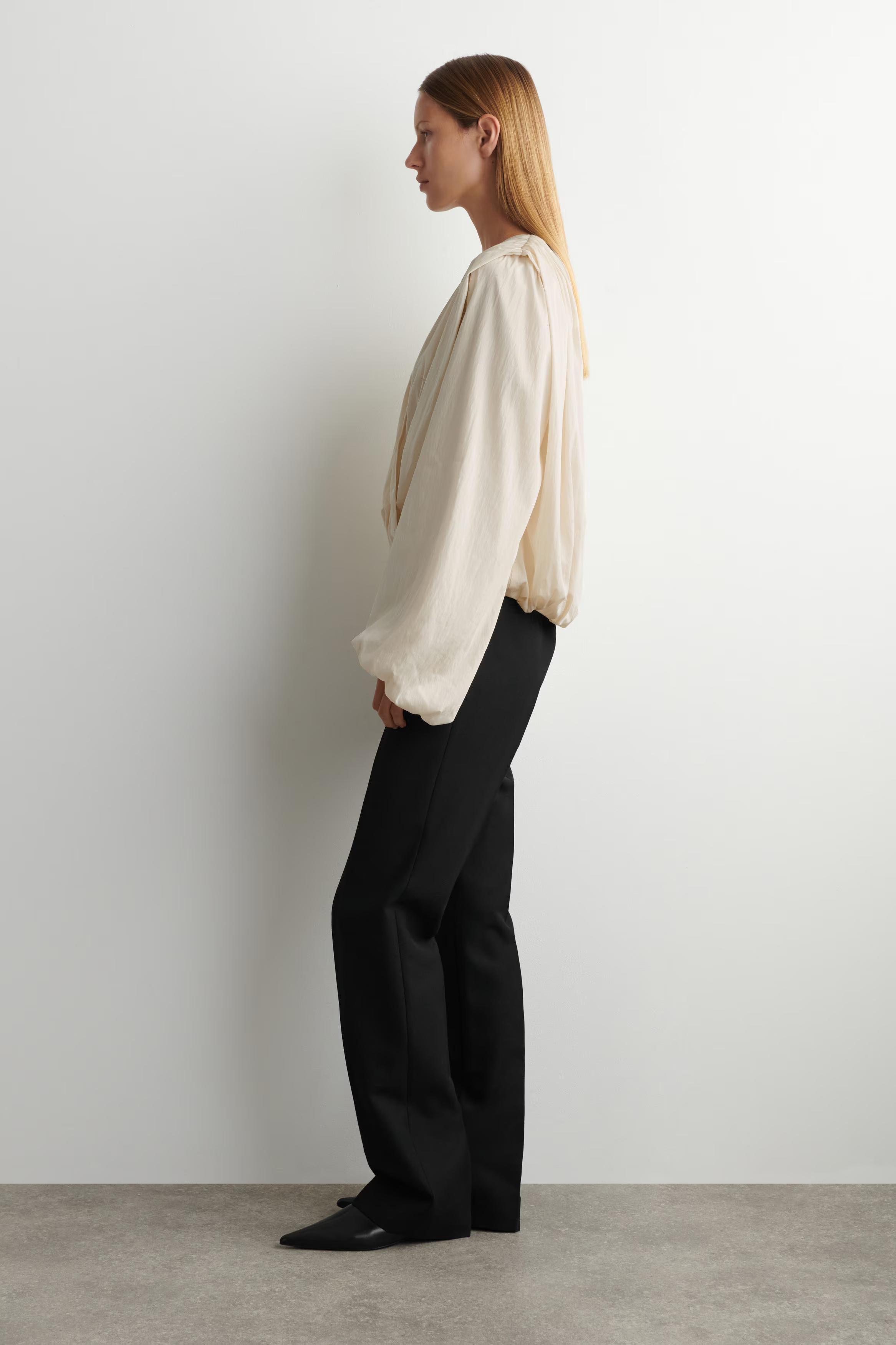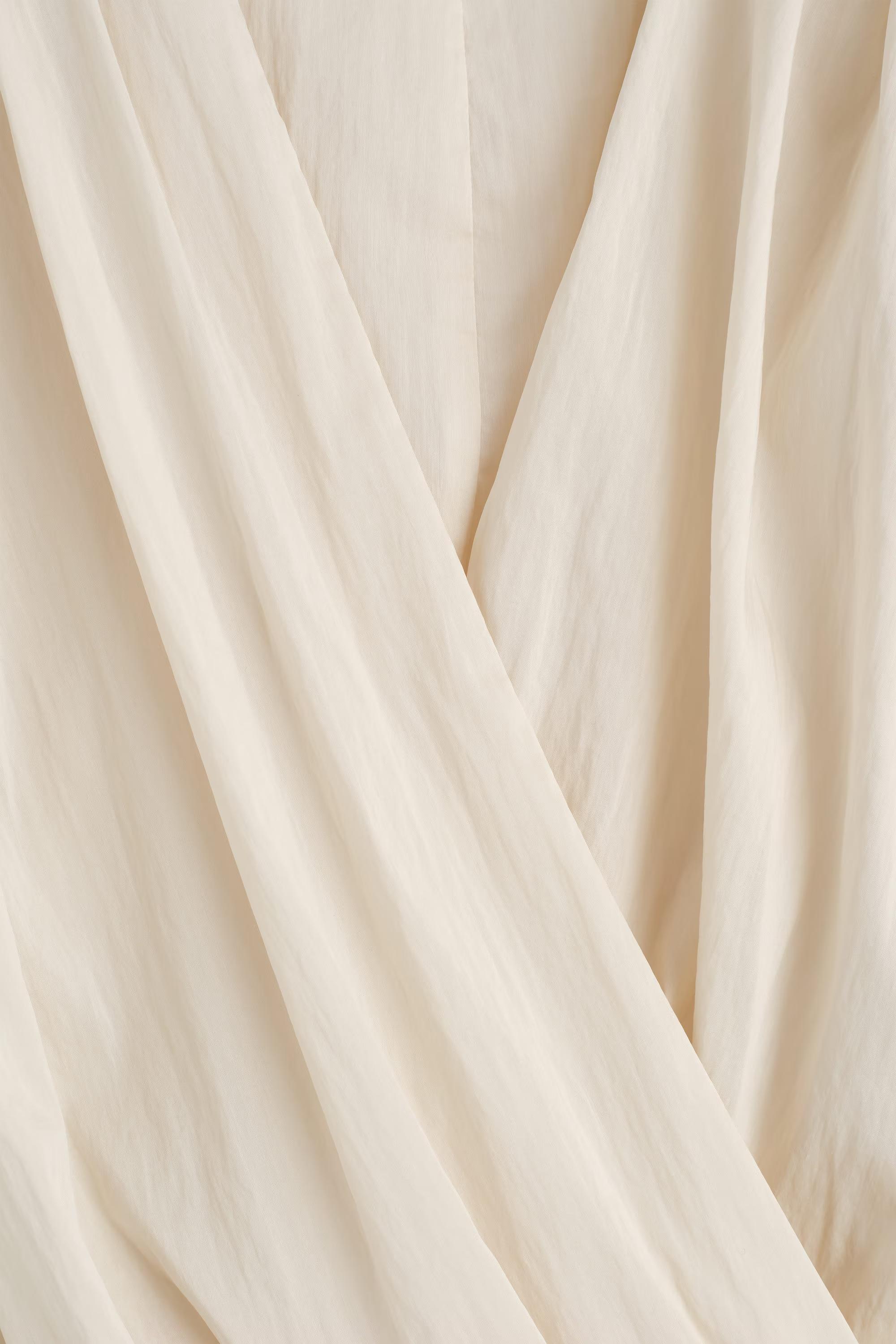 This season's eveningwear collection is distilled through elegant silhouettes and a considered colour palette. Offered in subdued ecru, this blouse is made from delicate layers of organza that twist into a wrap-over shape and detailed with soft shoulders, elasticated puffed sleeves and a pleated hem.\u0026nbsp;Relaxed fitTENCEL\u0026trade; Lyocell is a regenerated wood-based fibre made from wood pulp. It is produced in a closed-loop process where chemicals are reused\u0026nbsp;Shell: 82% TENCEL\u0026trade; Lyocell, 18% Recycled polyamide (Recycled nylon). Excluding trims / Machine wash\u0026nbsp;Back length of size S is 60.8cm / Model wears a size S