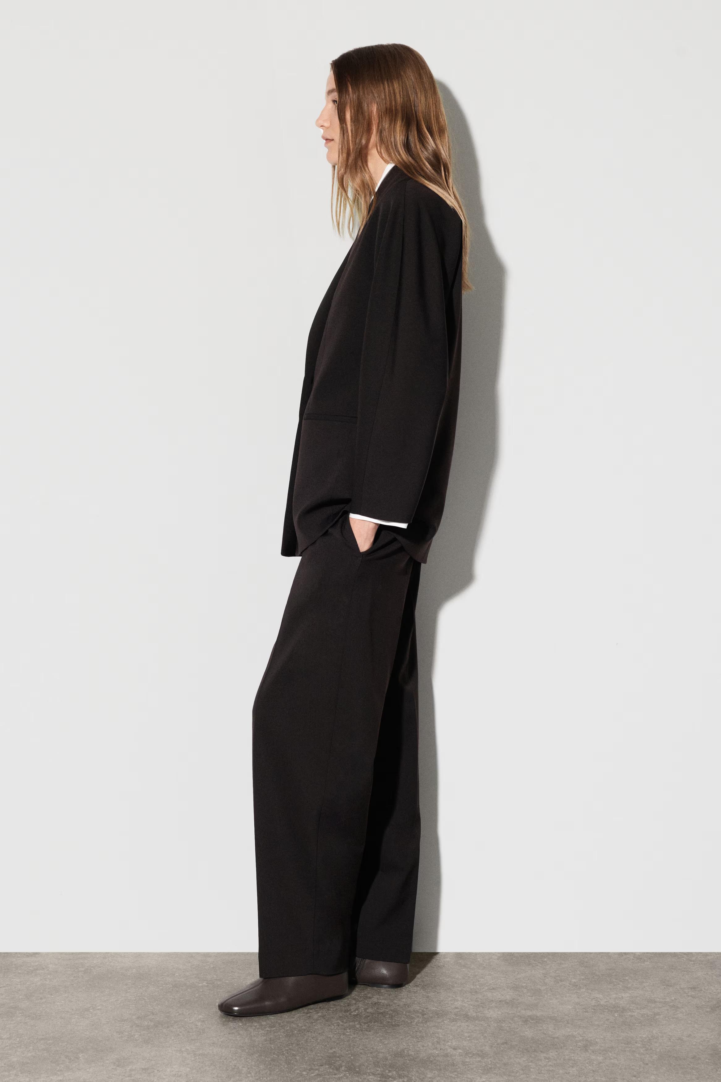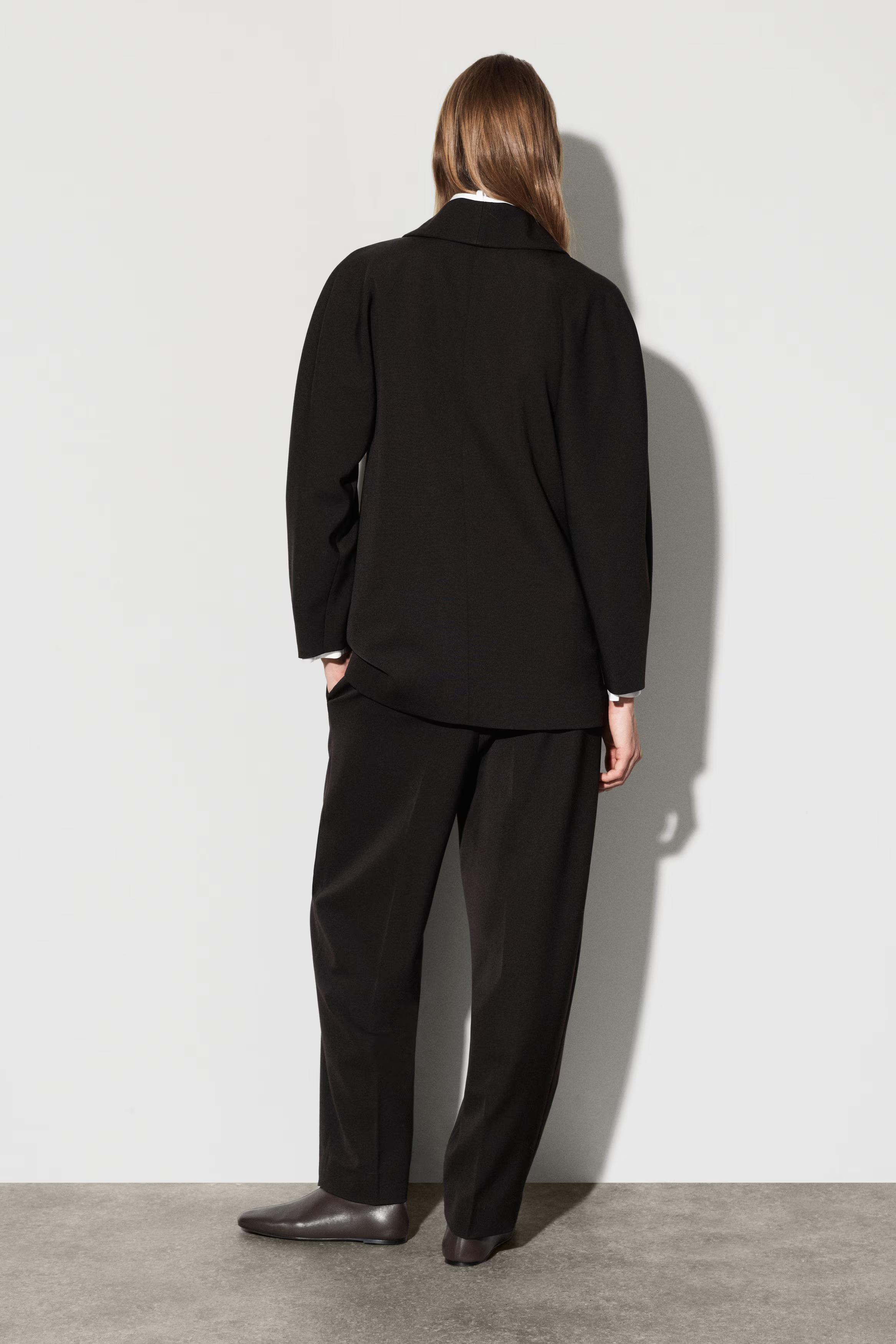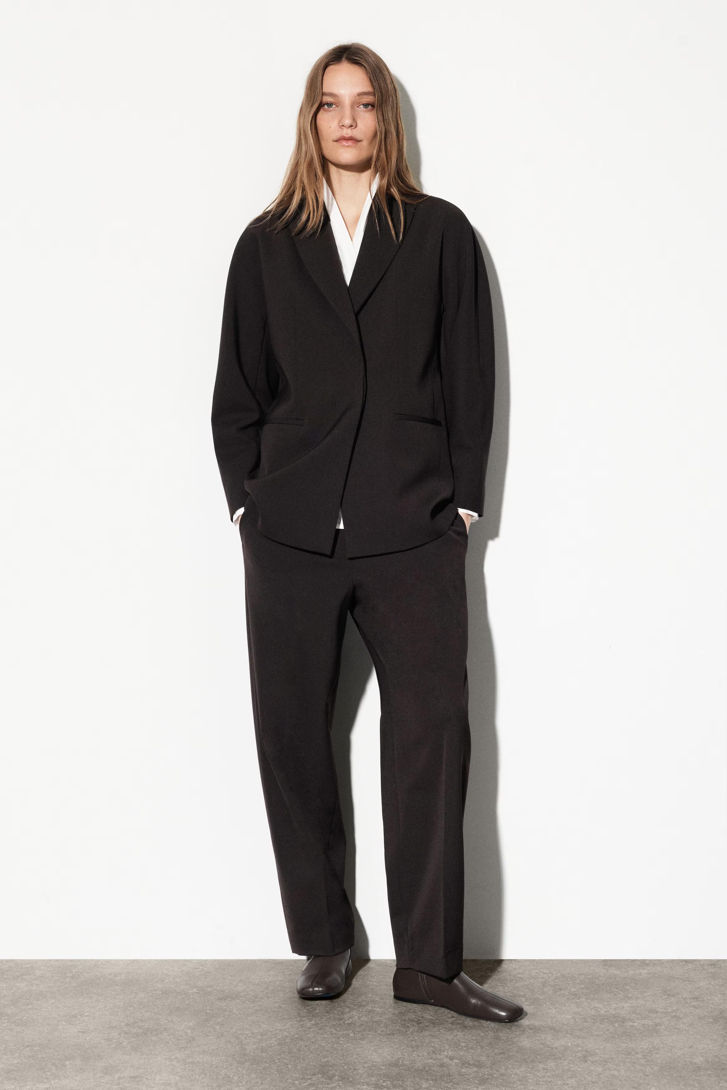 This season, the womenswear team reimagine the classic blazer with '80s undertones. Rendered in a rich espresso tone, this piece is crafted from an RWS wool blend and features an enveloping shawl collar, shaped darts and welt pockets. Style it as a suit with the matching trousers.\u0026nbsp;Regular fitButton closureThis product contains Responsible Wool Standard TE-00047206 (RWS) wool fibre from farms certified to animal welfare and land-management requirements\u0026nbsp;Shell: 53% Recycled polyester, 43% RWS Wool, 4% Elastane. Lining: 100% Viscose. Excluding trims / Dry clean\u0026nbsp;Back length of size EU 36 is 72.7cm / Model wears a size EU 36\u0026nbsp;