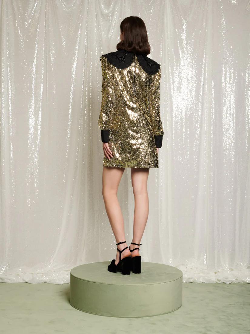 The Gold Diamonds Mini Dress sparkles like a disco daydream, with silver and gold sequins forming a kaleidoscope of light. A ribbon-tied embellished collar adds the sweetest finishing touch. Exclusively available on Sister Jane.