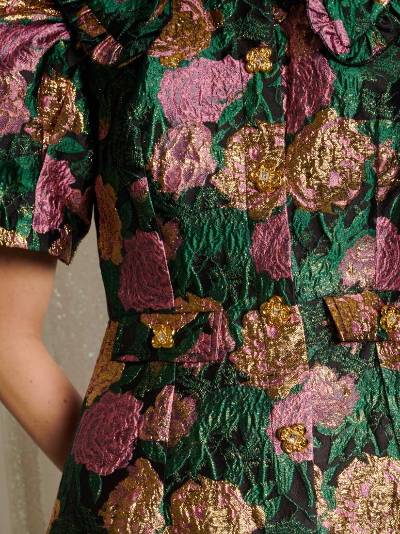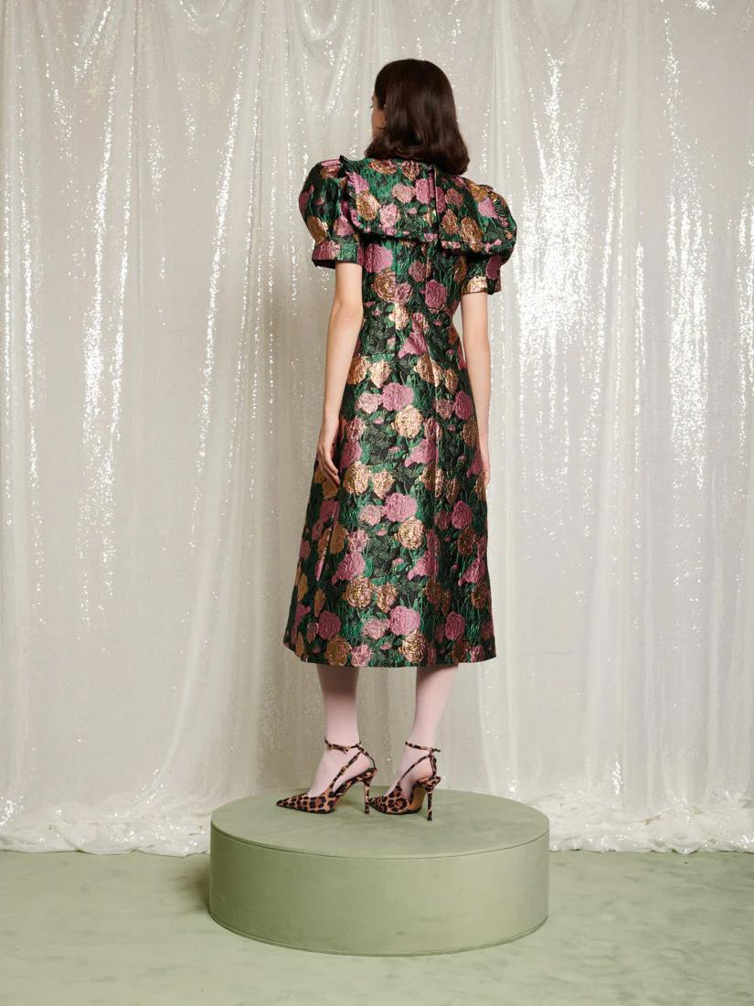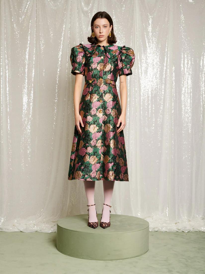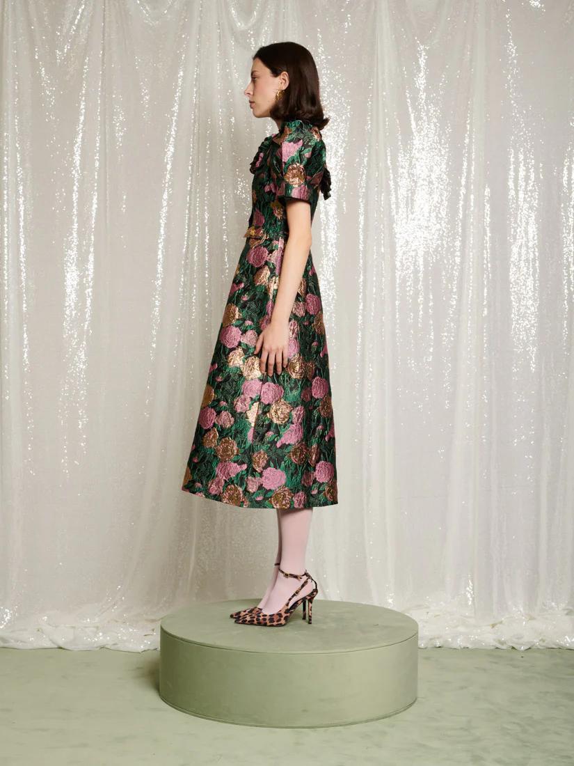 Whispering florals and golden glimmers weave through the Enchanted Jacquard Midi Dress. With its ruffled collar and dreamy buttons, it’s pure storybook glamour. Exclusively available on Sister Jane.