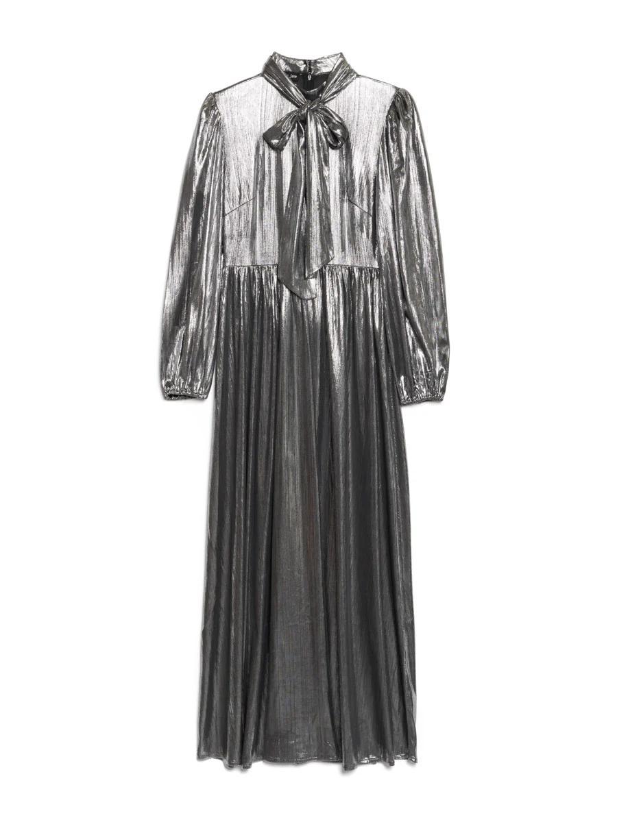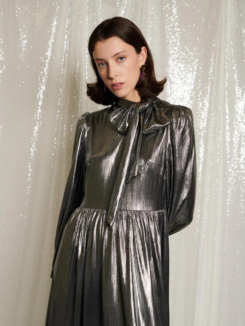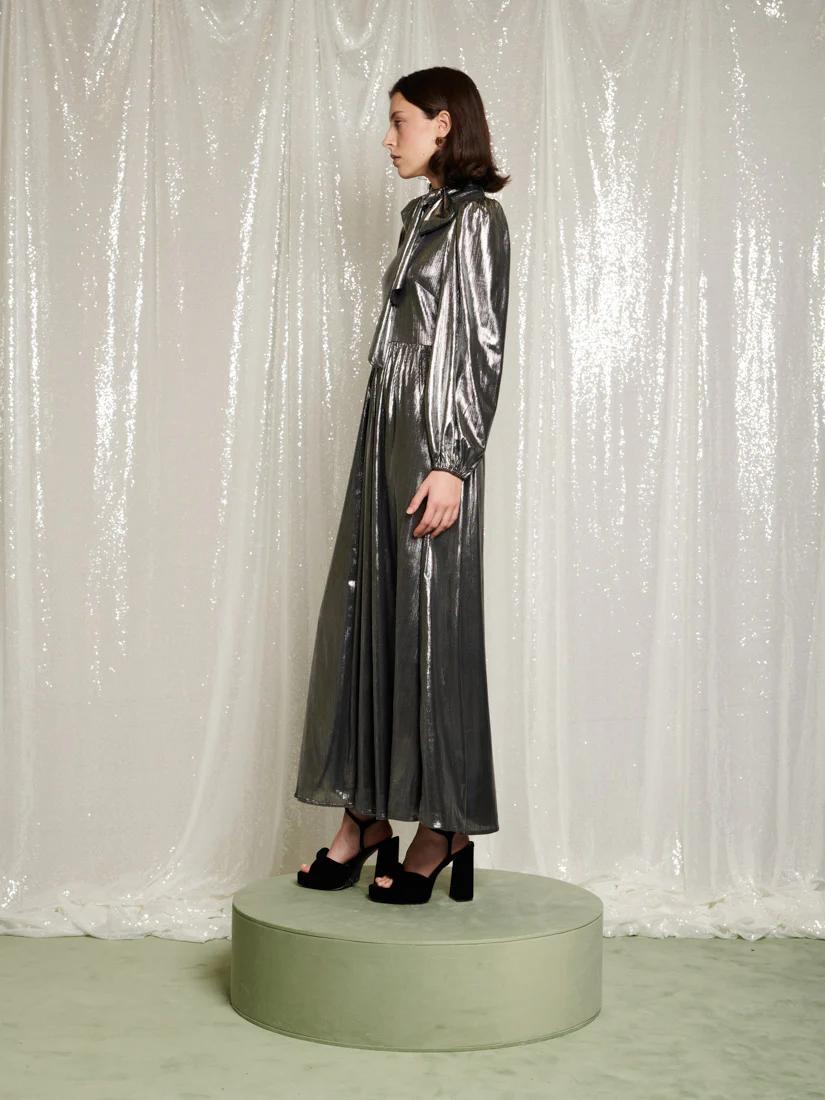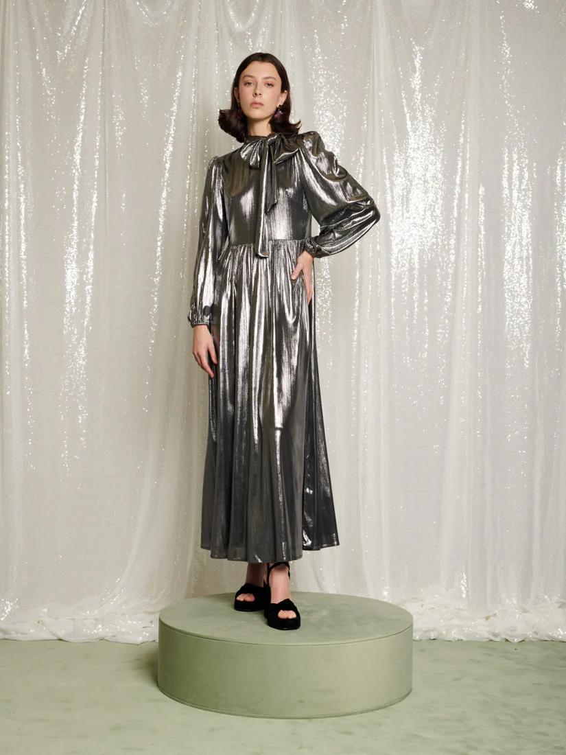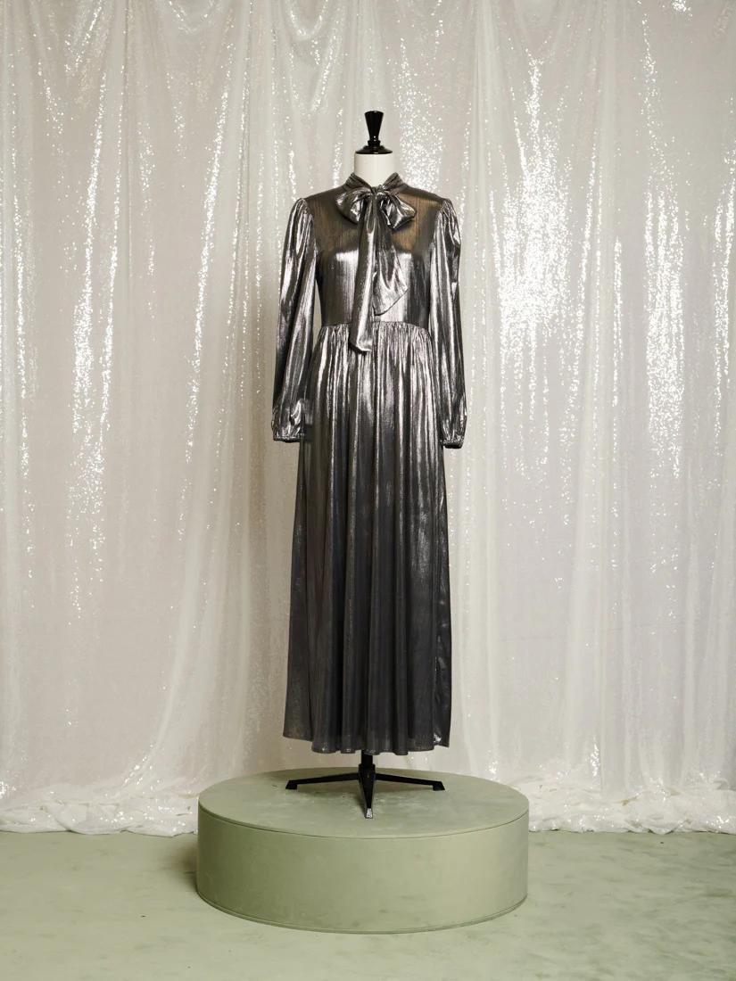 The Disco Darling Lame Maxi Dress gleams under every mirrorball, its silver fabric catching sparks of midnight light. A gathered skirt makes it made for movement and magic. Exclusively available on Sister Jane.