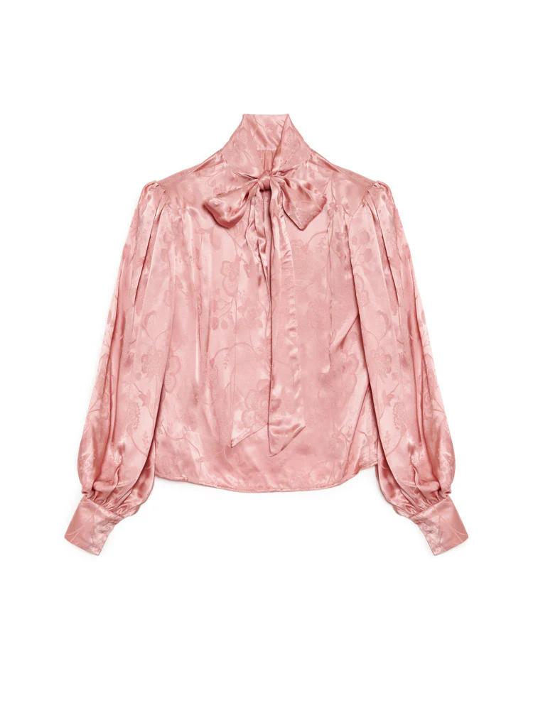 Time slows in satin, this jacquard blouse catches the light like liquid gold. The bow at the neck ties up secrets of the stage, where femininity shines fierce and untouchable. Pair with the Satine Velvet Trousers for seamless texture.