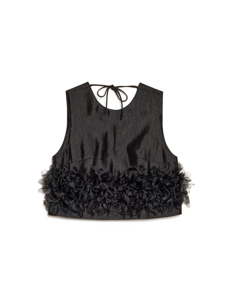 The Plume Top is a cropped delight, with layered organza flowers on the hem. An open back with a bow tie fastening ensures the spotlight hits you both in the back and front. Pair with the Plume Organza Mini Skirt for added drama
