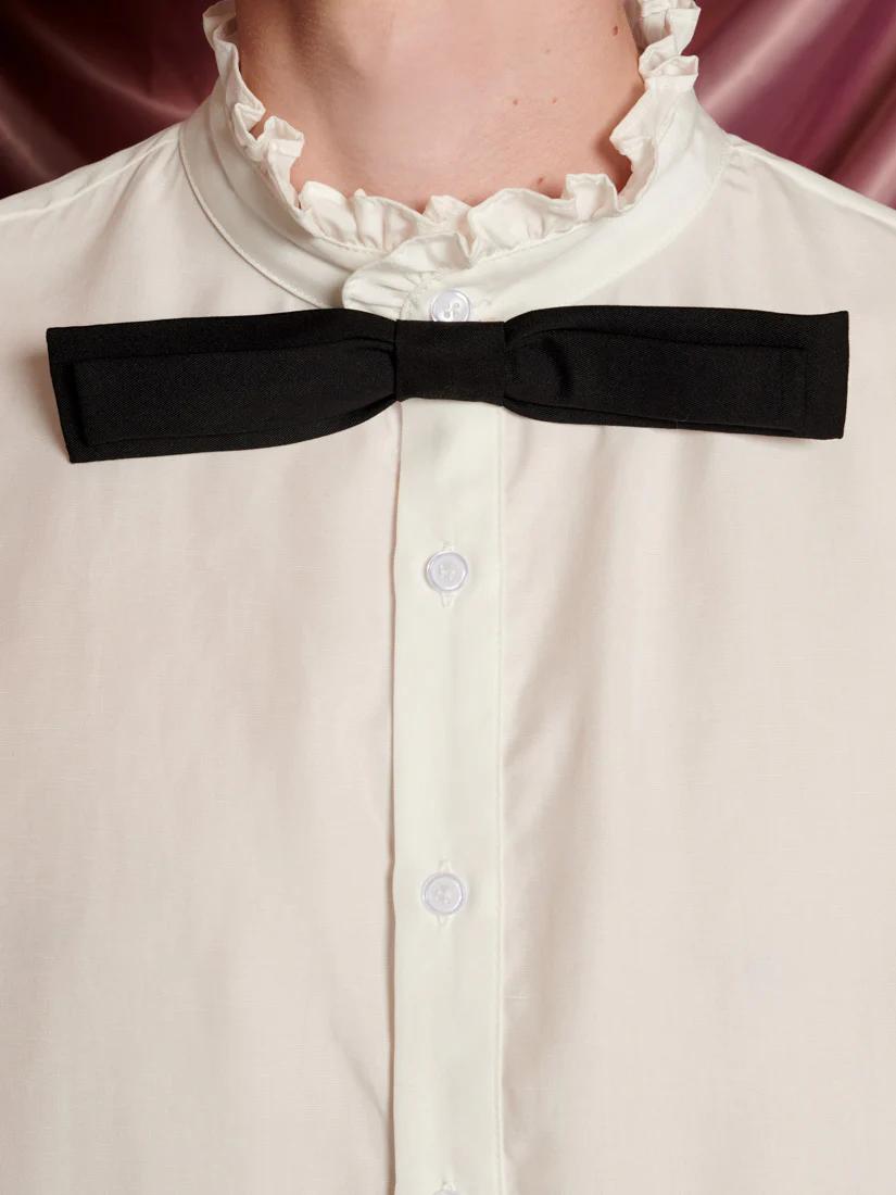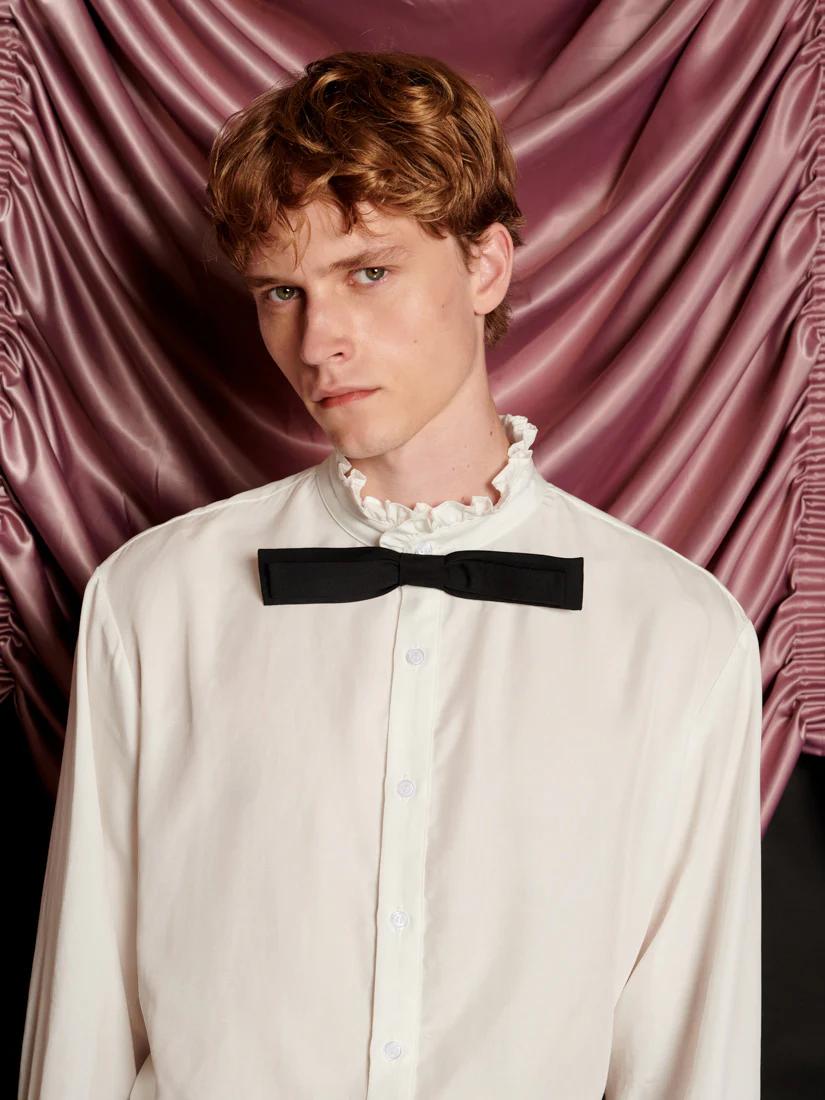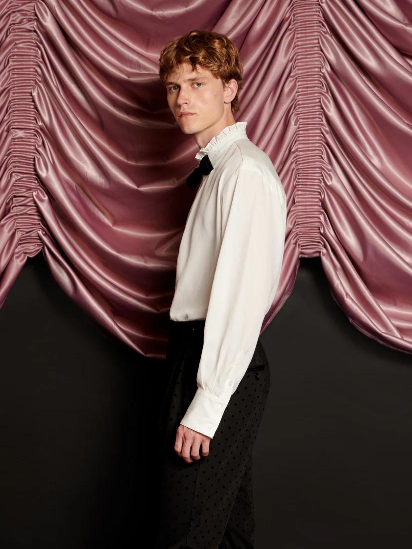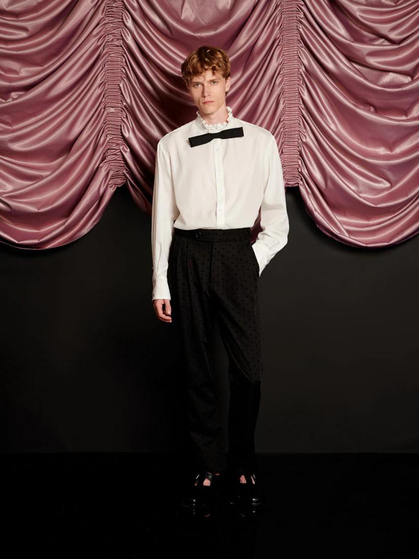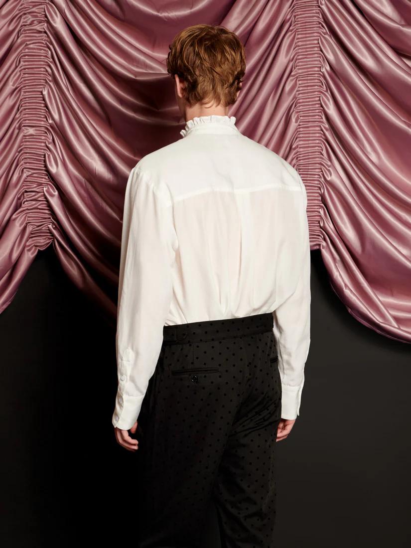 The Duke Shirt is all about drama, with a ruffle neckline and an exaggerated removable bow. Collarless and carefree, it’s a piece made for the life of a showgirl. Effortlessly pair the shirt with the Frankie Polka Dot Tailored Trousers.