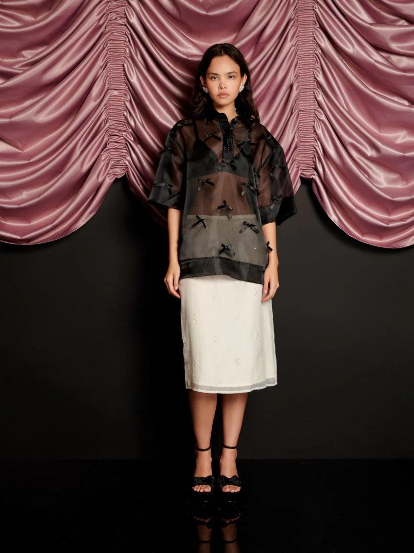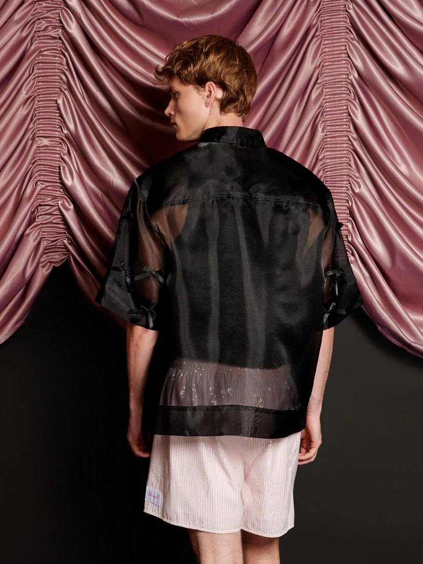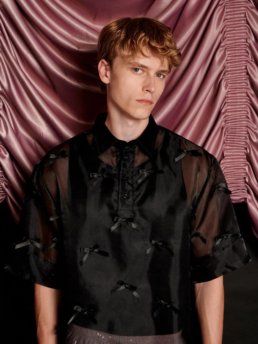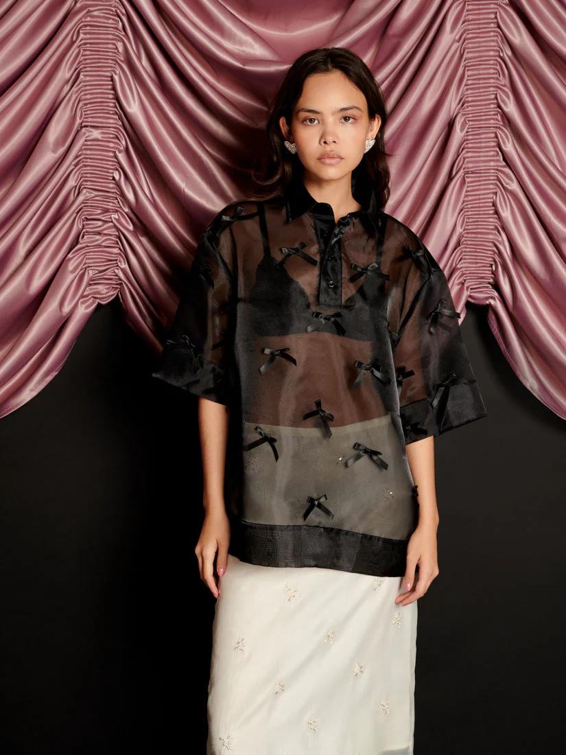 The Blaise Bows Polo Shirt transforms organza into a sheer canvas for satin bows. A playful twist on tailoring, it’s sheer showgirl magic. Pair with the Rowan Sequin Stripe Shorts to complete the magical spell.