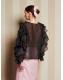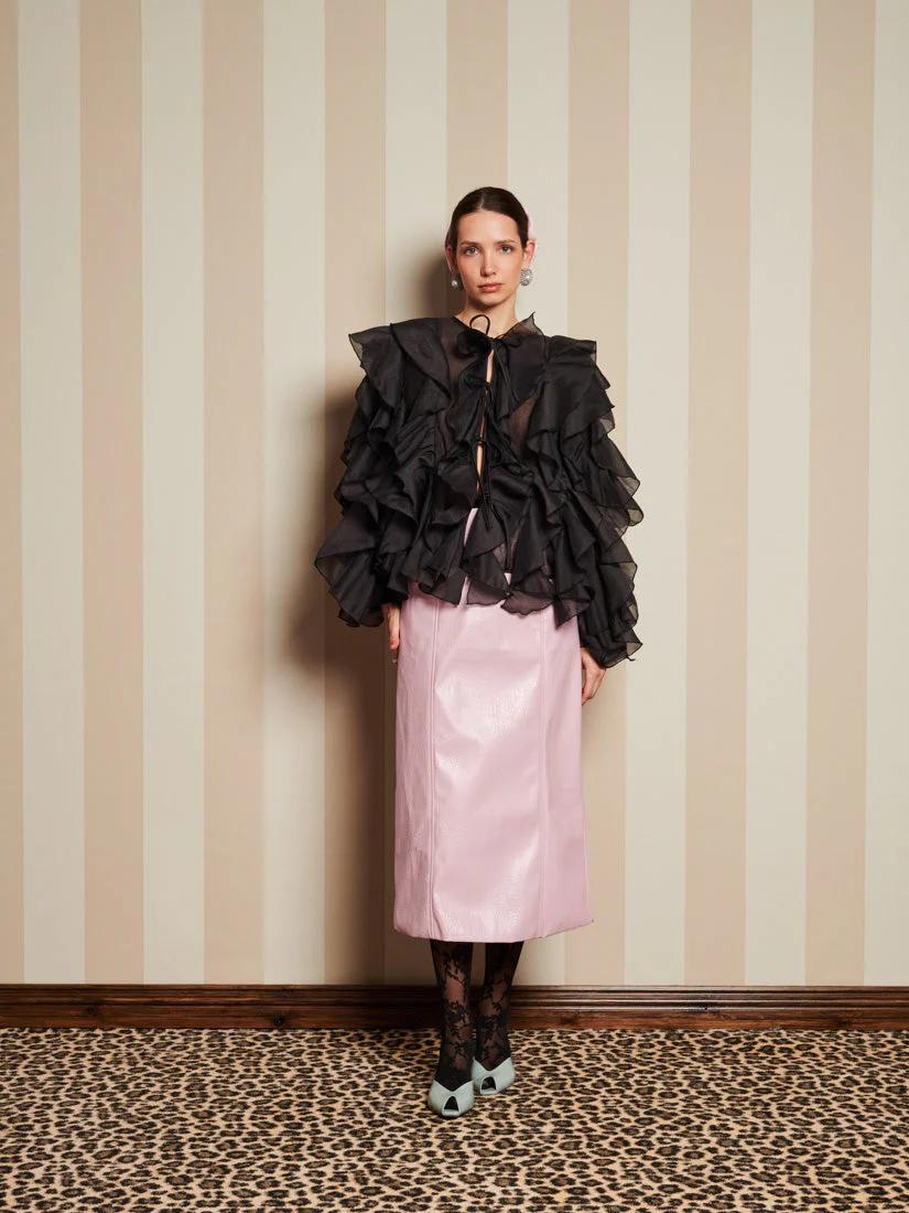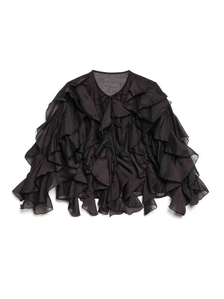 Cloaked in all-over ruffles and delicate ties, as whimsical and gentle as afternoon light drifting through lace curtains. The Romance Ties Blouse moves with a tender grace, each gathered detail echoing the softness of memory Style with the Rose-Spun PU Midi Skirt for the perfect match