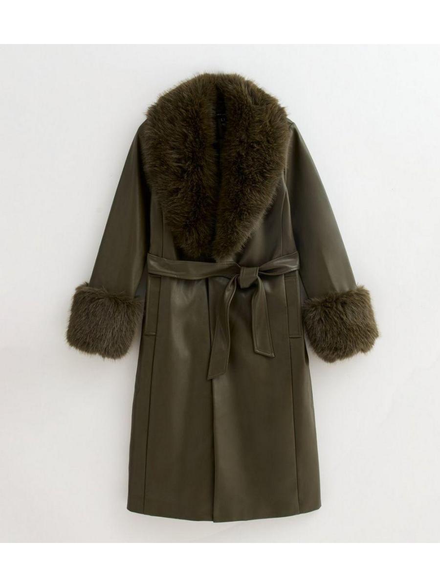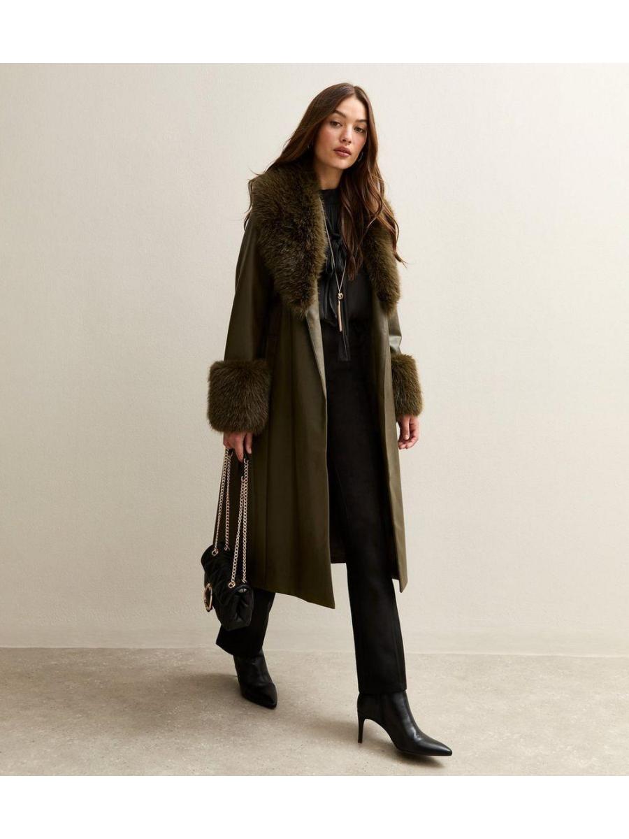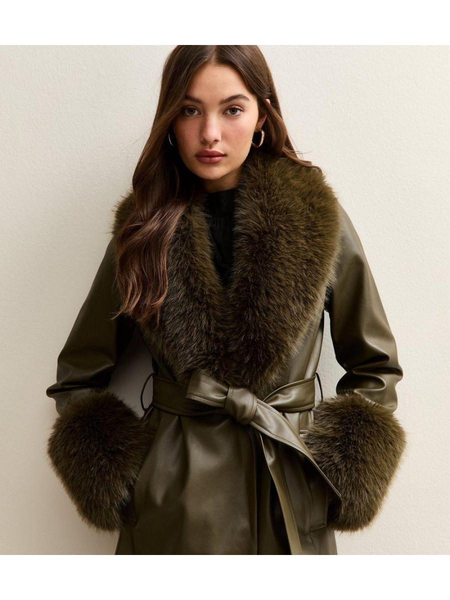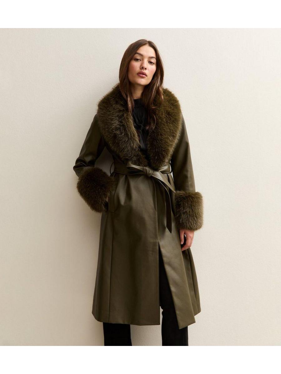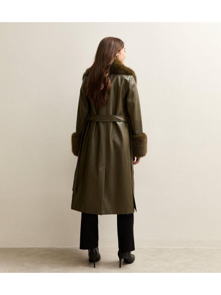 Khaki Faux Leather Faux Fur Trim Longline Jacket
