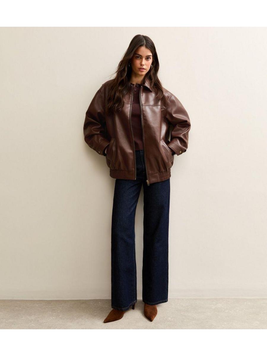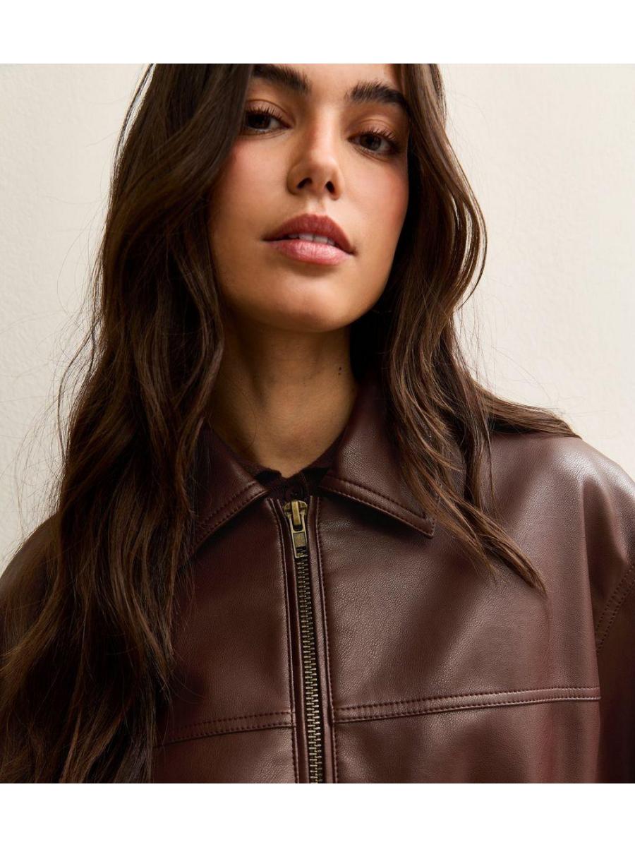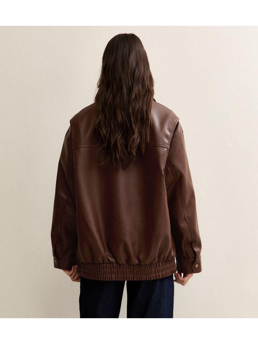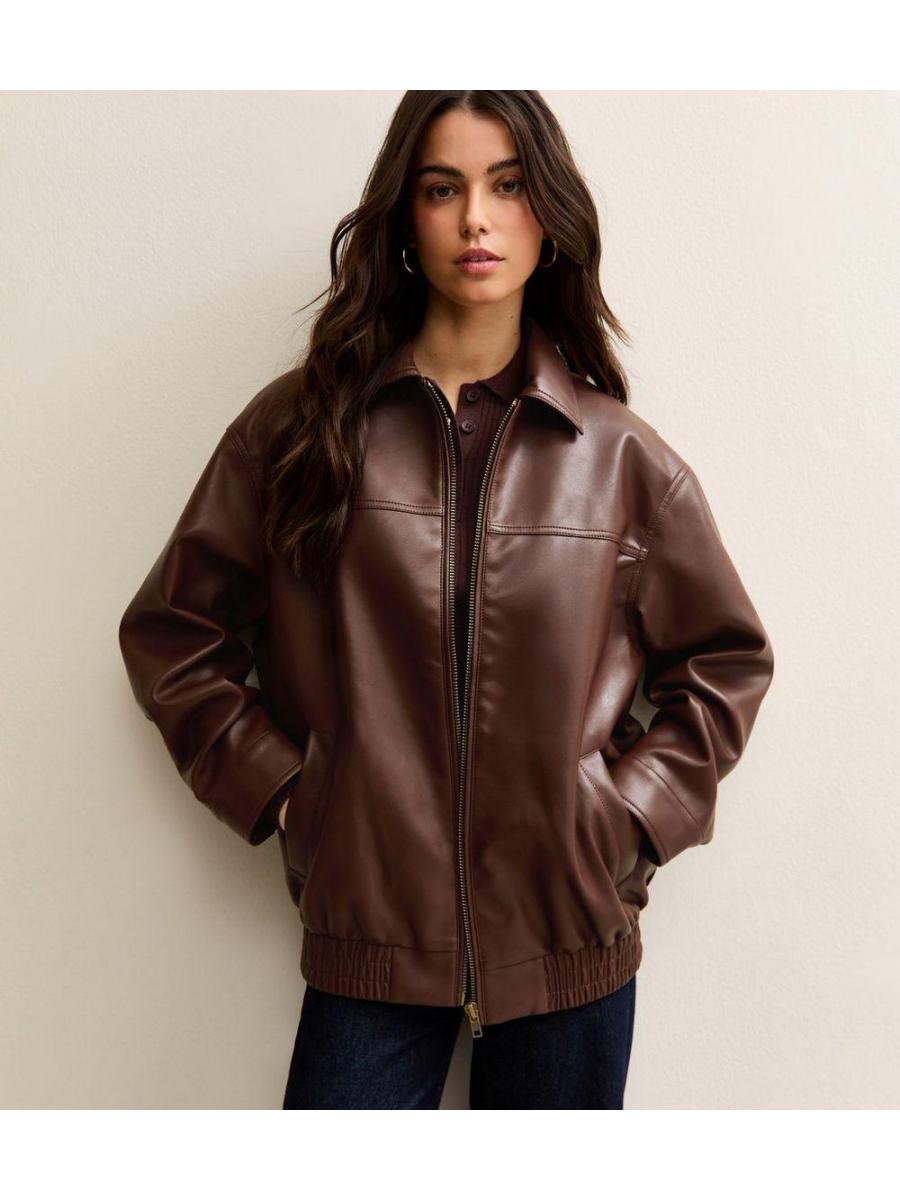 Dark Brown Faux Leather Oversized Bomber Jacket