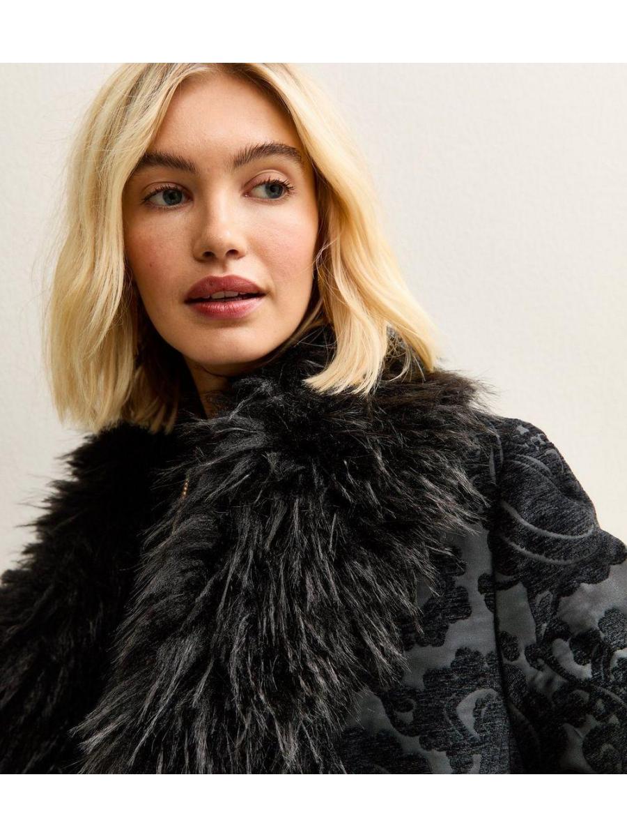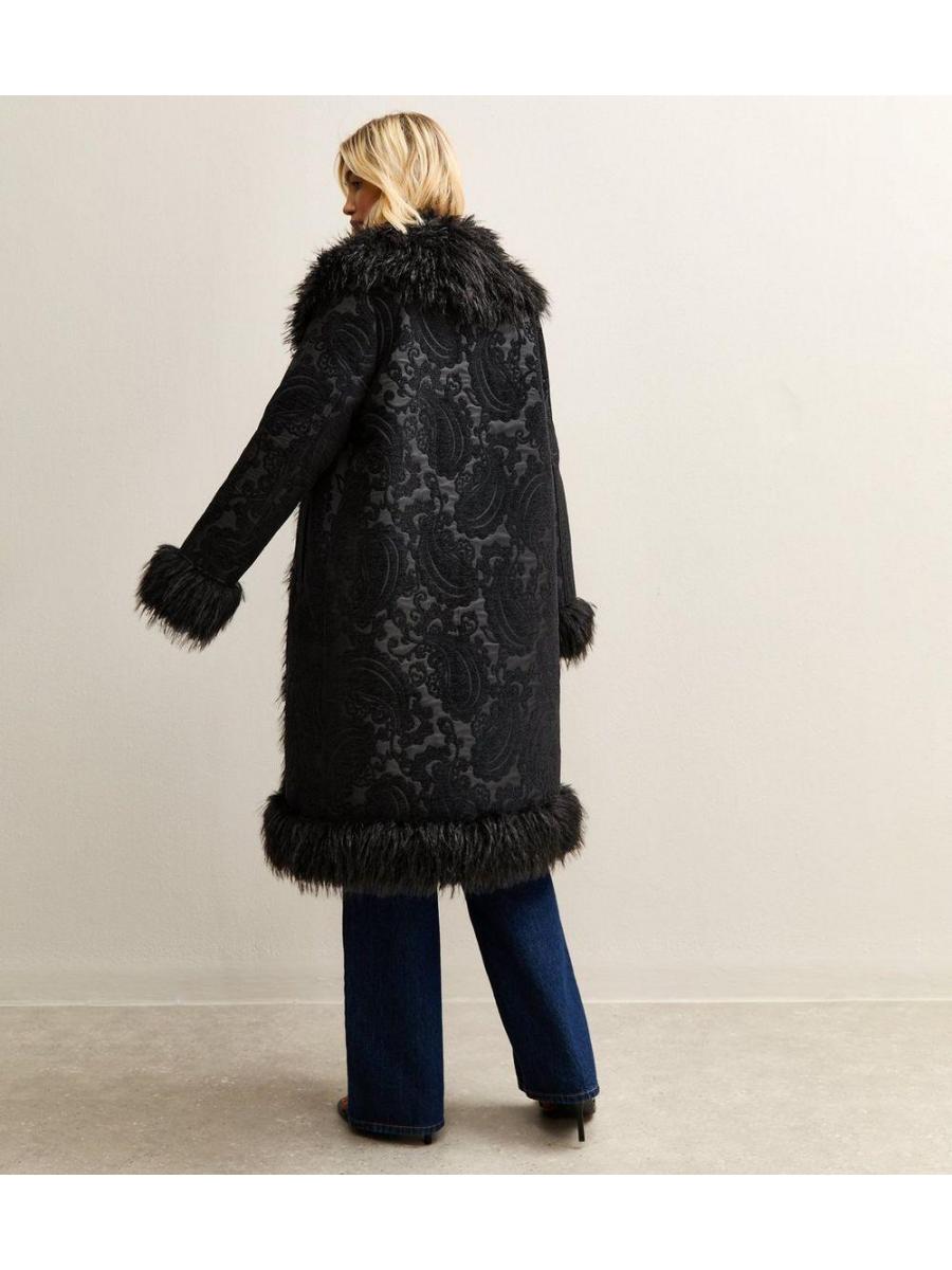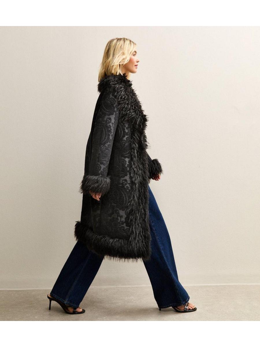 Black Floral Texture Faux Fur Trim Coat