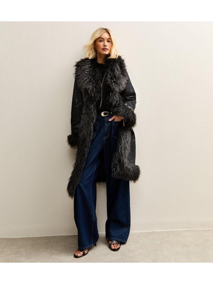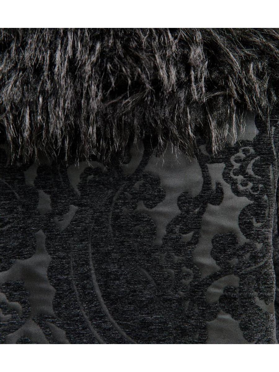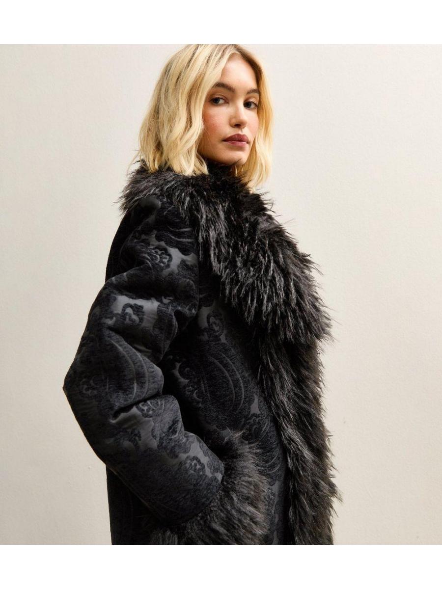 Black Floral Texture Faux Fur Trim Coat