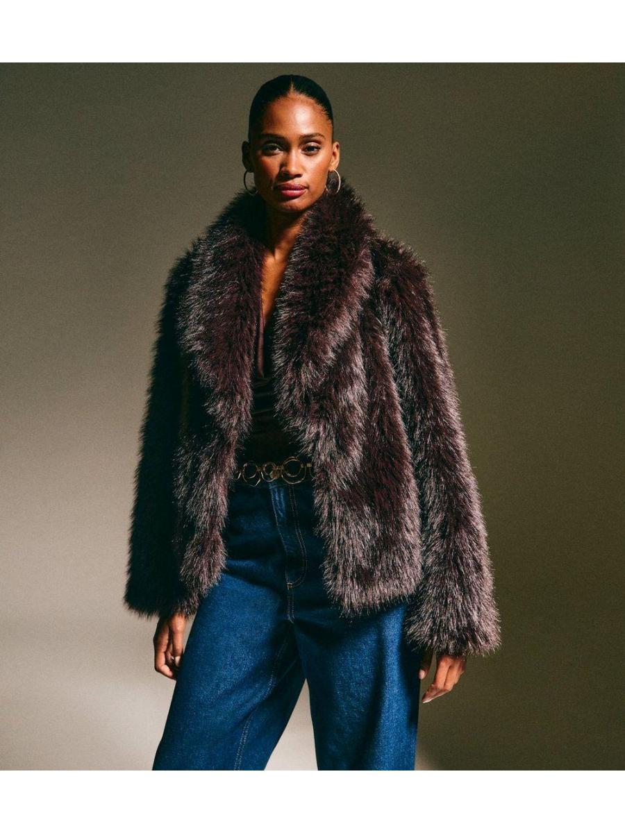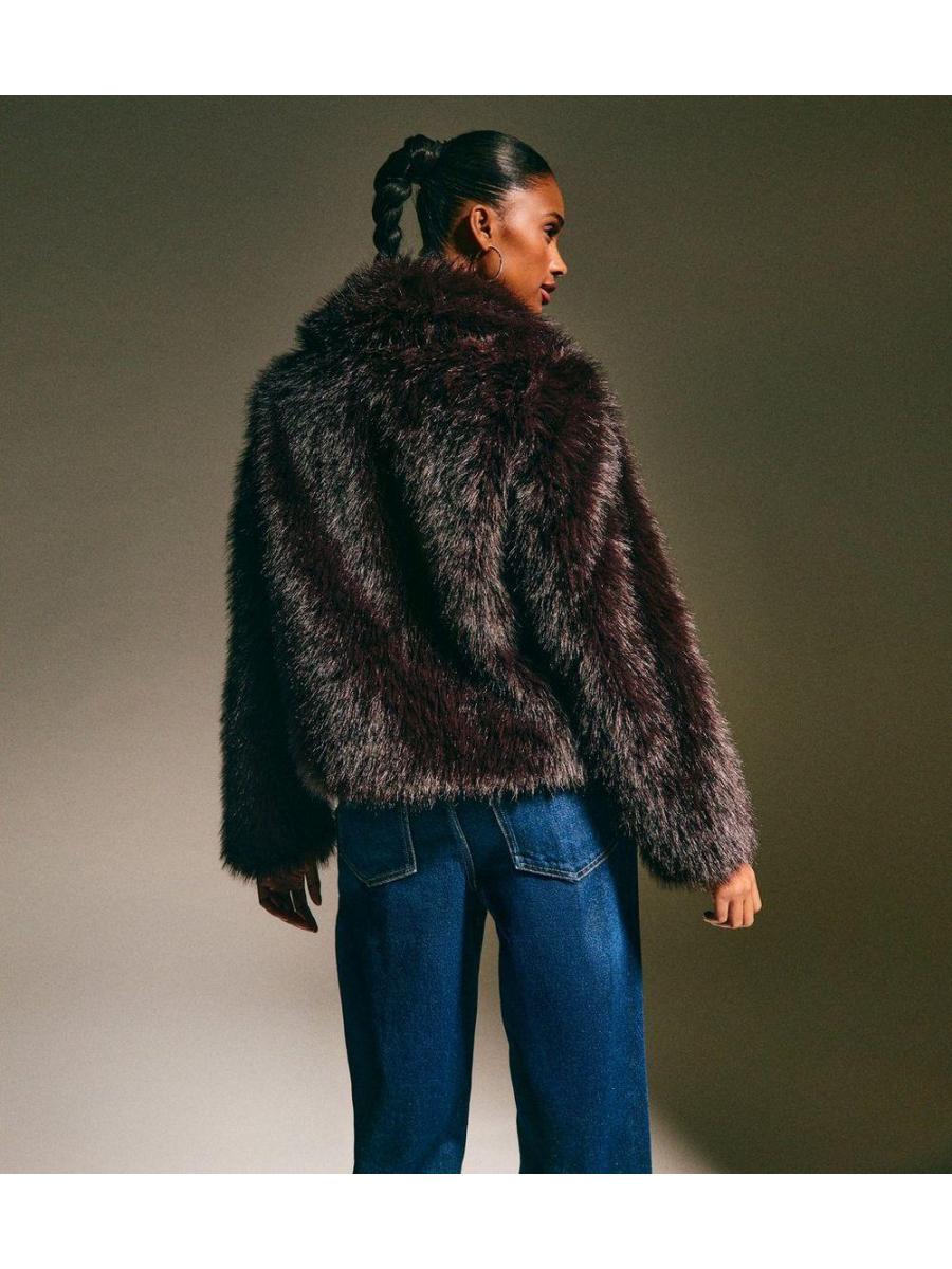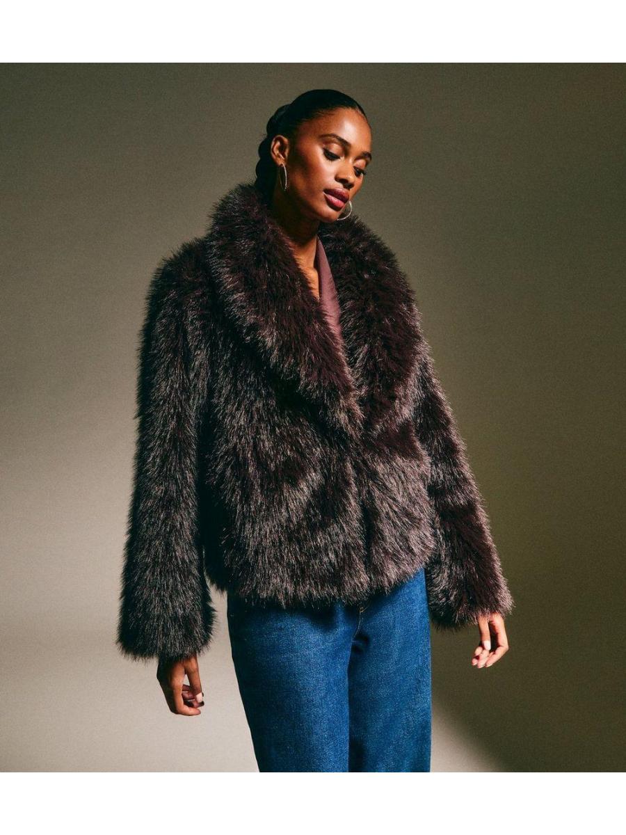 Dark Brown Faux Fur Shawl Collar Coat