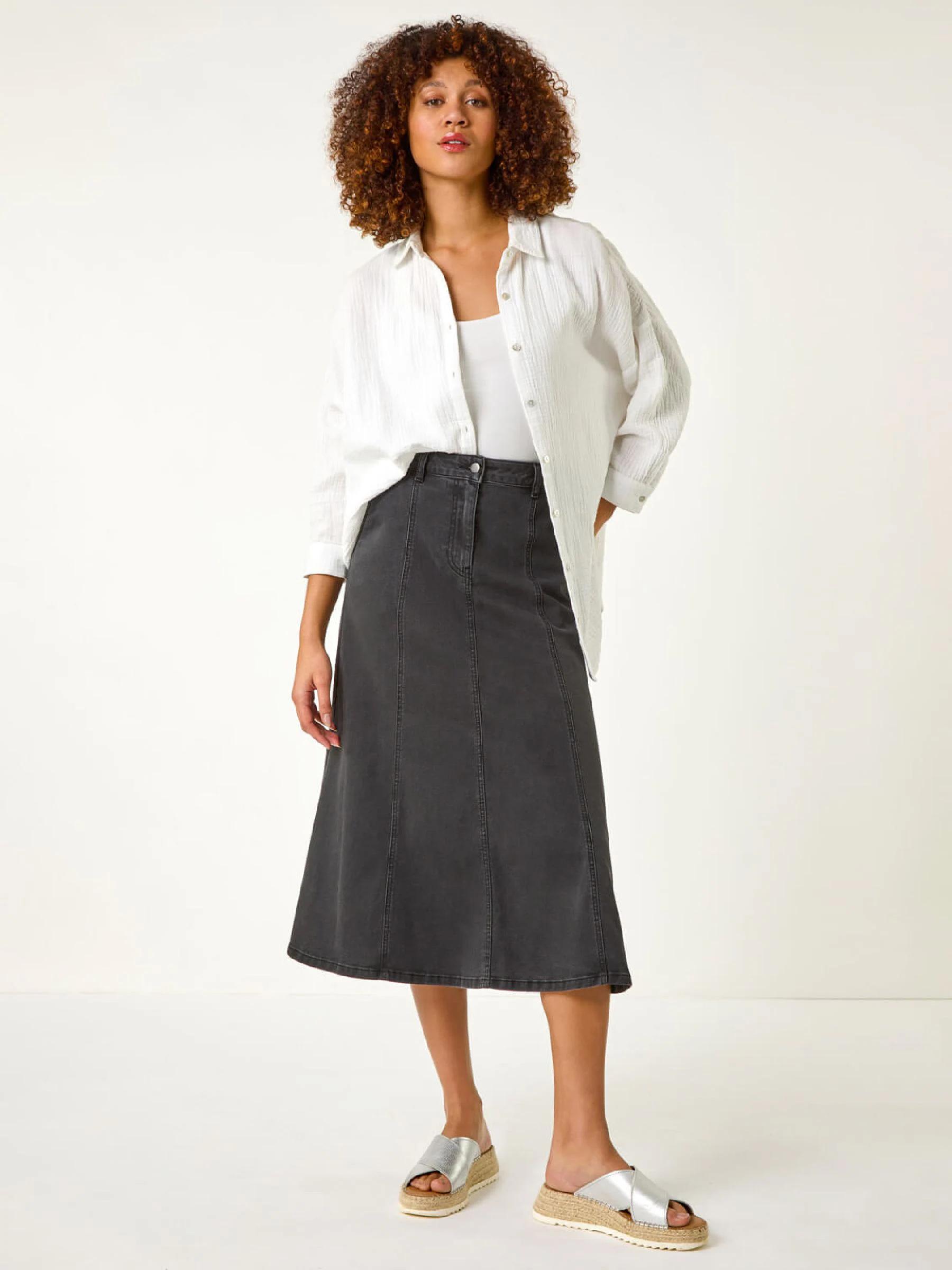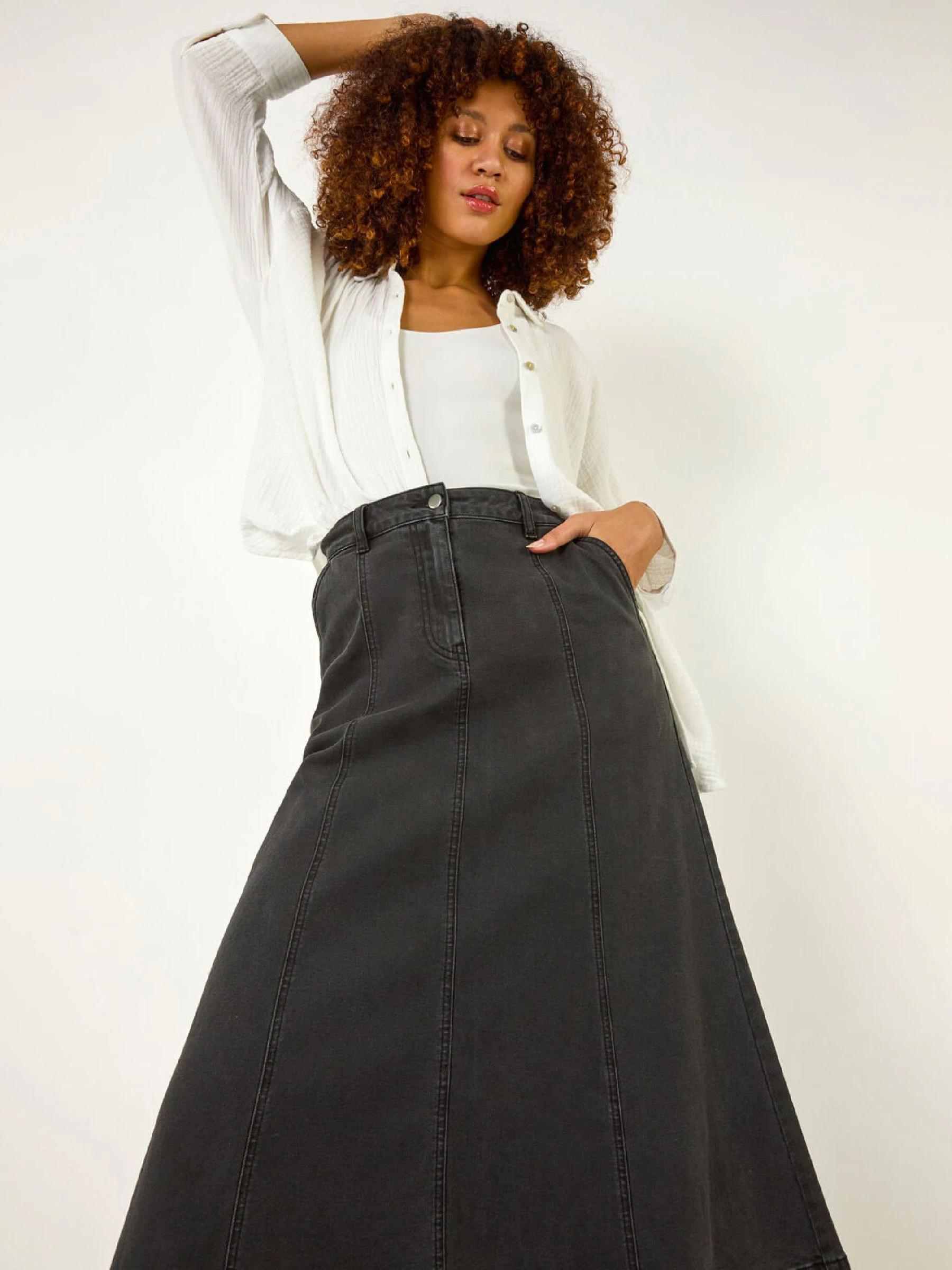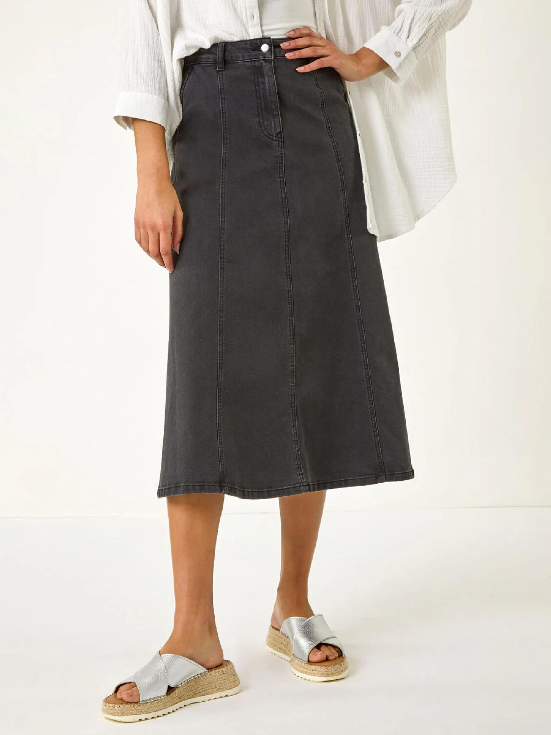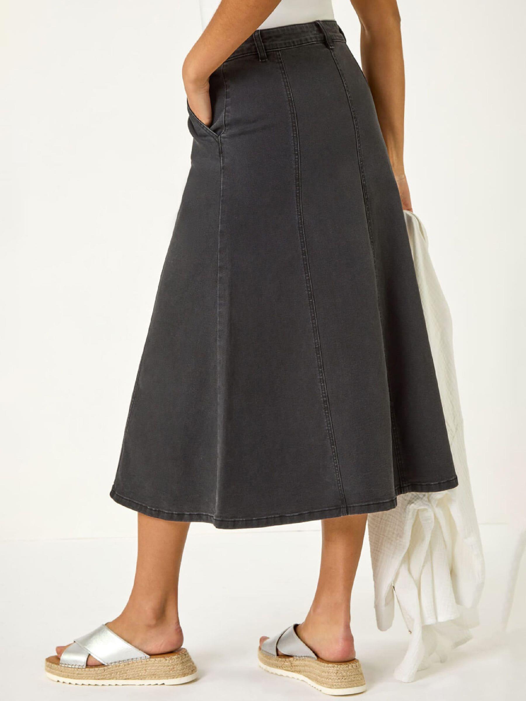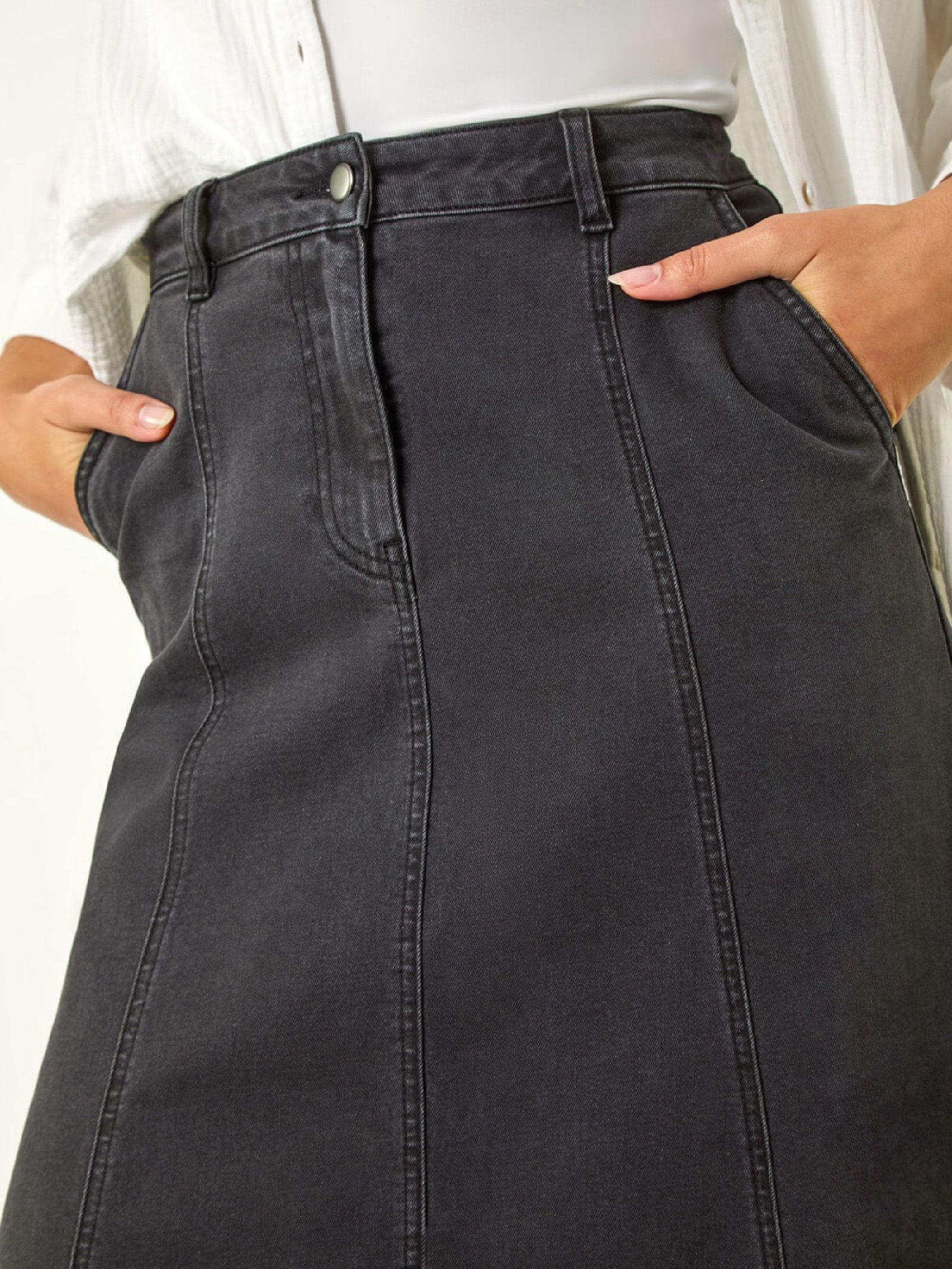Roman Black Cotton Denim Panelled Midi Skirt