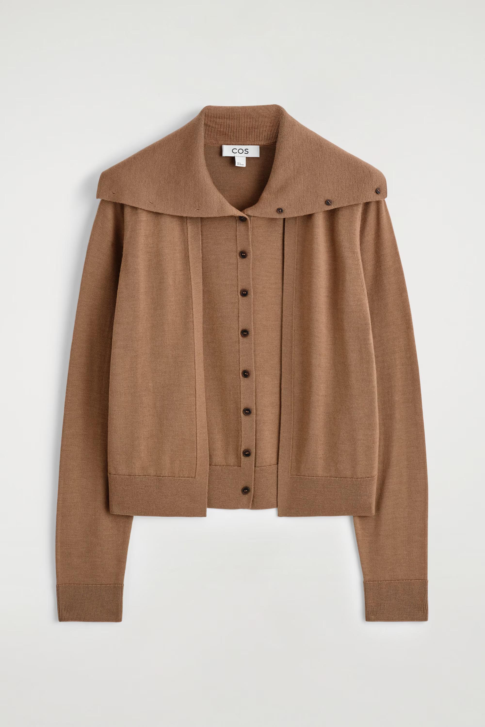 Layering is a key tenet of the autumn/winter wardrobe. This modern cardigan is knitted from fine merino wool and has a funnel-neck underlay that looks as though it's been effortlessly layered underneath. The high collar can be worn buttoned up or folded down over the shoulders.\u0026nbsp;Regular fitButton closureThis product contains Responsible Wool Standard TE-00047206 (RWS) wool fibre from farms certified to animal welfare and land-management requirements\u0026nbsp;Shell: 100% Merino wool. Excluding trims / Machine wash\u0026nbsp;Back length of size S is 53.5cm / Model wears a size S