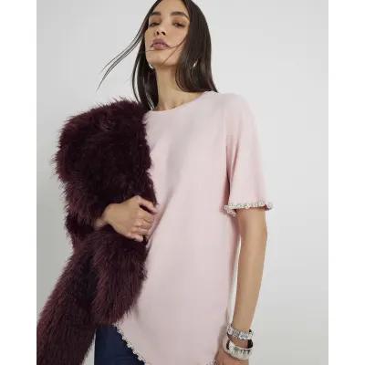 Pink Short Sleeve Curved Hem Diamante T-shirt