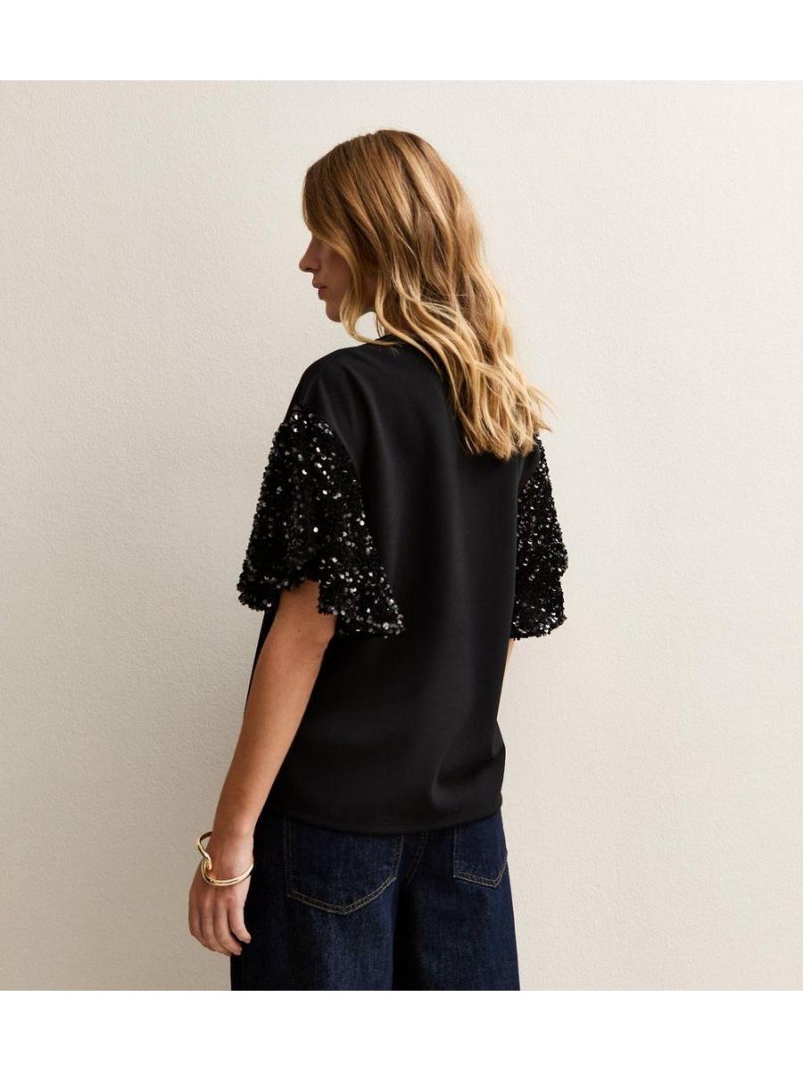 Black Sequin Sleeve Short Sleeve Top