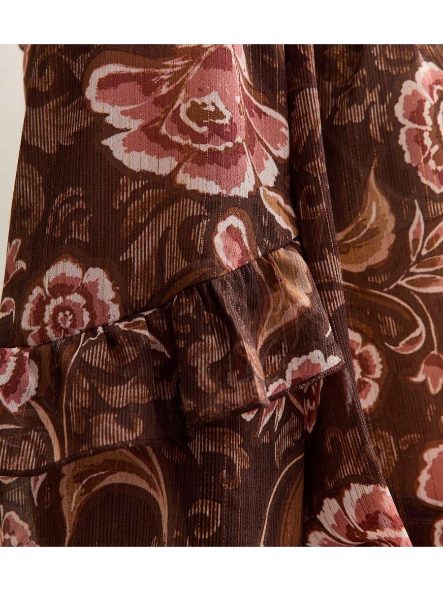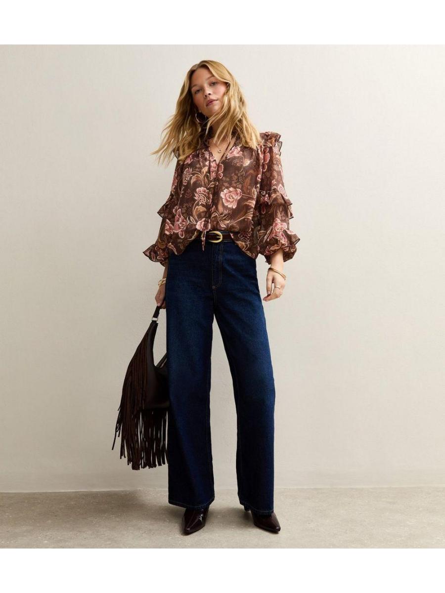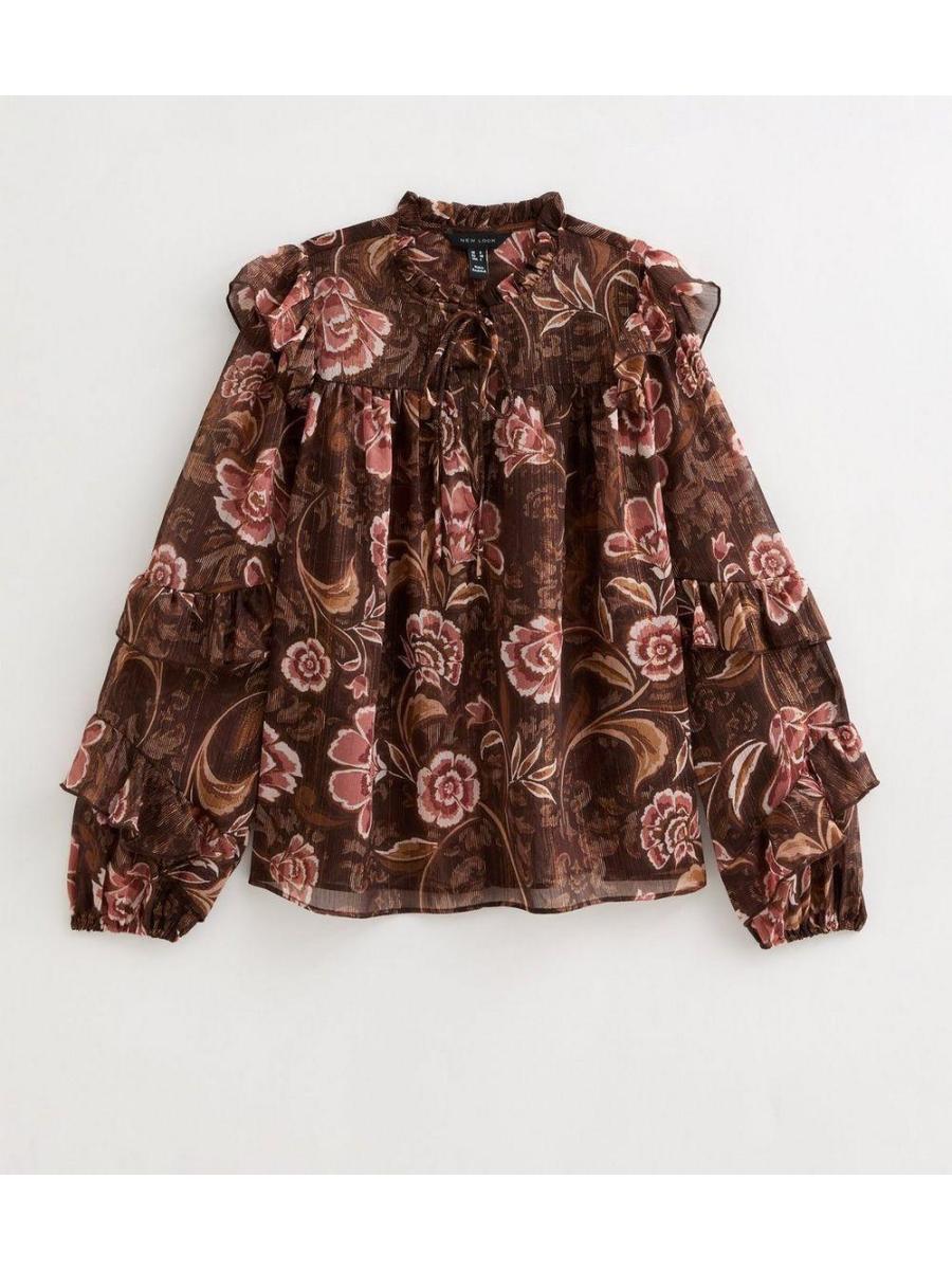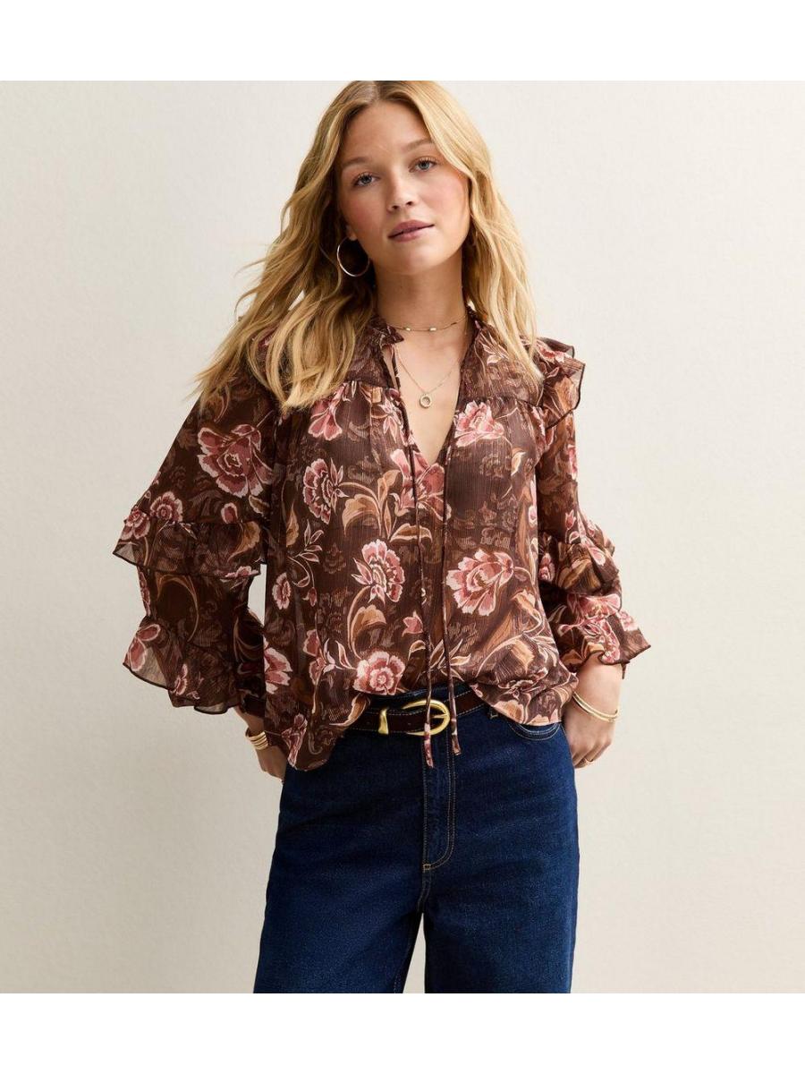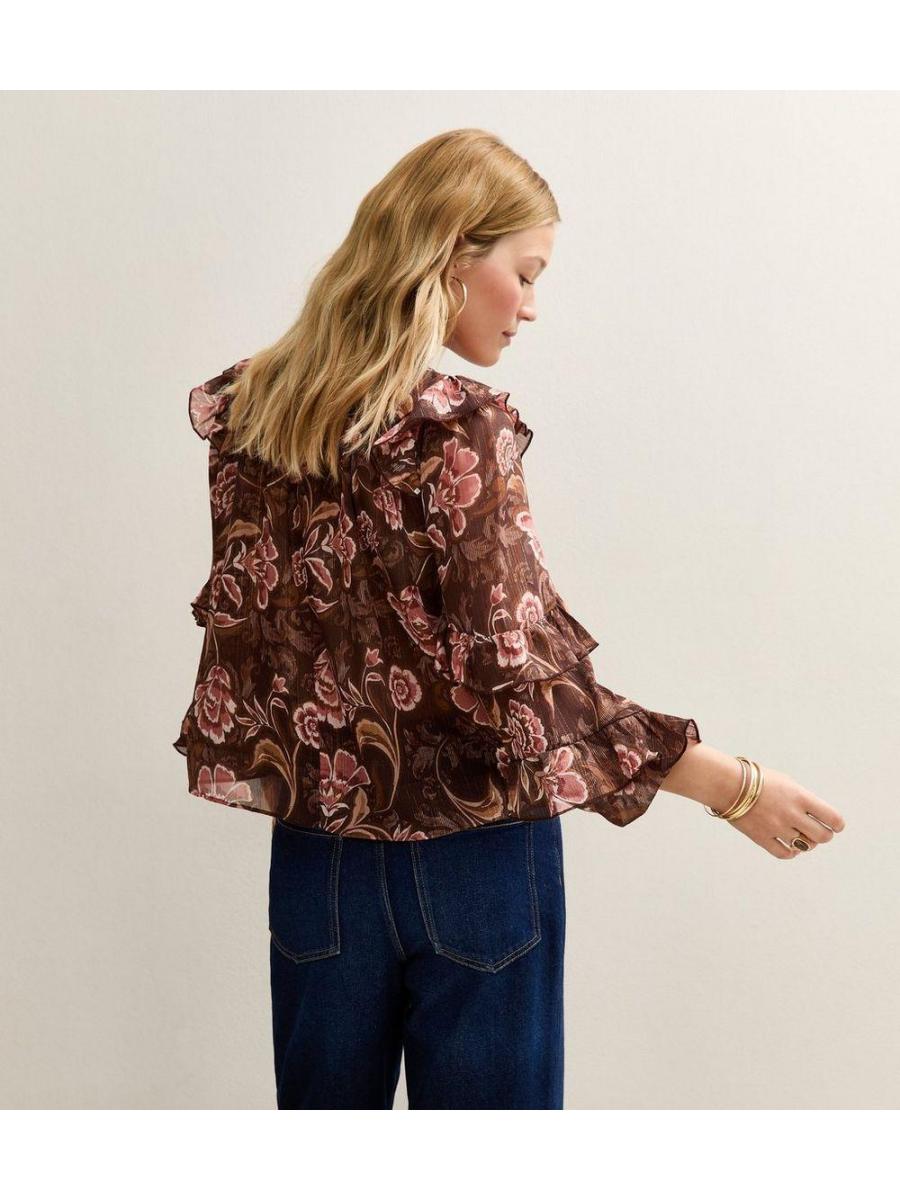 Brown Floral Frilly Flared Sleeve Blouse