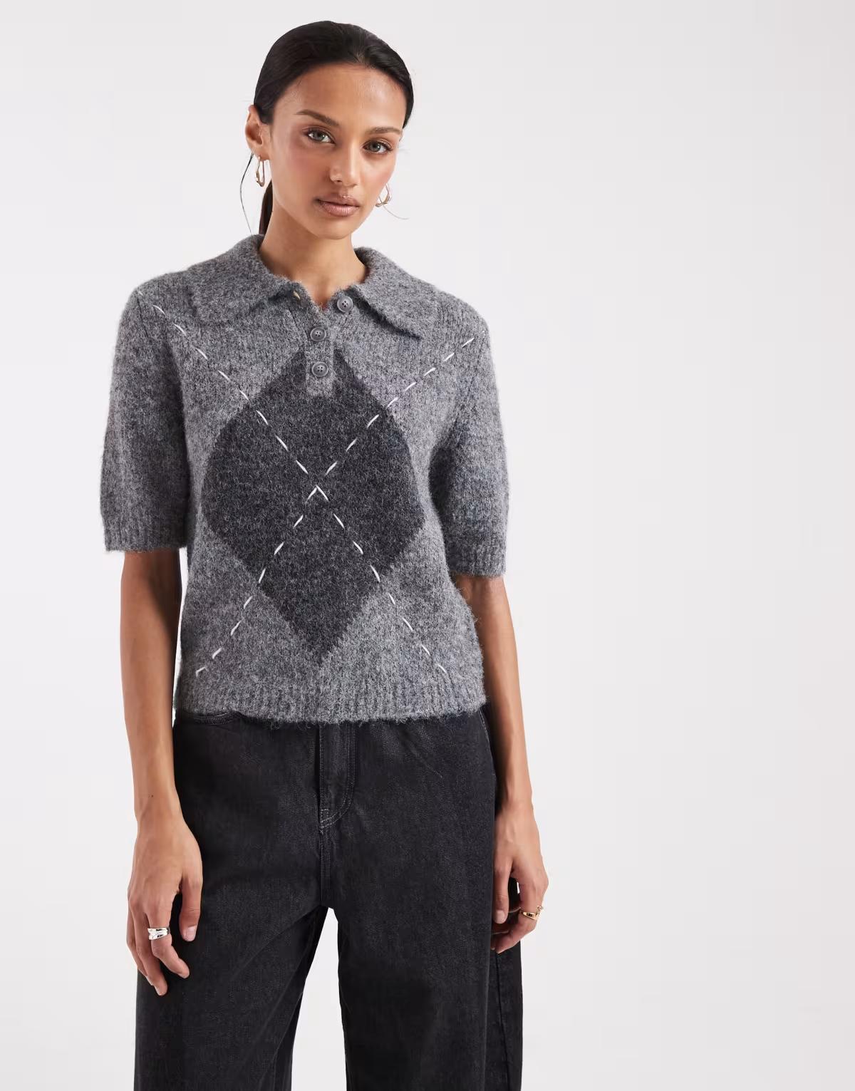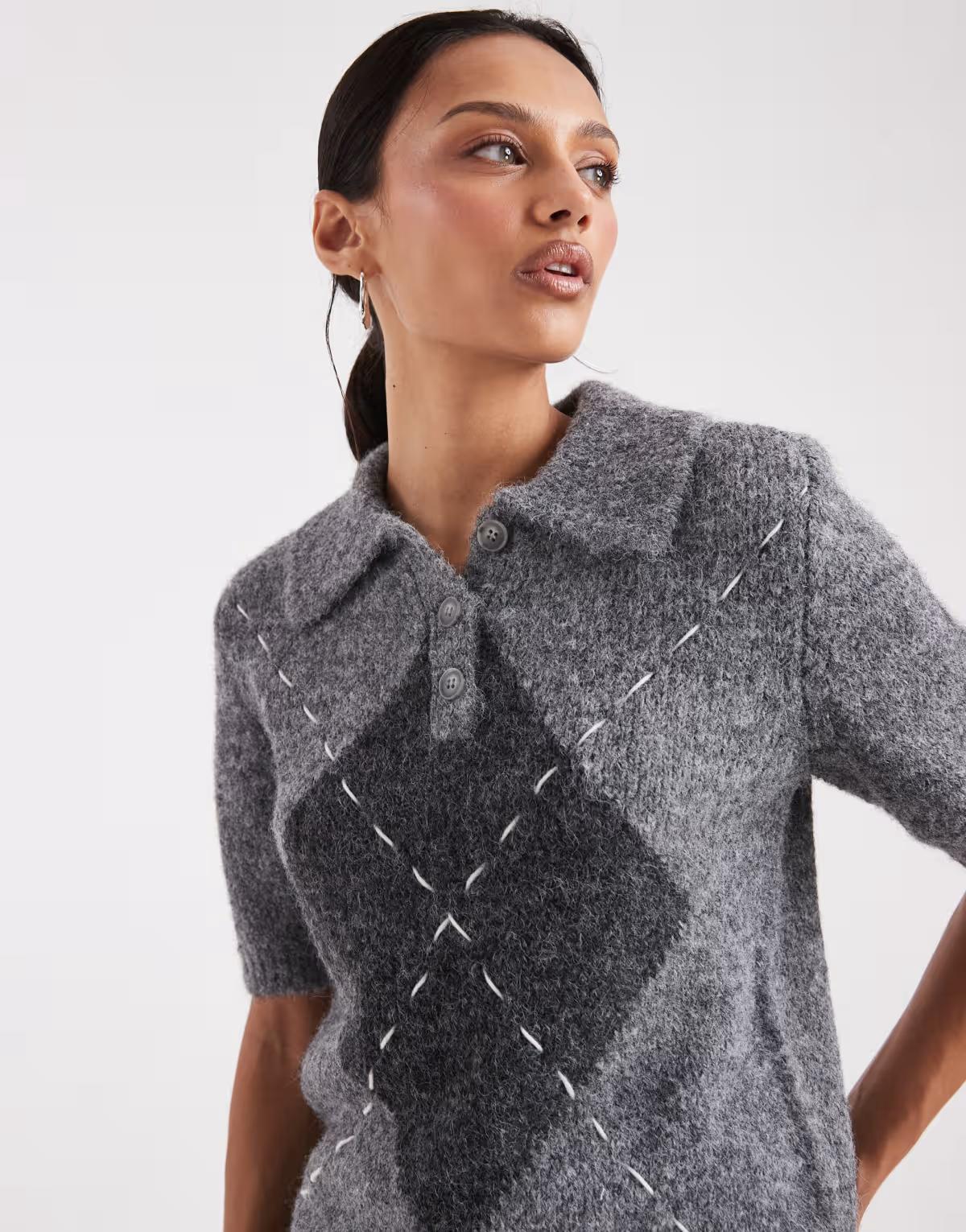 Vero Moda argyle stitch detail knitted polo in medium grey melange