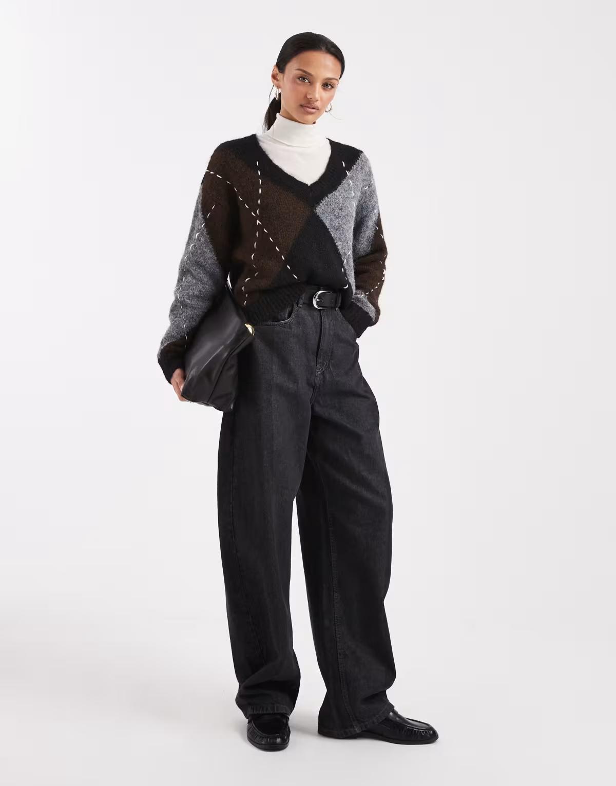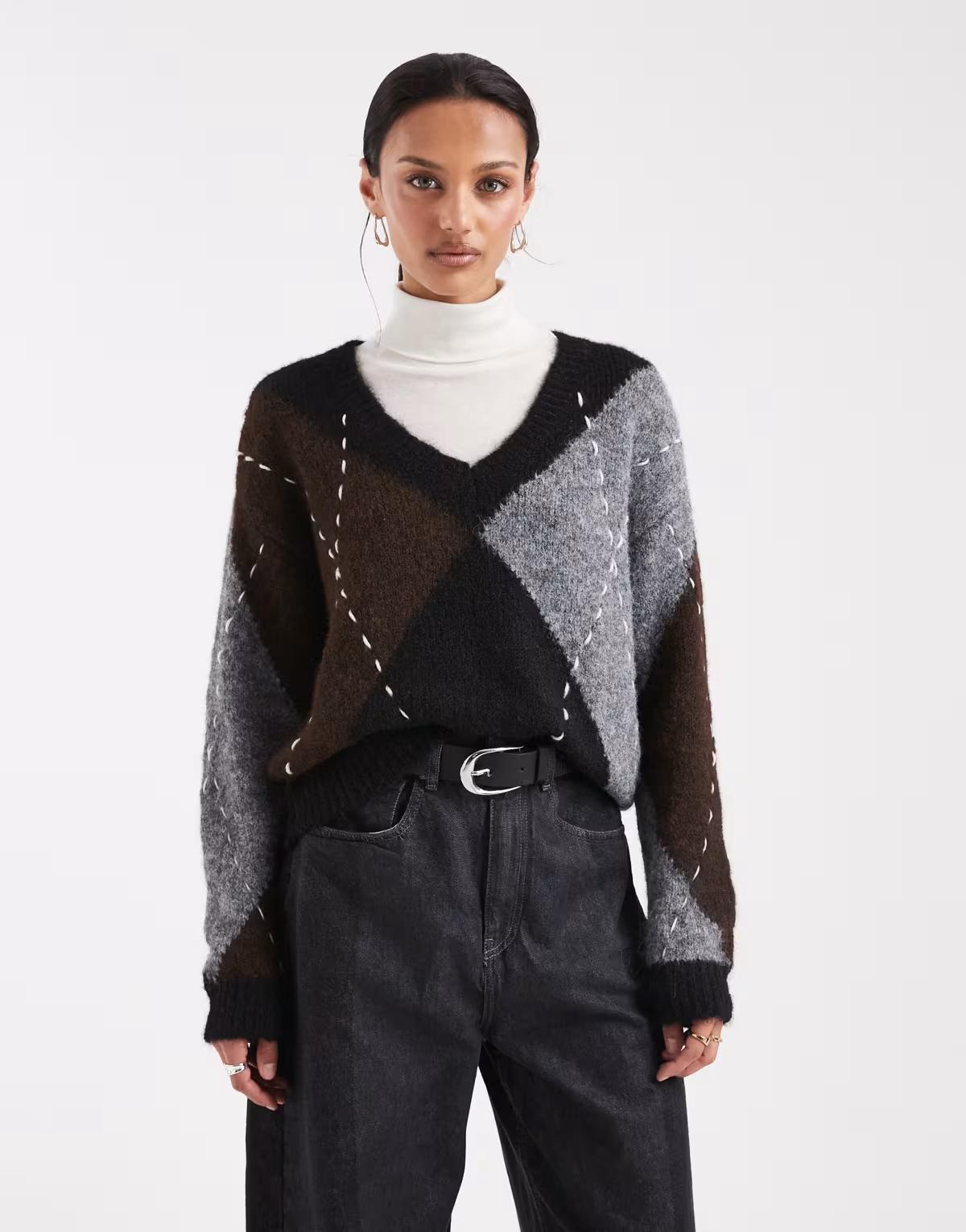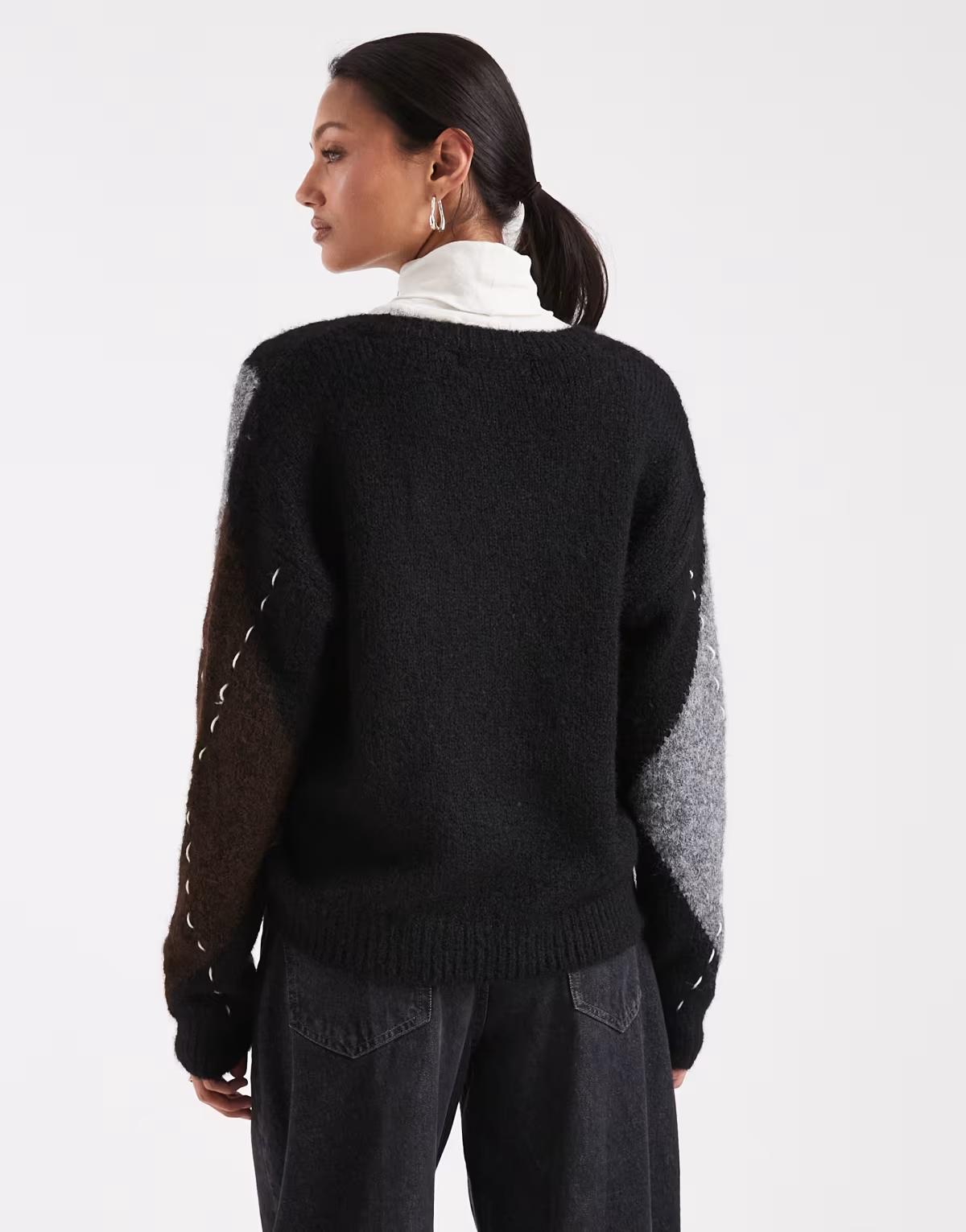Vero Moda argyle stitch detail knitted jumper in black and chocolate brown