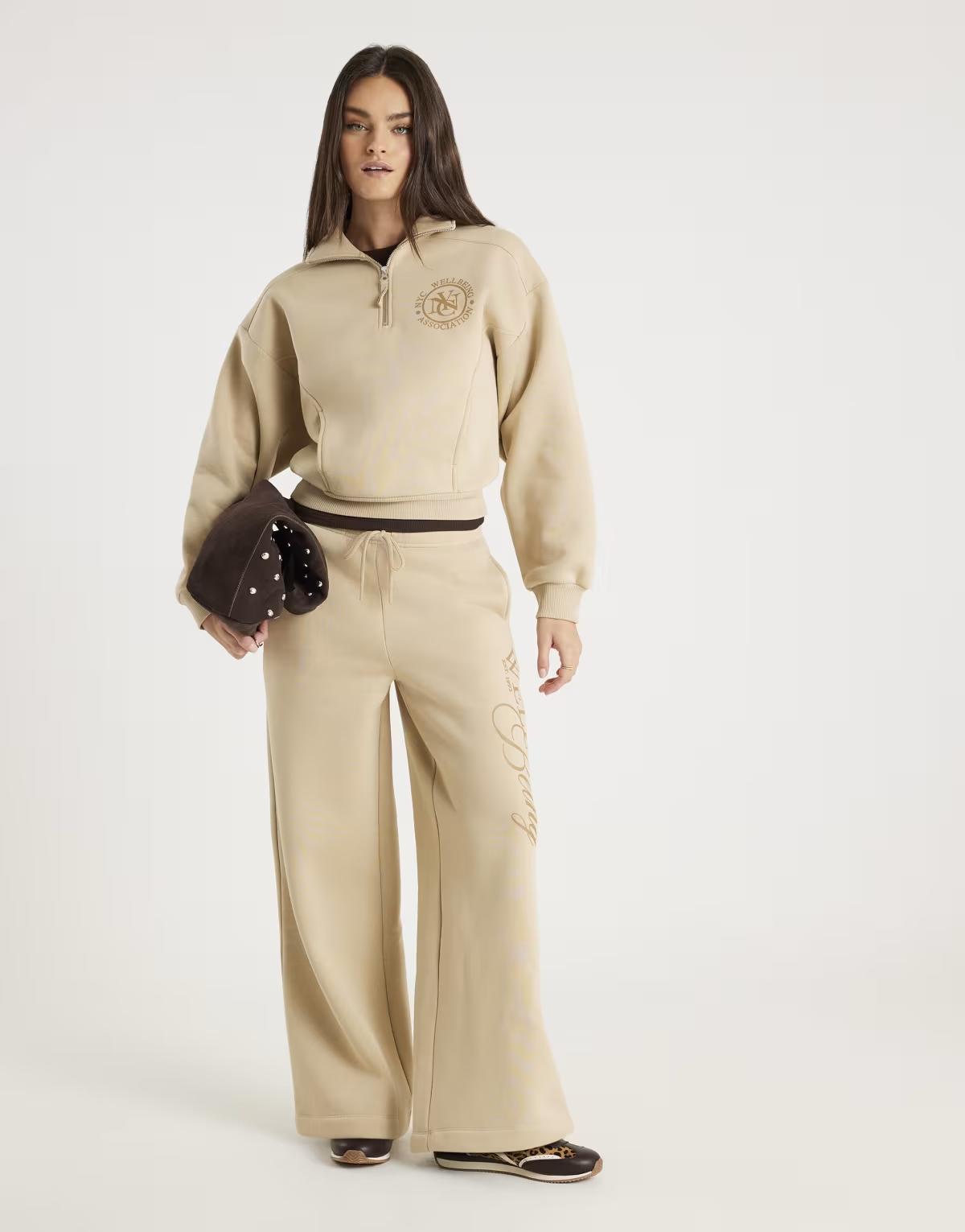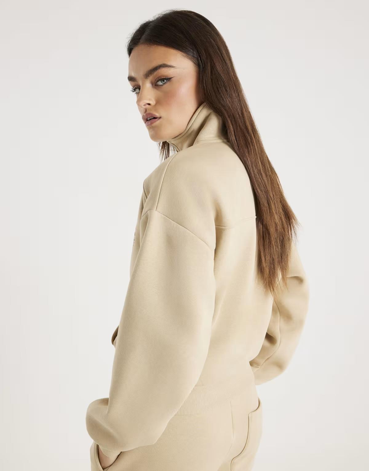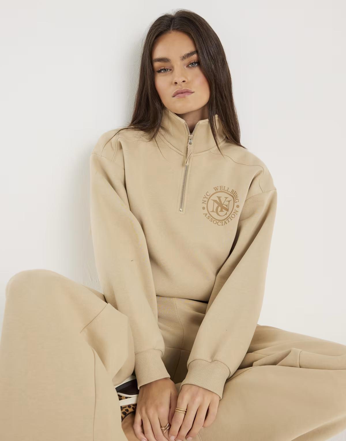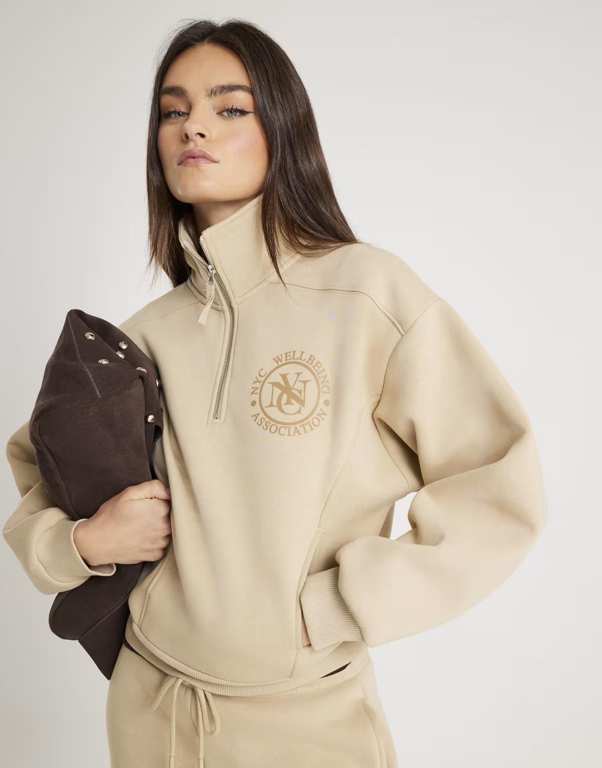 River Island Long sleeve nyc zip up sweatshirt in beige