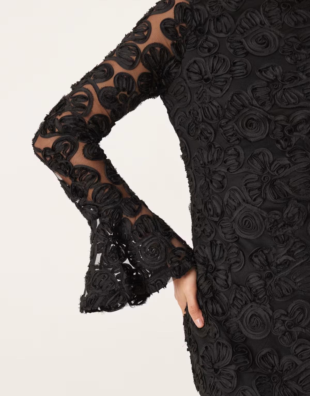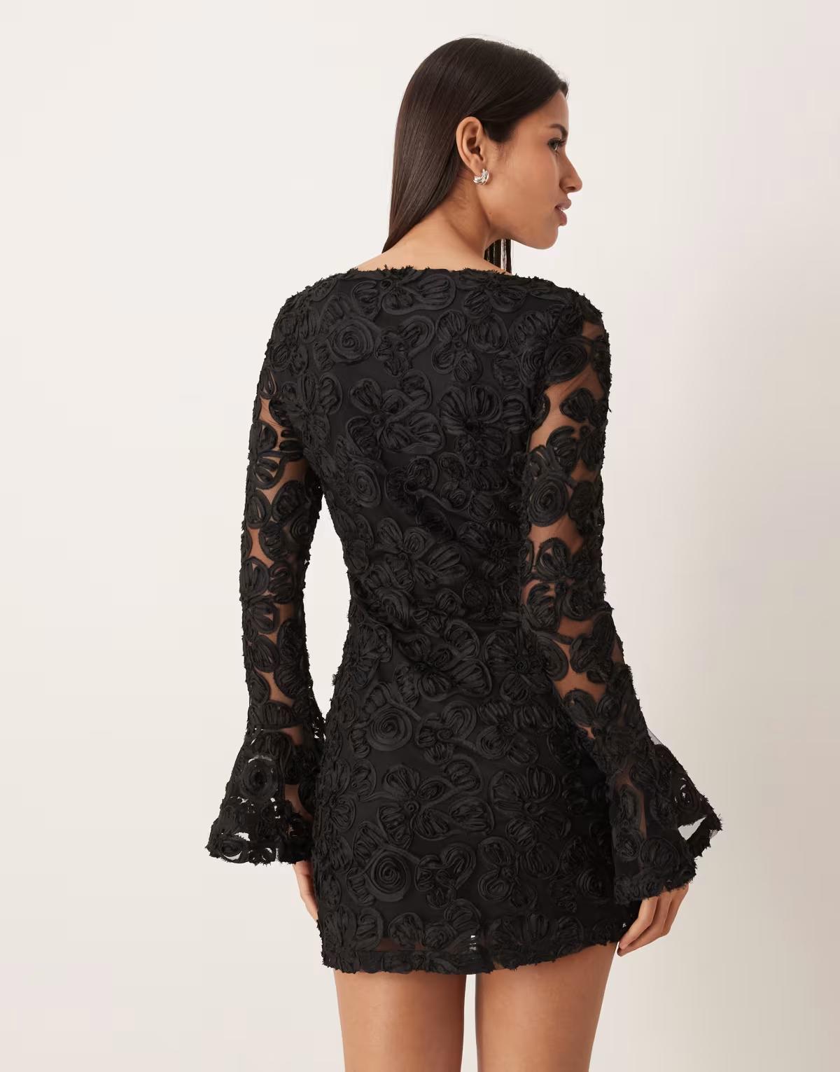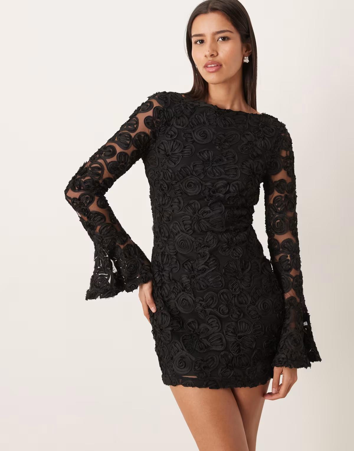 Gina Tricot long sleeve embroidery mini dress with open back in black