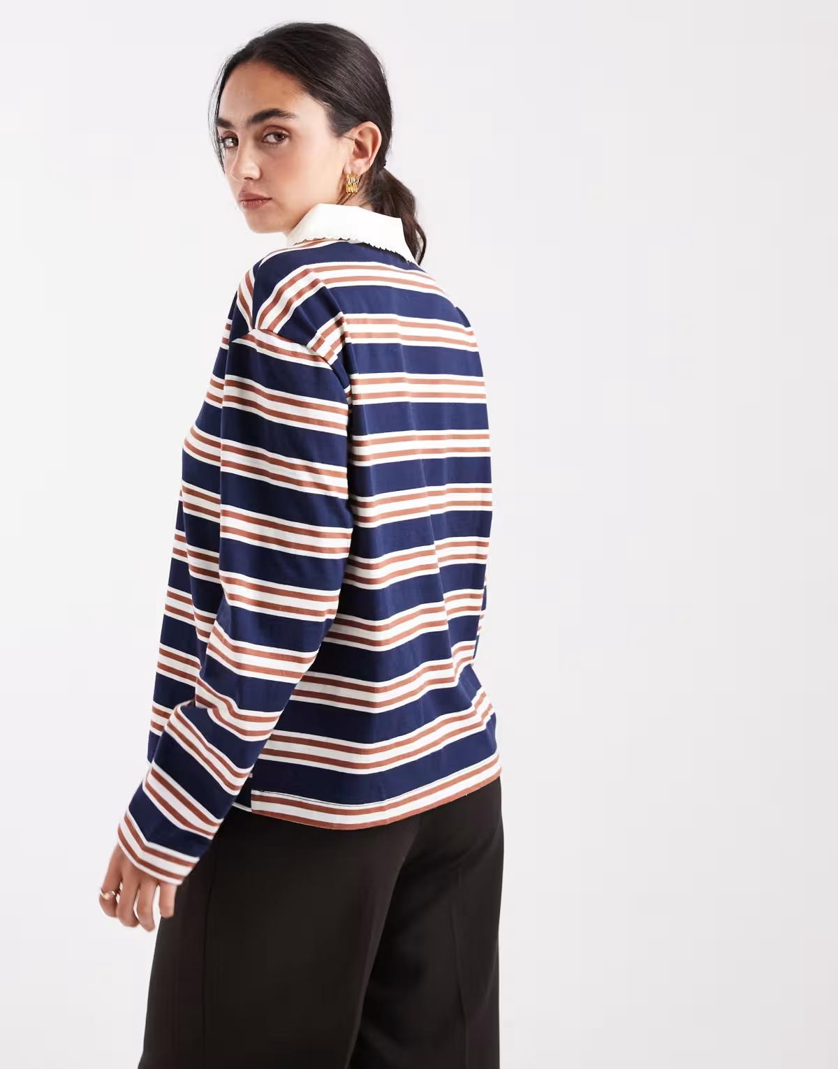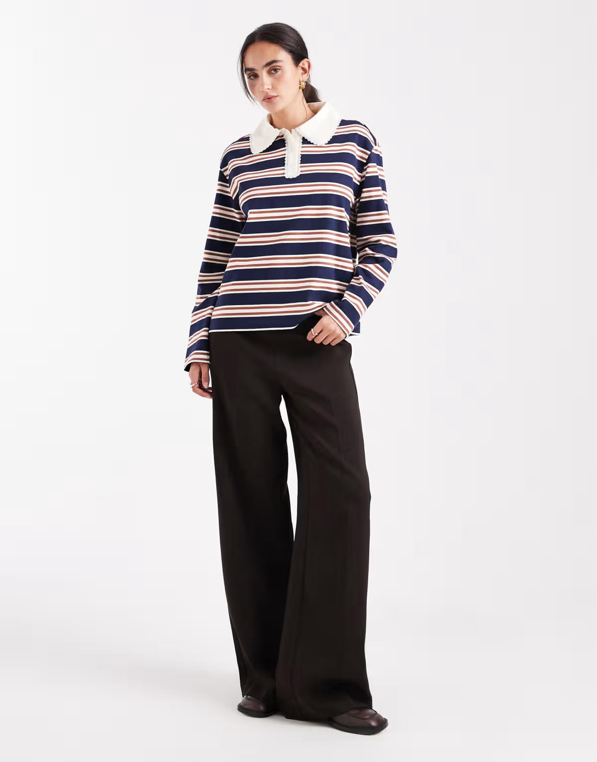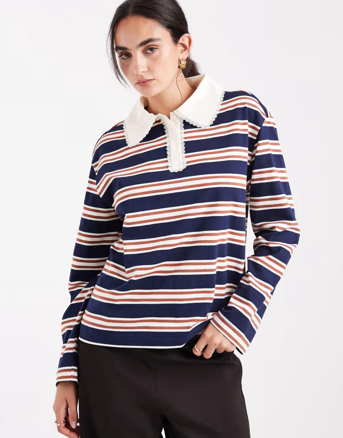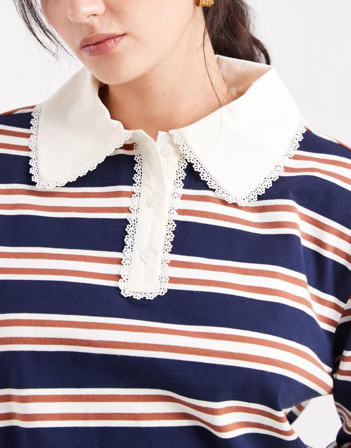 Miss Selfridge stripe rugby shirt with lace trim collar