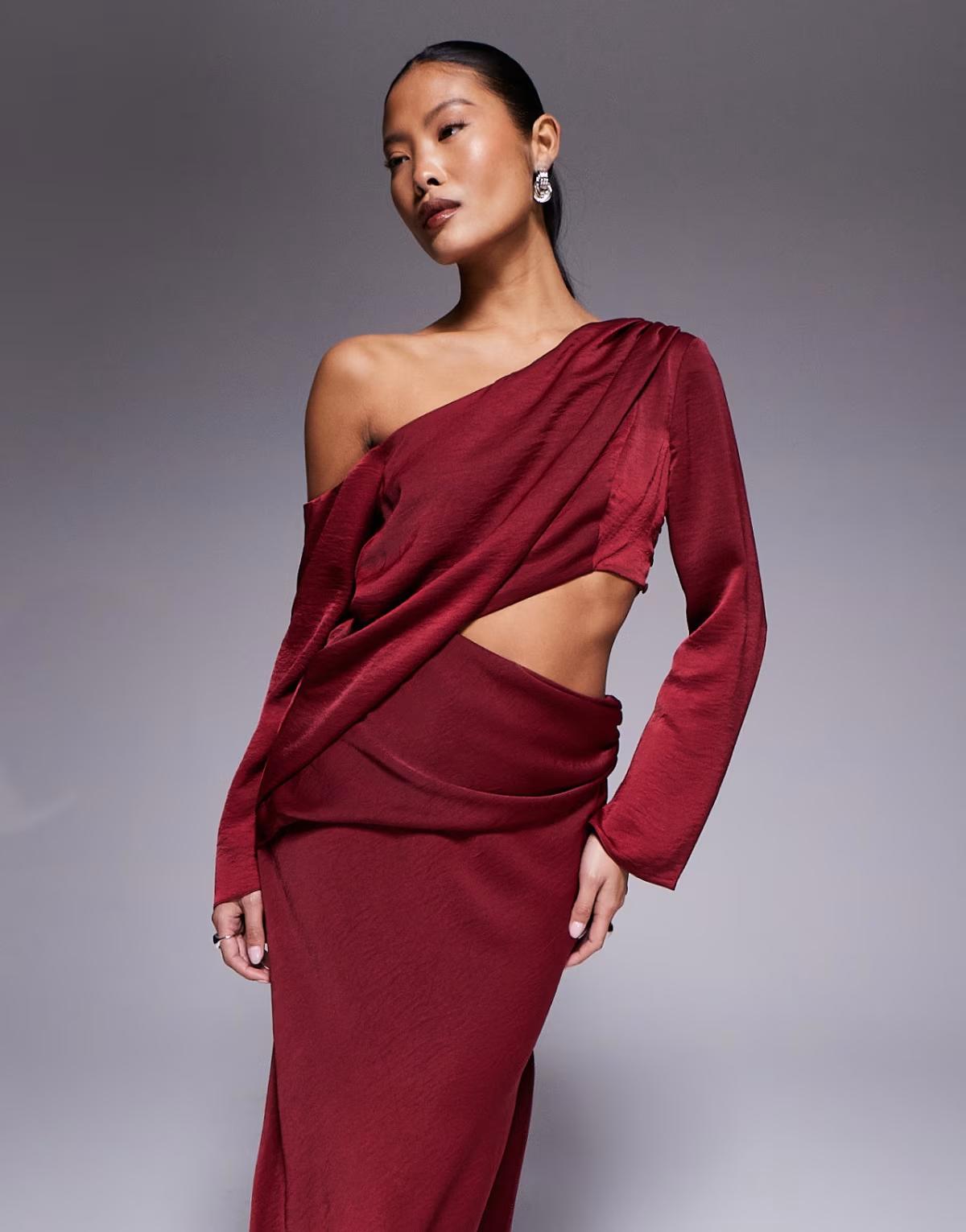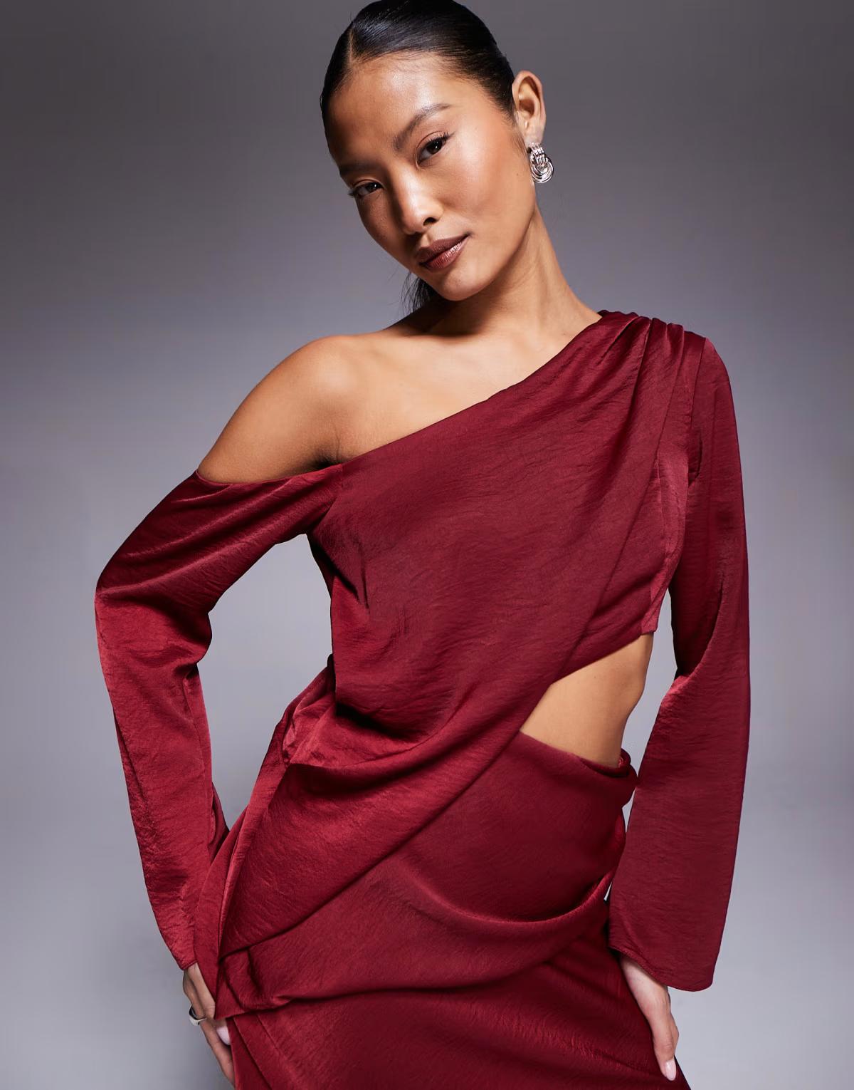ASOS DESIGN Petite fallen shoulder maxi dress with cutout waist in burgundy