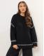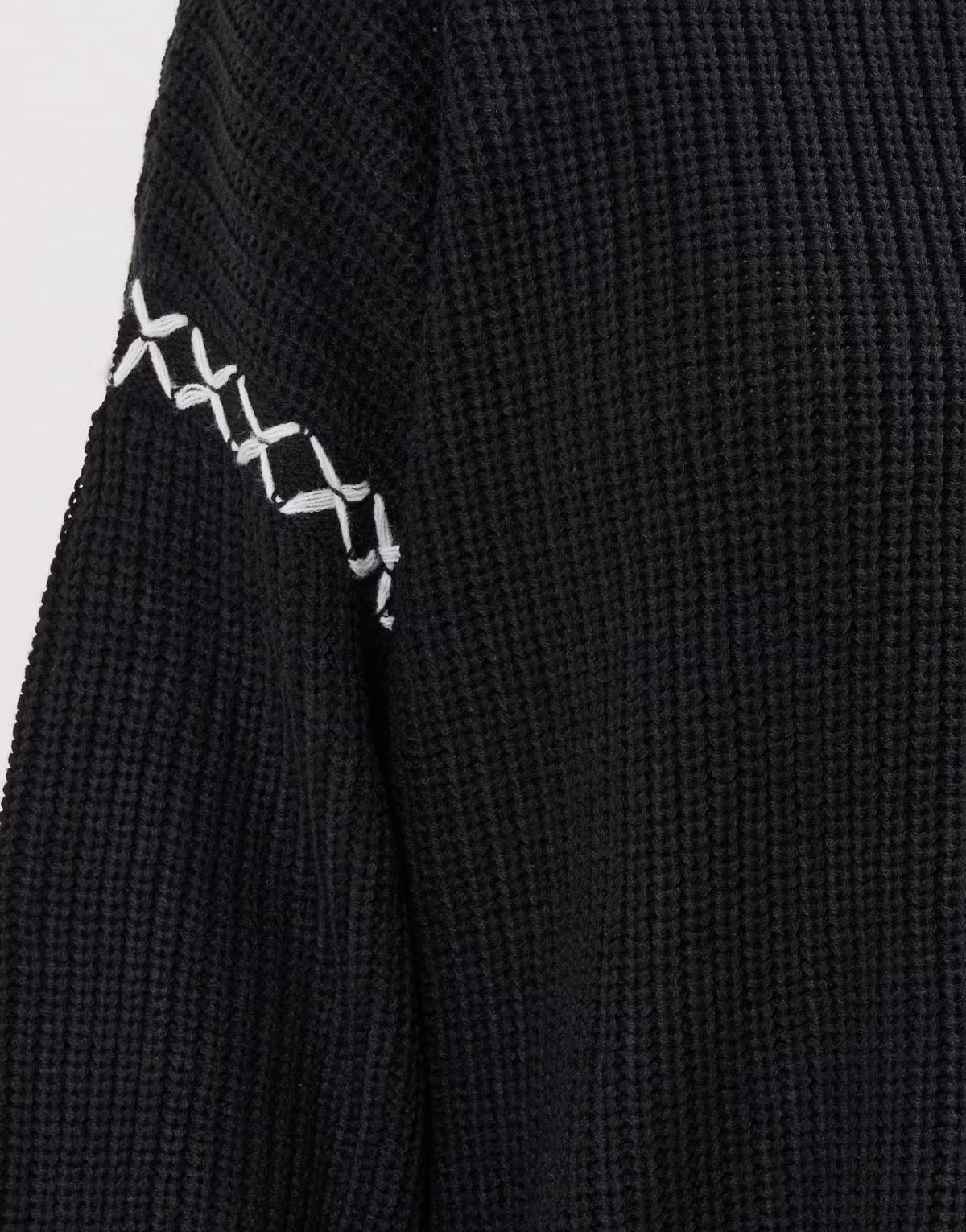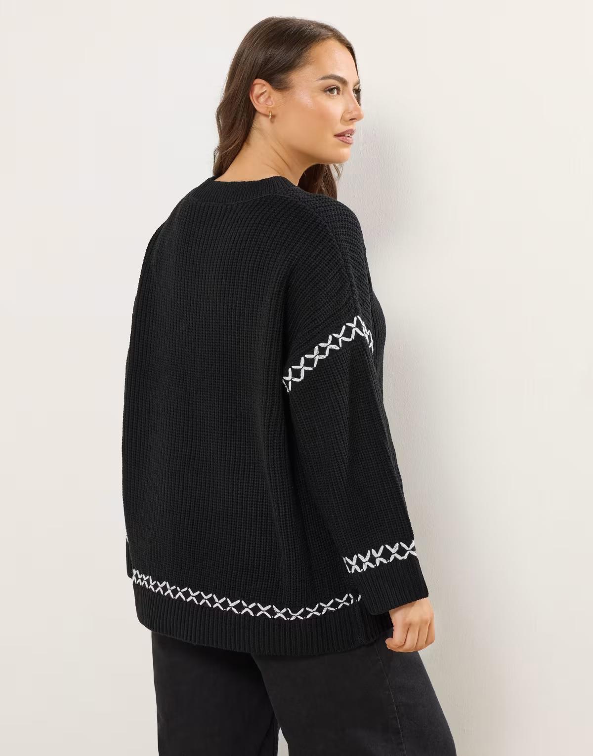 Blanket stitch trim on sleeves, cuffs, and above hem