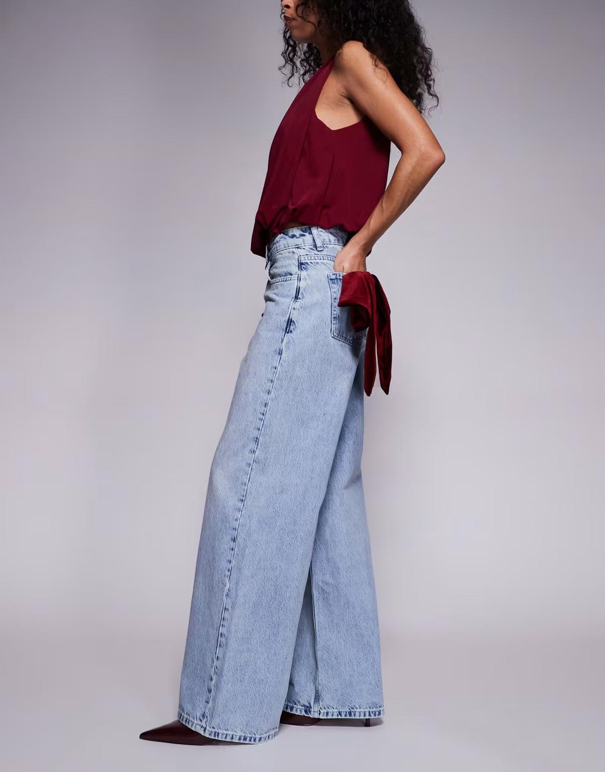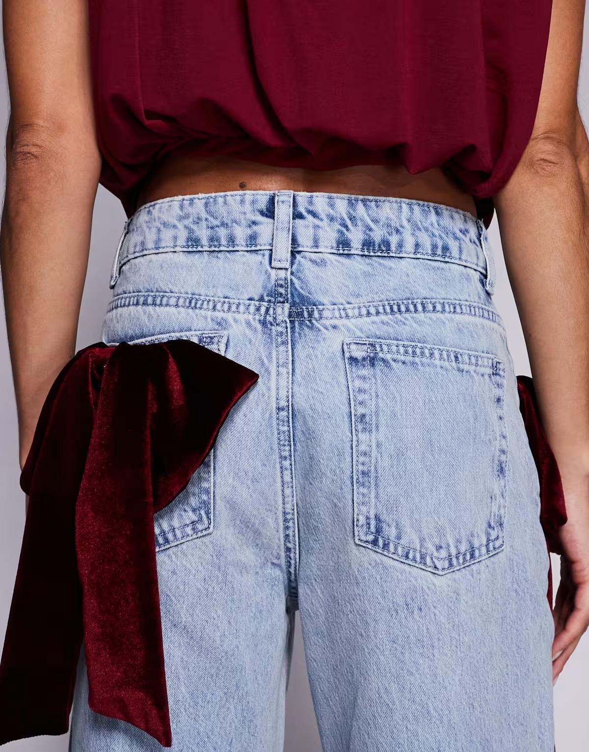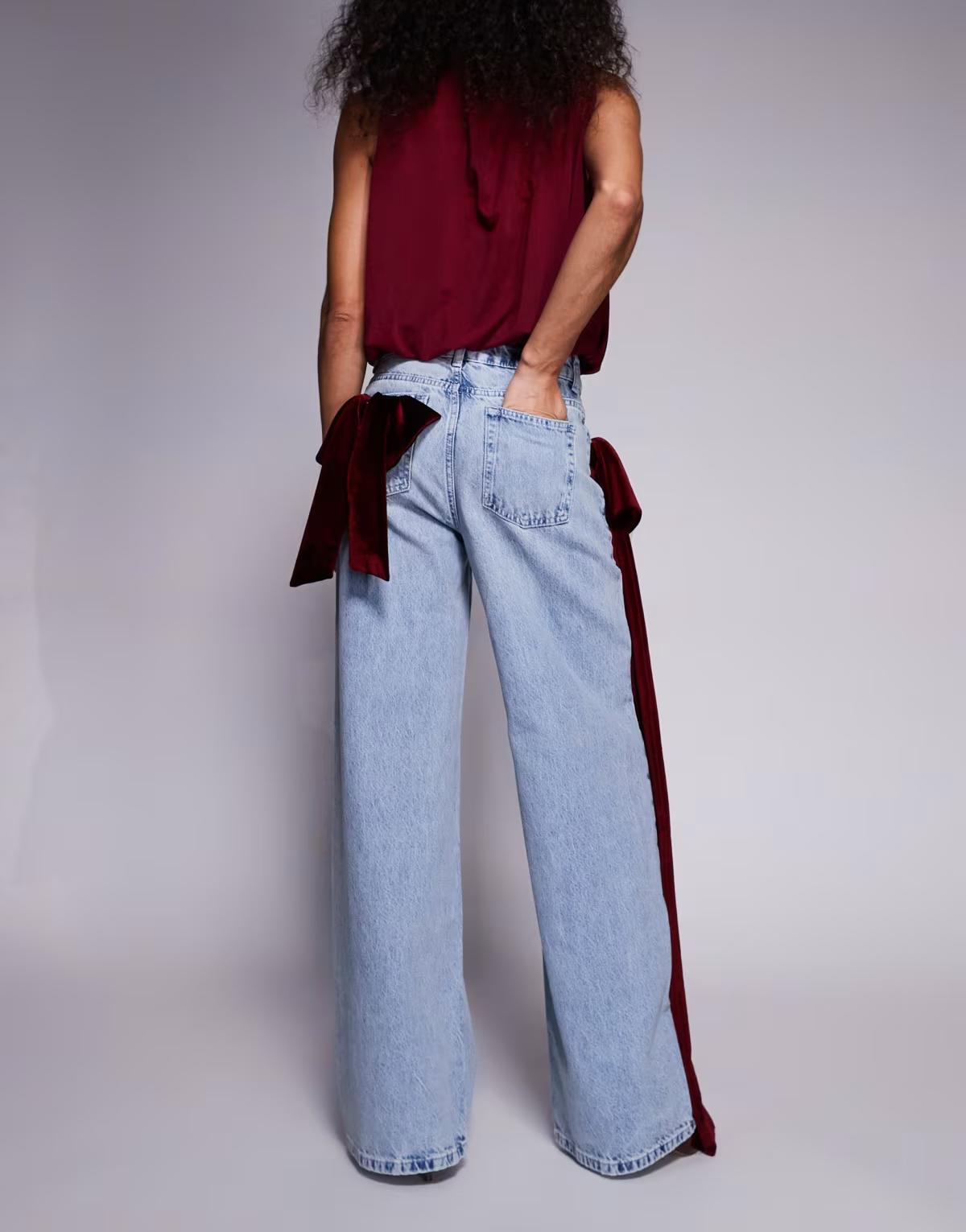 ASOS LUXE wide leg jeans with 3D velvet bow detail in light blue