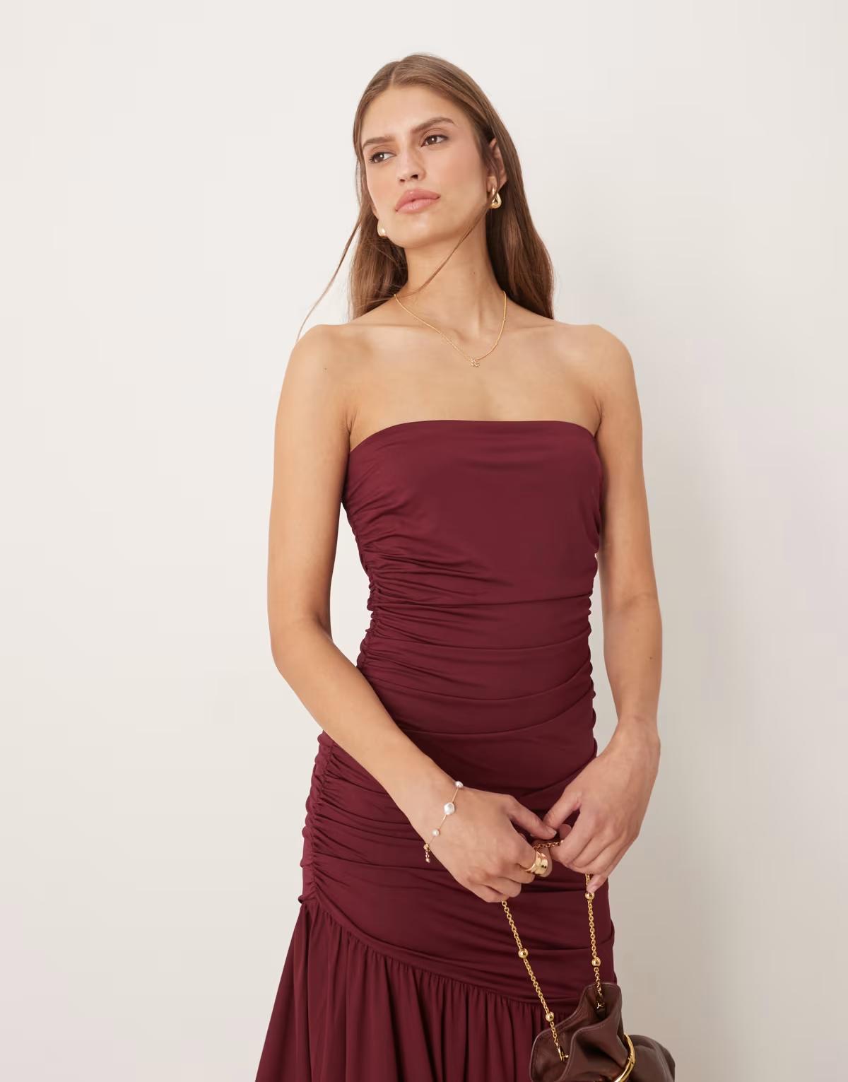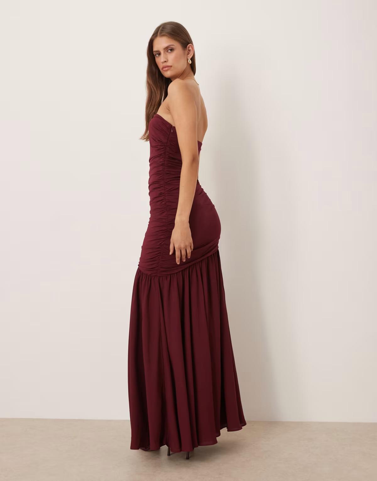 SNDYS mesh asymmetric drop waist ruched detail maxi dress in cranberry