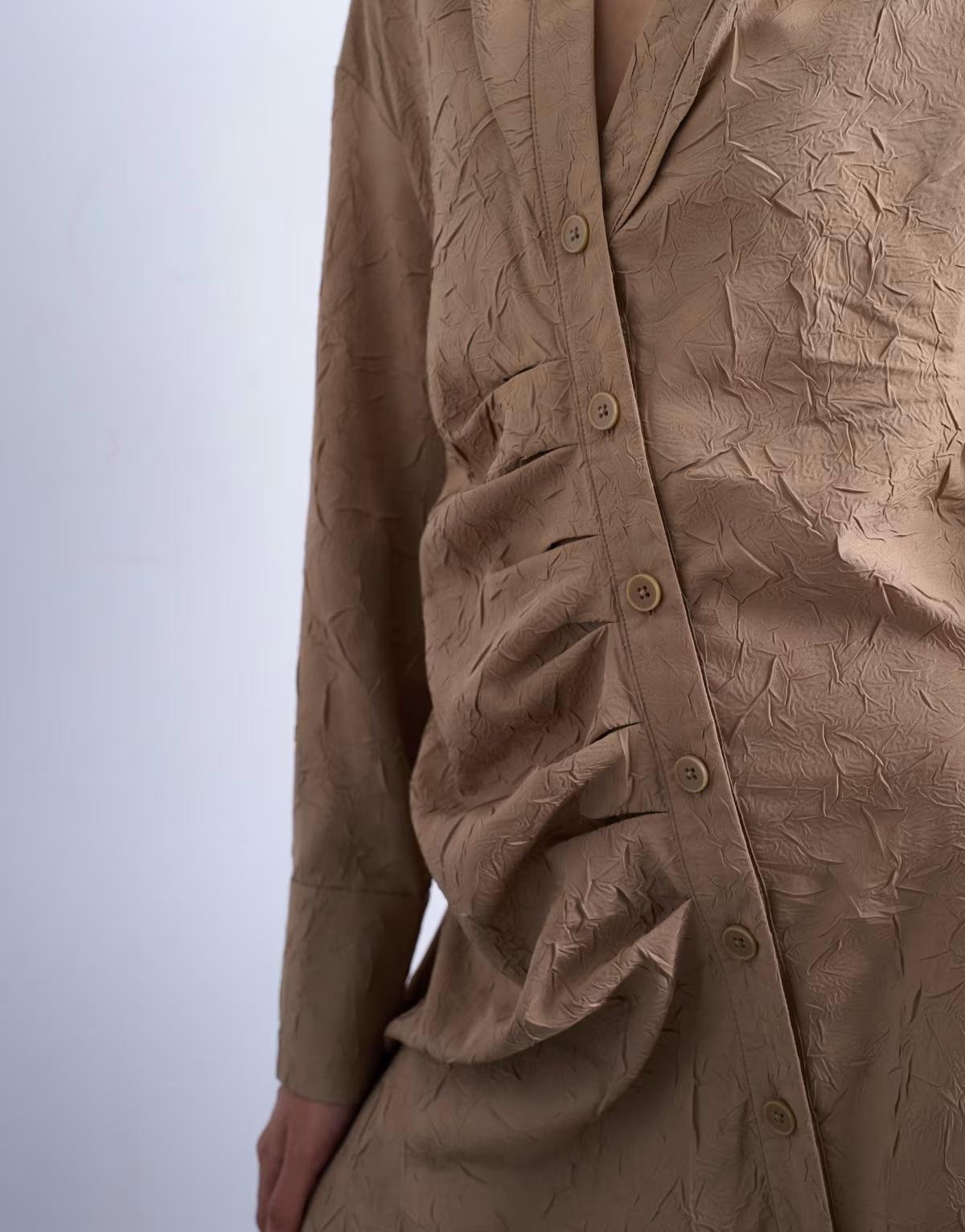 A more relaxed and rustic take on the shirt dress, this style features an asymmetric design in lightweight, crinkled fabric. It has a spread collar, long sleeves, a button placket and a thigh-high split.