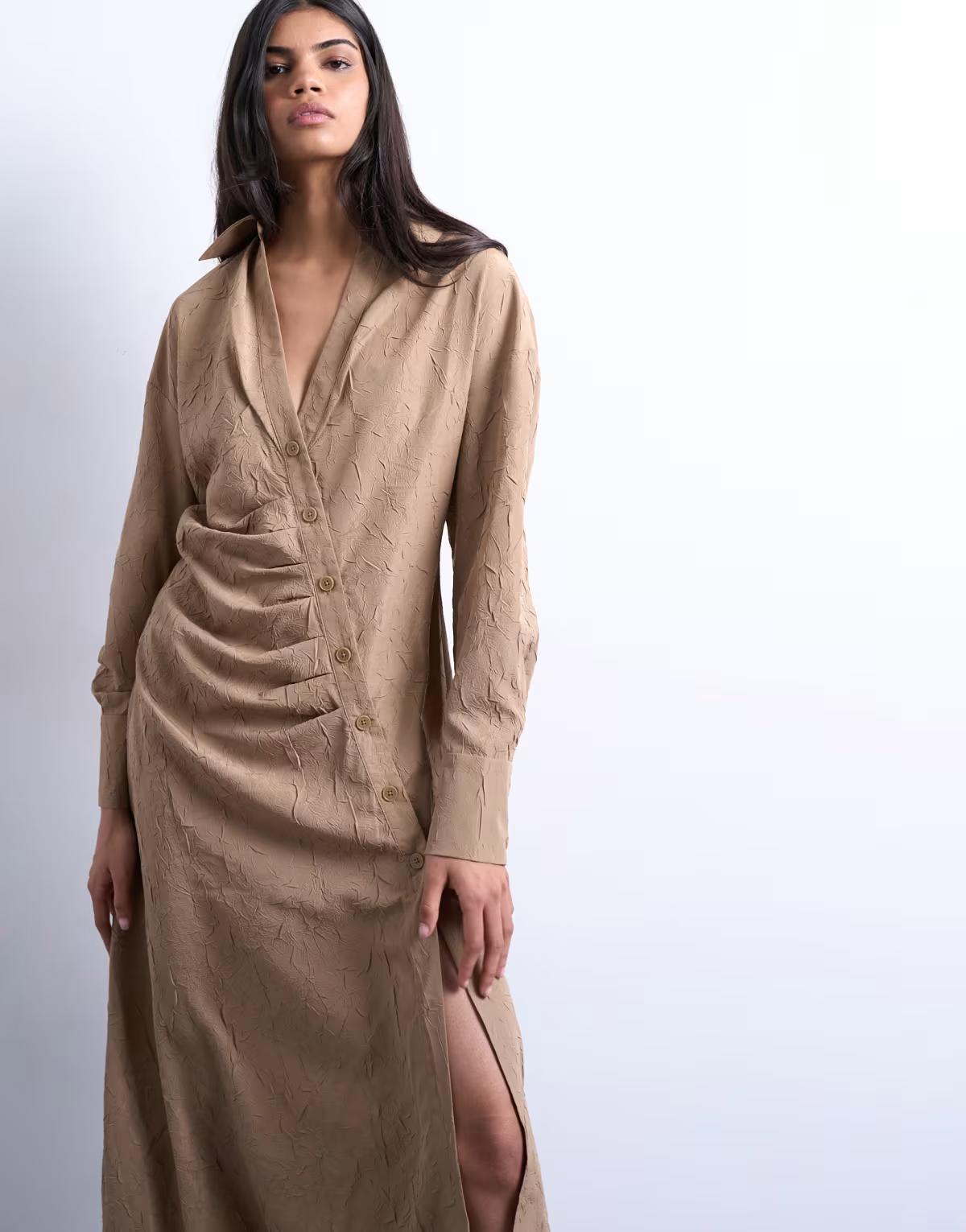 Topshop open collar ruched long sleeve midi shirt dress in taupe