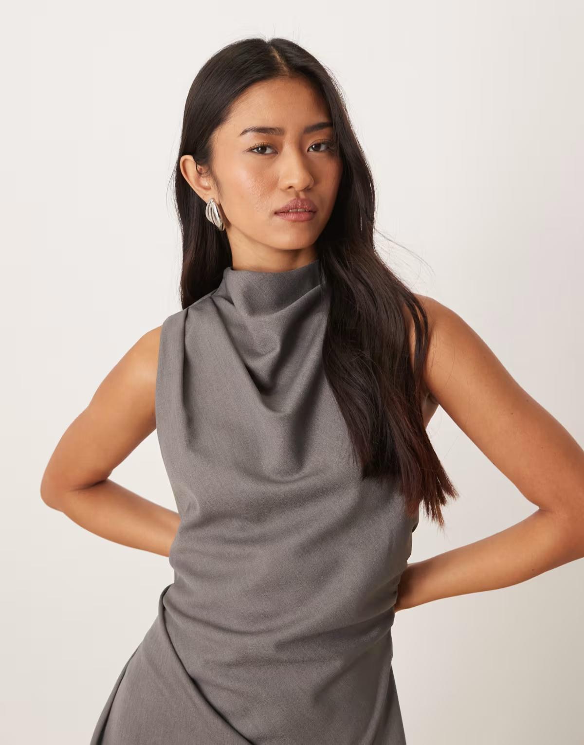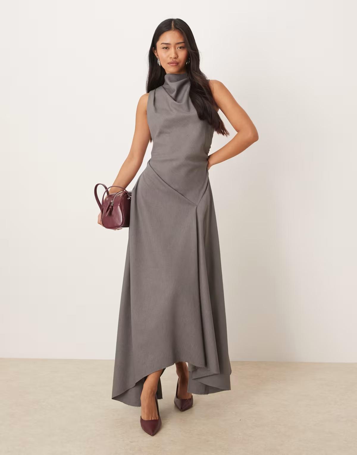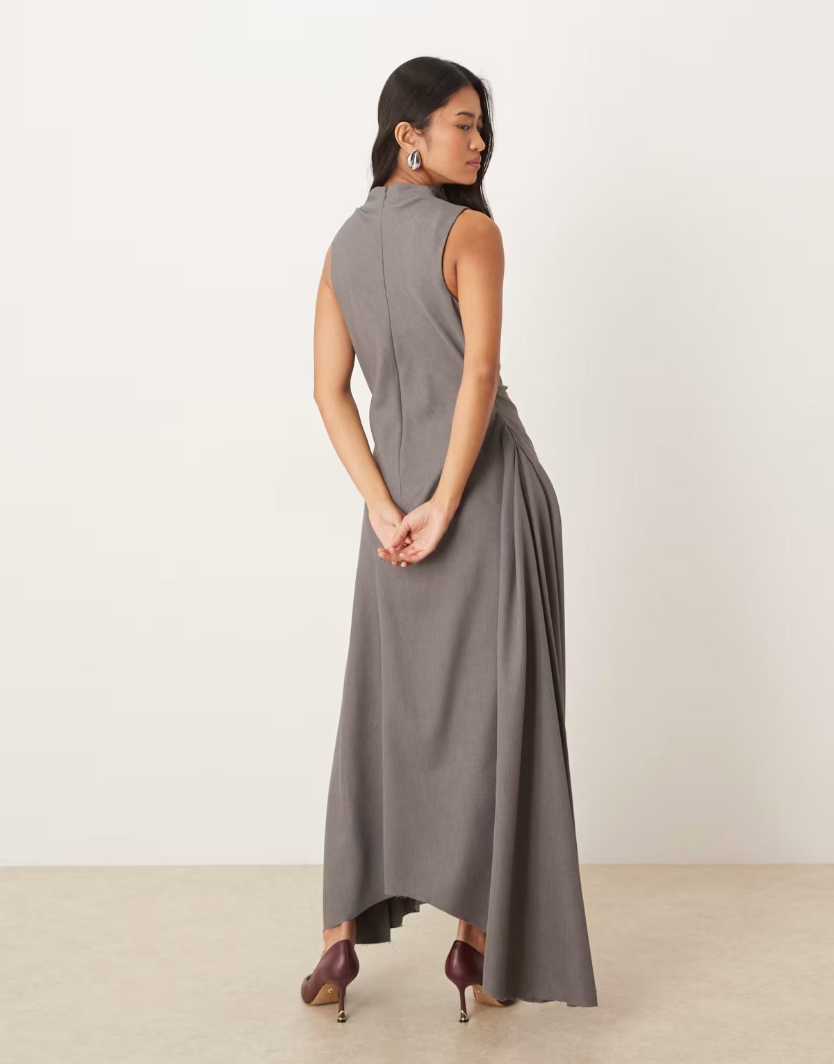 ASOS DESIGN draped high neck hanky hem maxi dress in grey