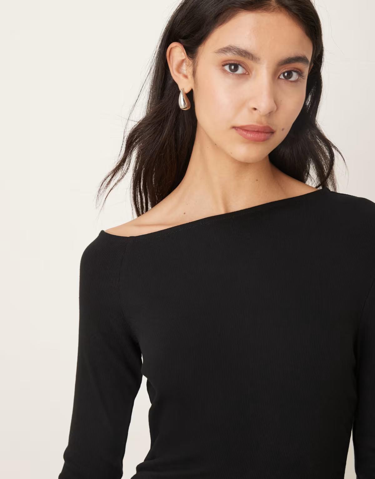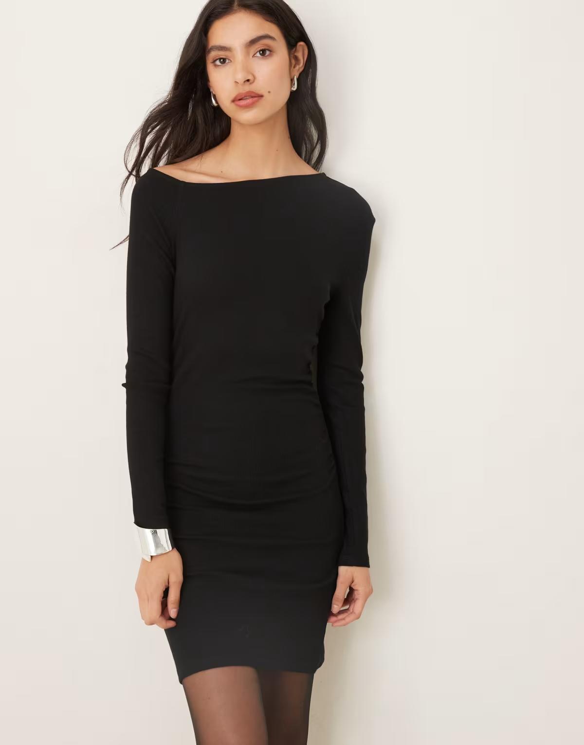 ASOS DESIGN ribbed long sleeve split front mini dress in black