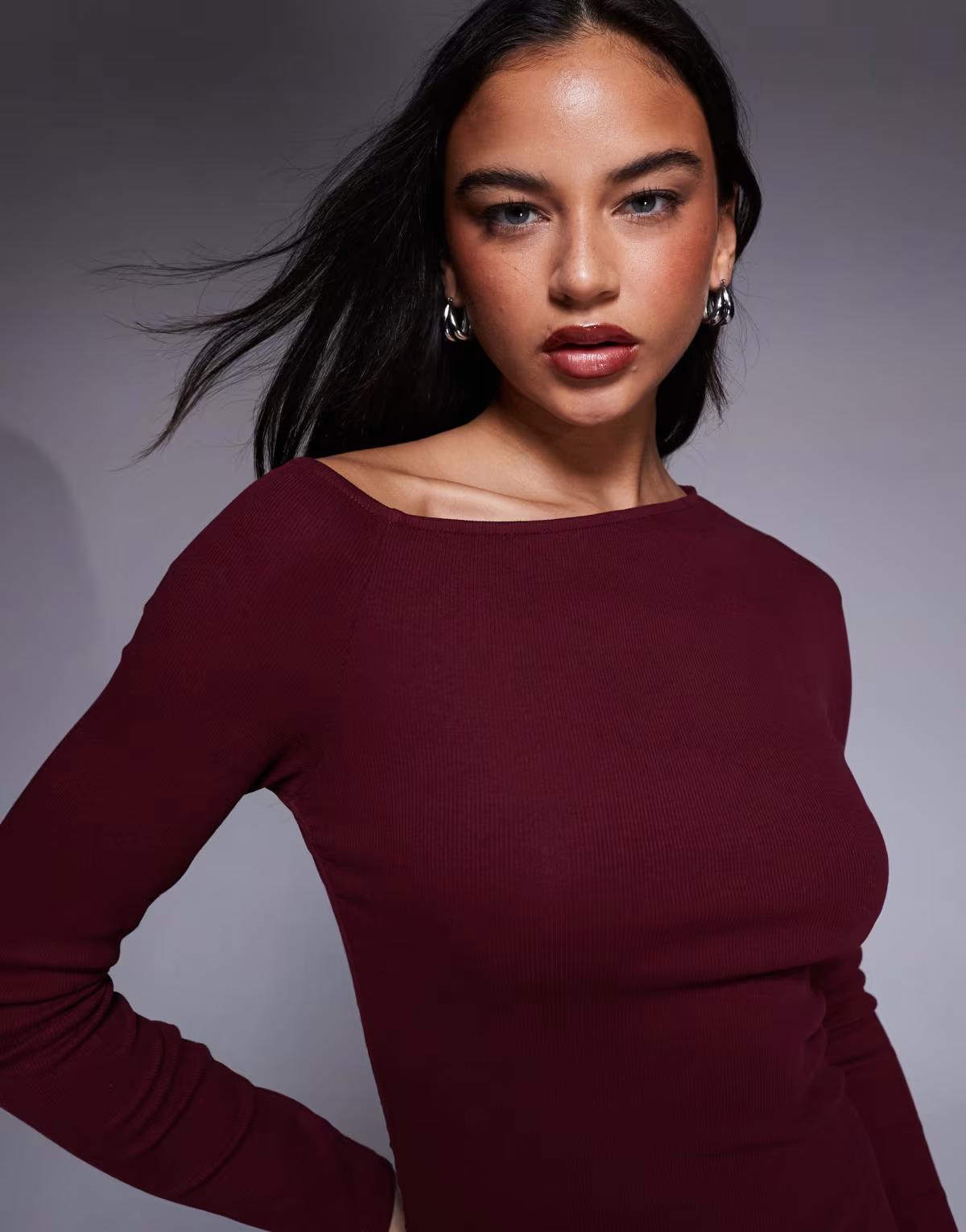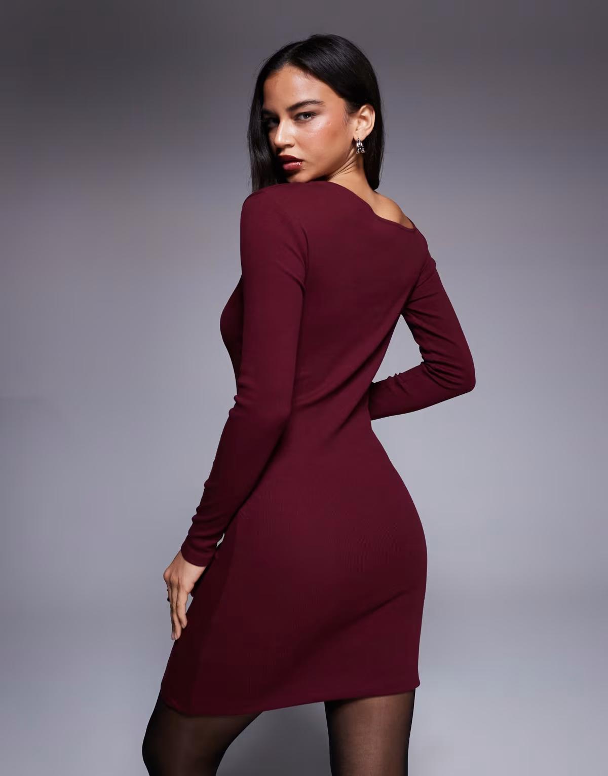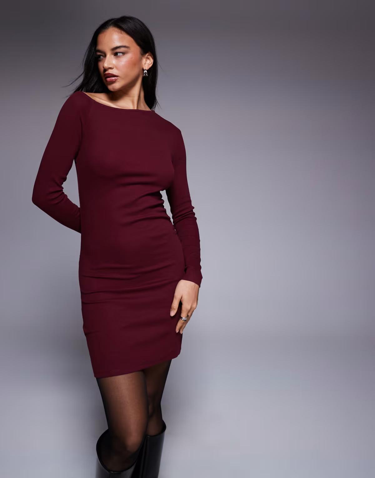 ASOS DESIGN ribbed long sleeve split front mini dress in burgundy