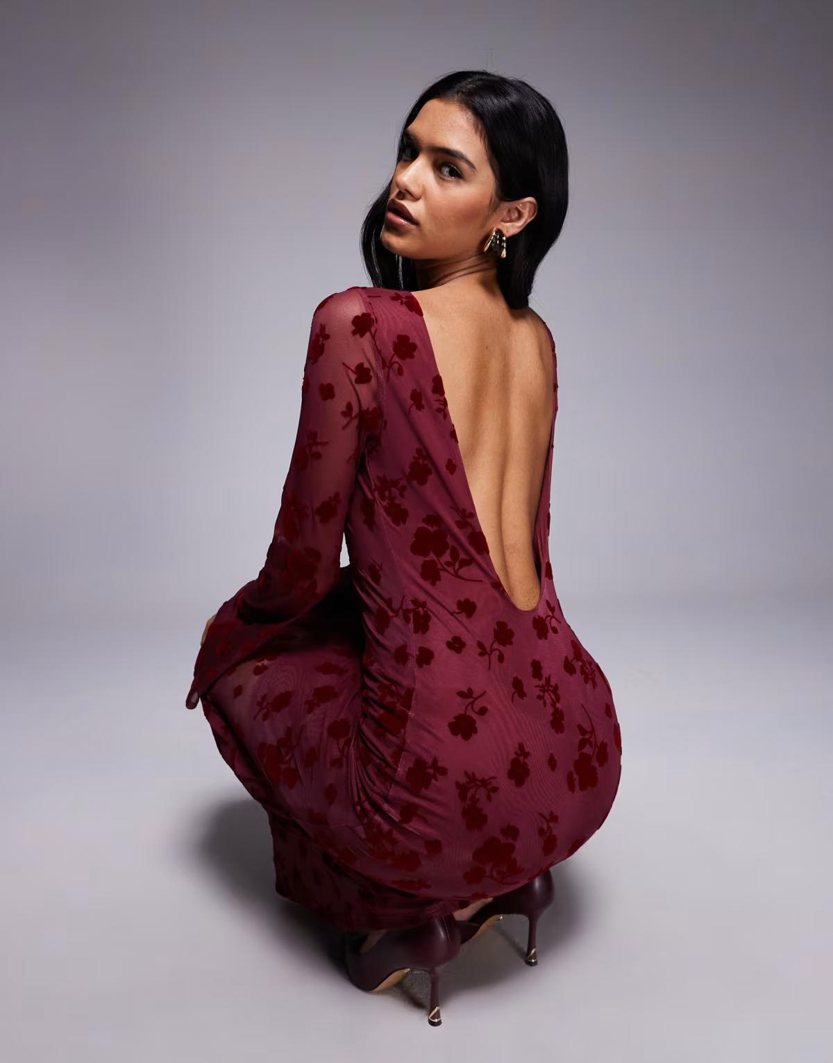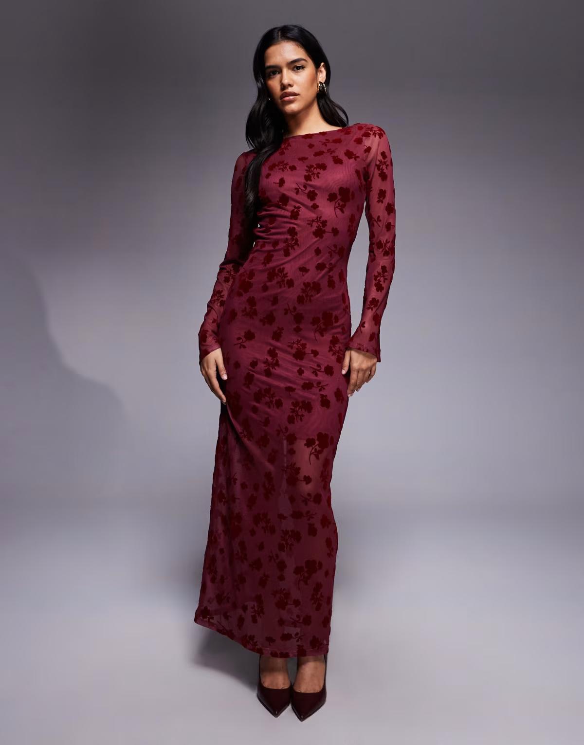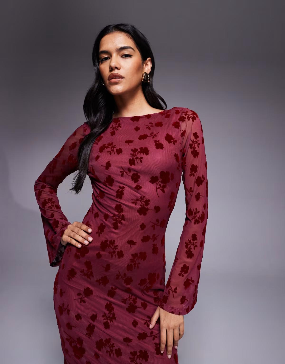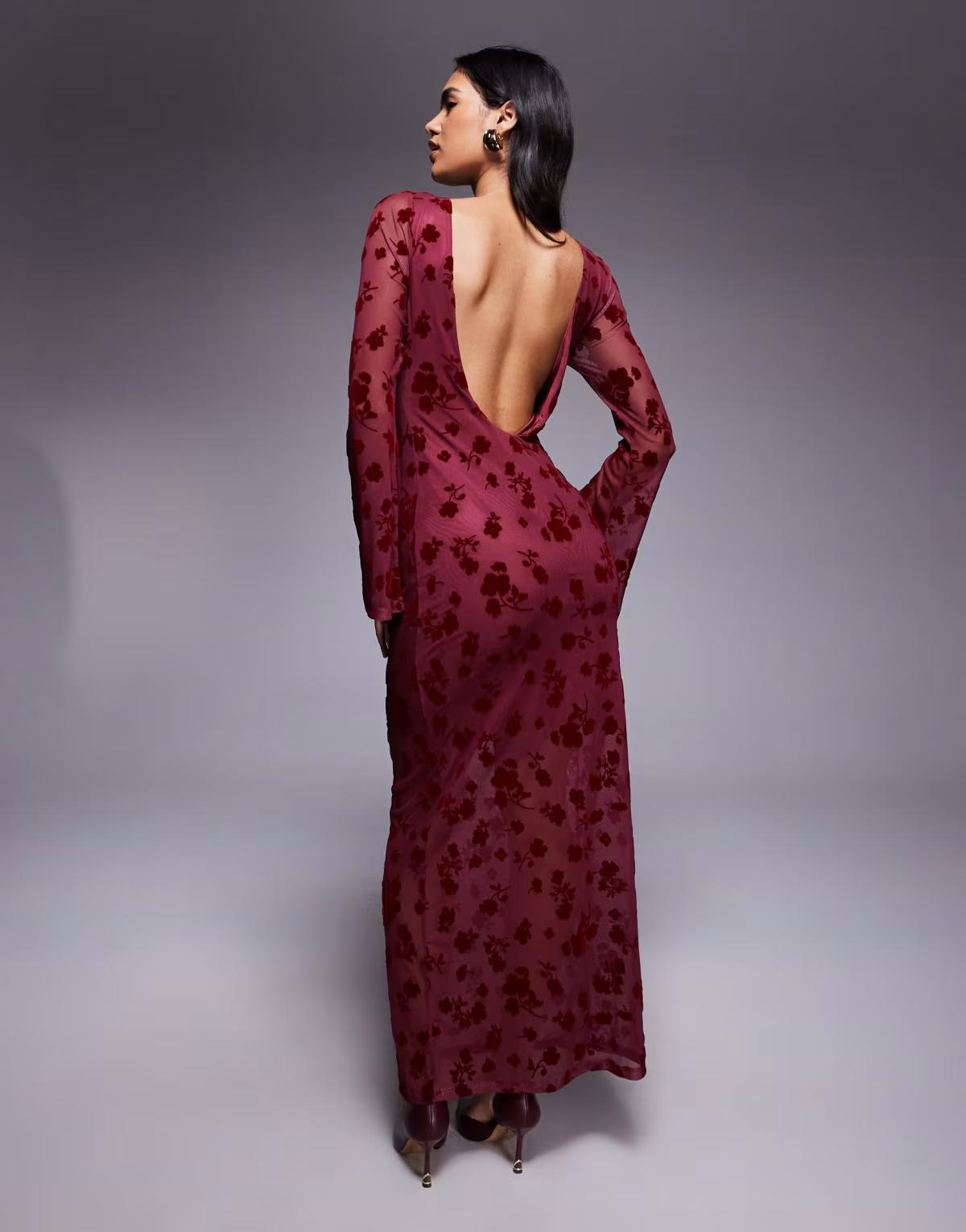 ASOS DESIGN floral flock maxi dress with flute sleeve detail in burgundy
