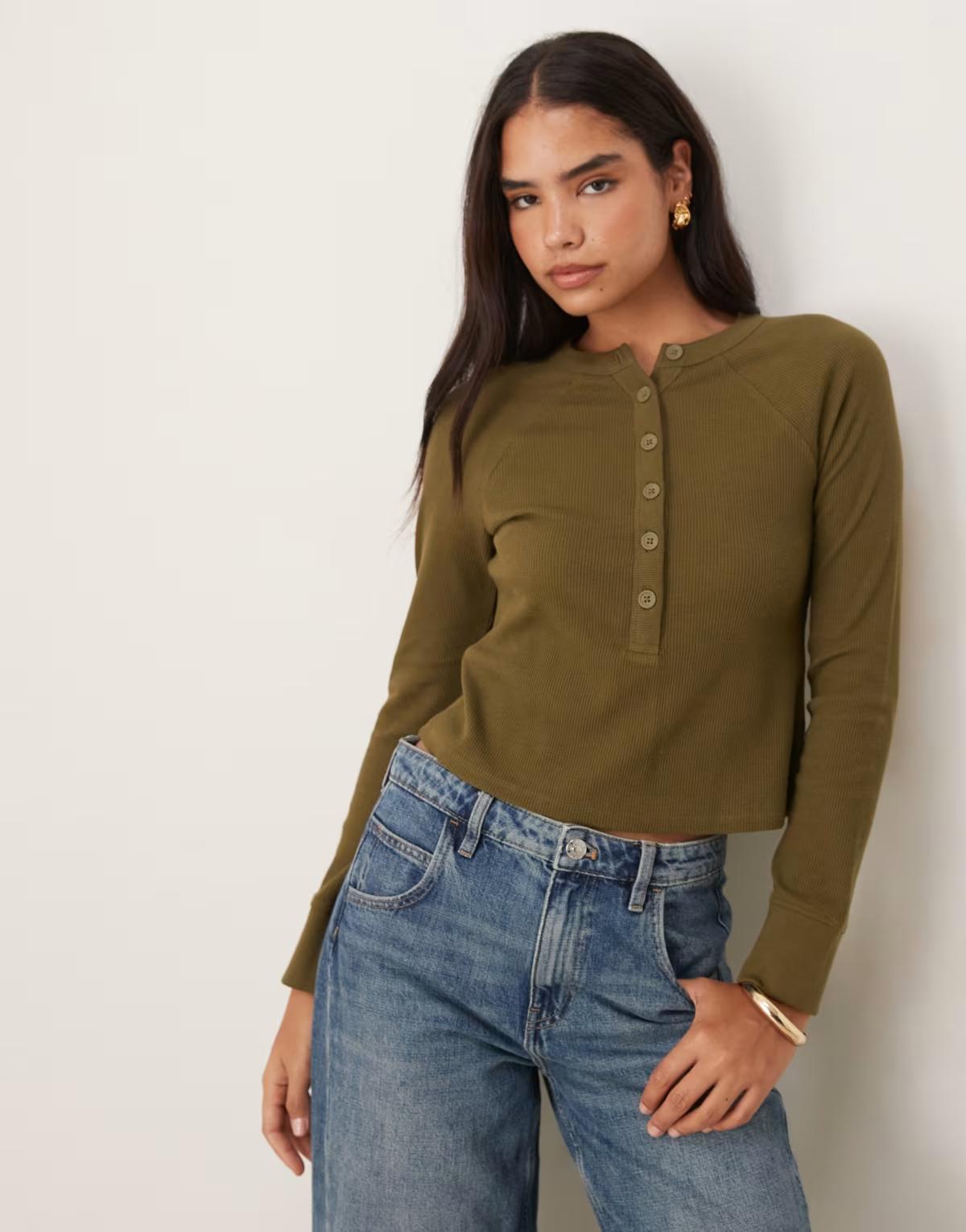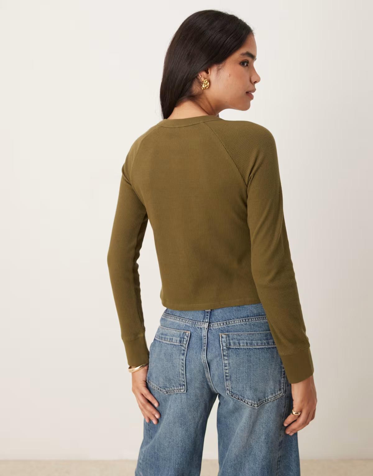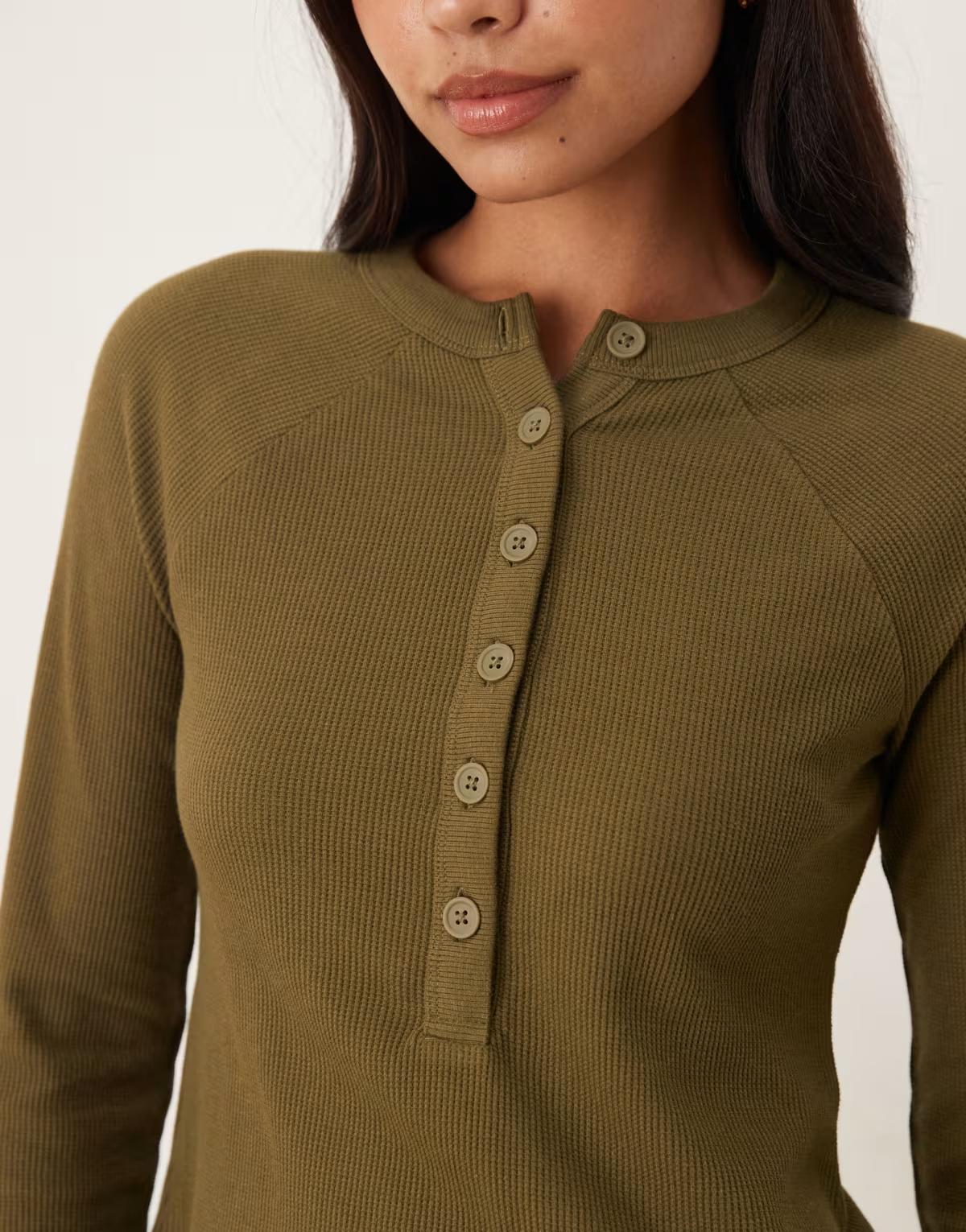 ASOS DESIGN raglan sleeve thick waffle henley in olive