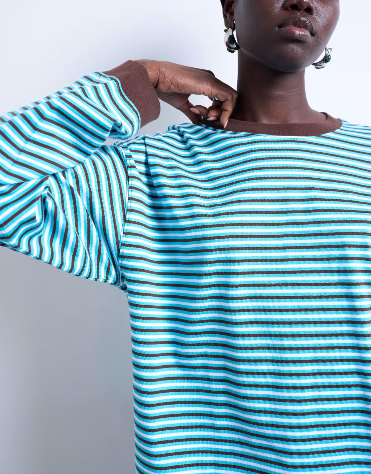 This T-shirt is crafted from a soft, stretchy knitted fabric. It features a bold striped pattern, contrasting neck and trims, and is cut with a relaxed fit.