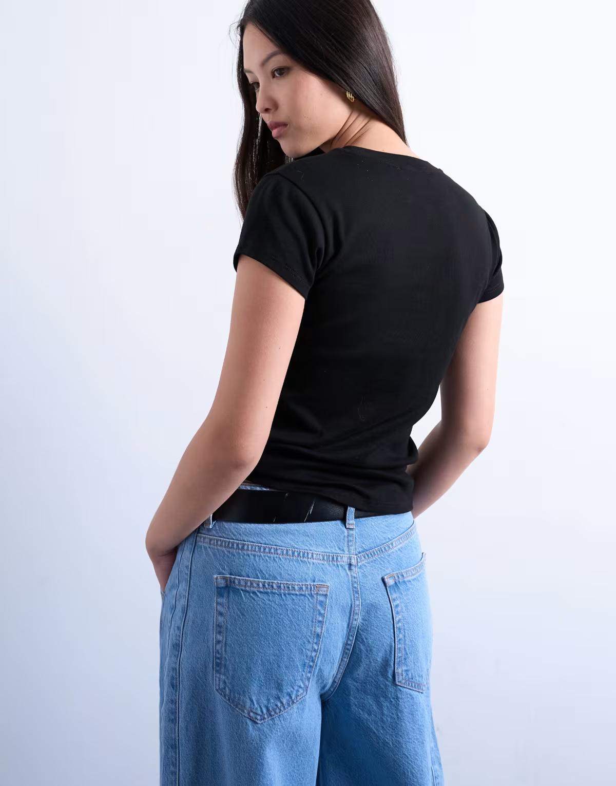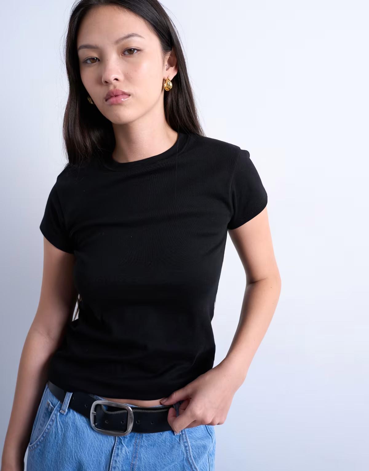 This top is crafted from soft, stretchy jersey and features a versatile plain design. It has a crew neck, short sleeves and is cut with a slim, cropped fit.