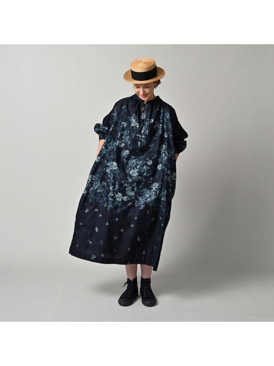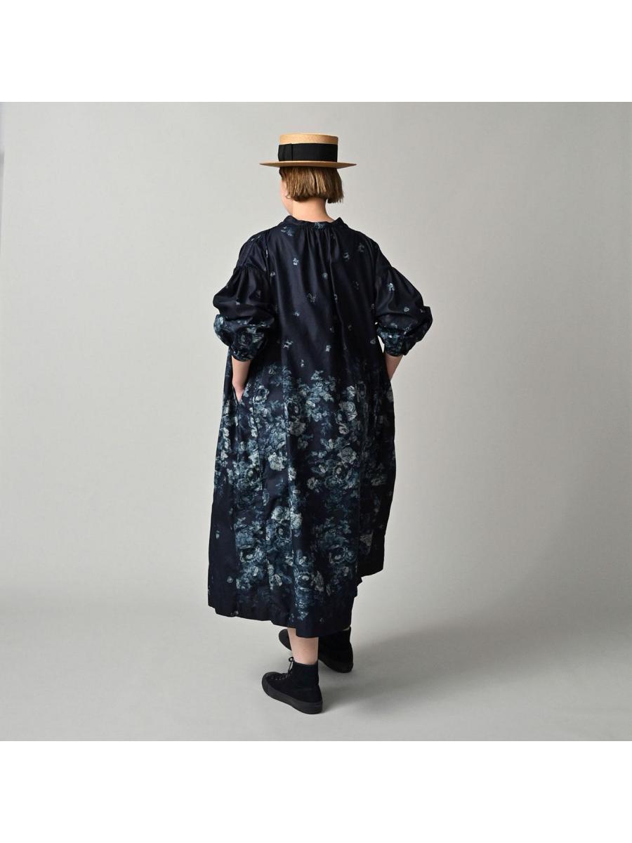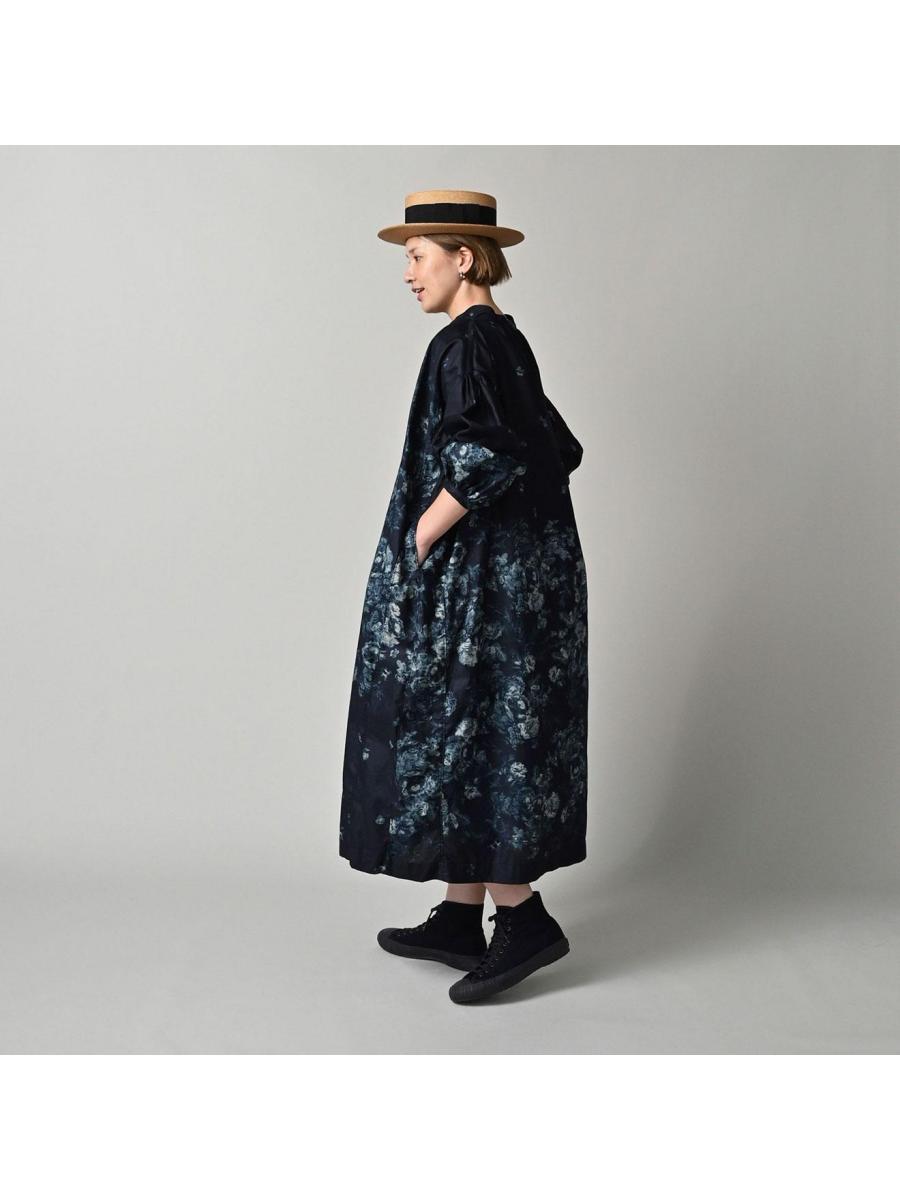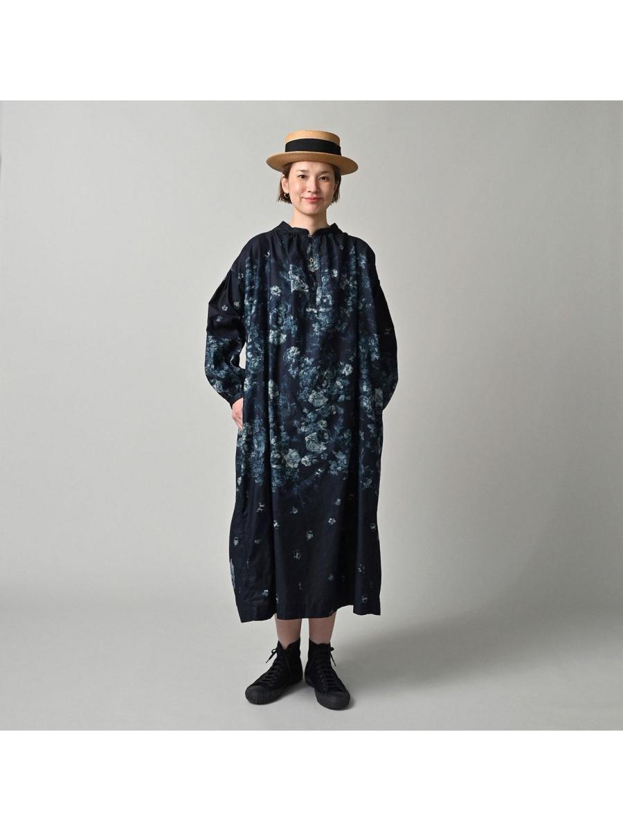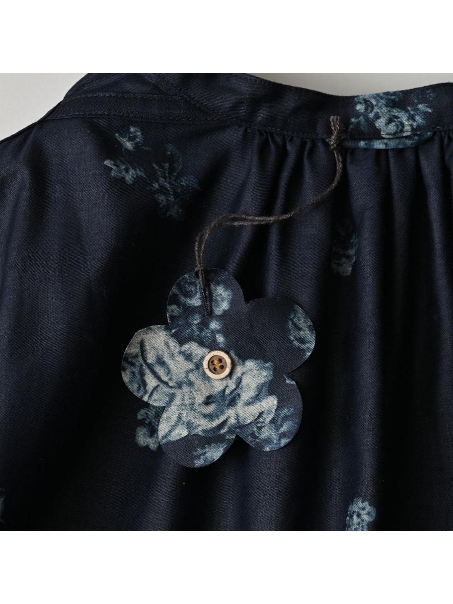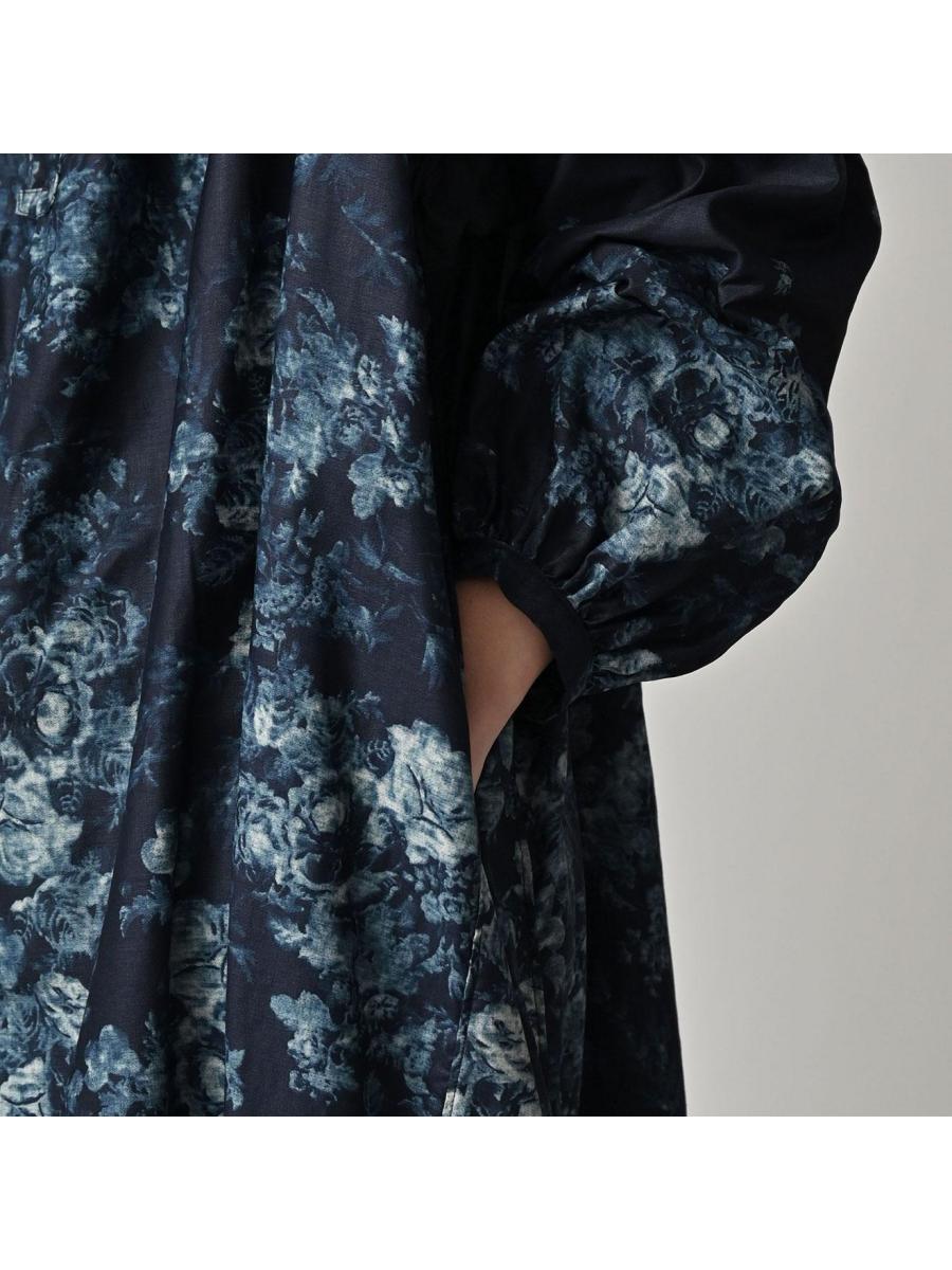 インディゴ抜染ローズプリントのスモックドレス