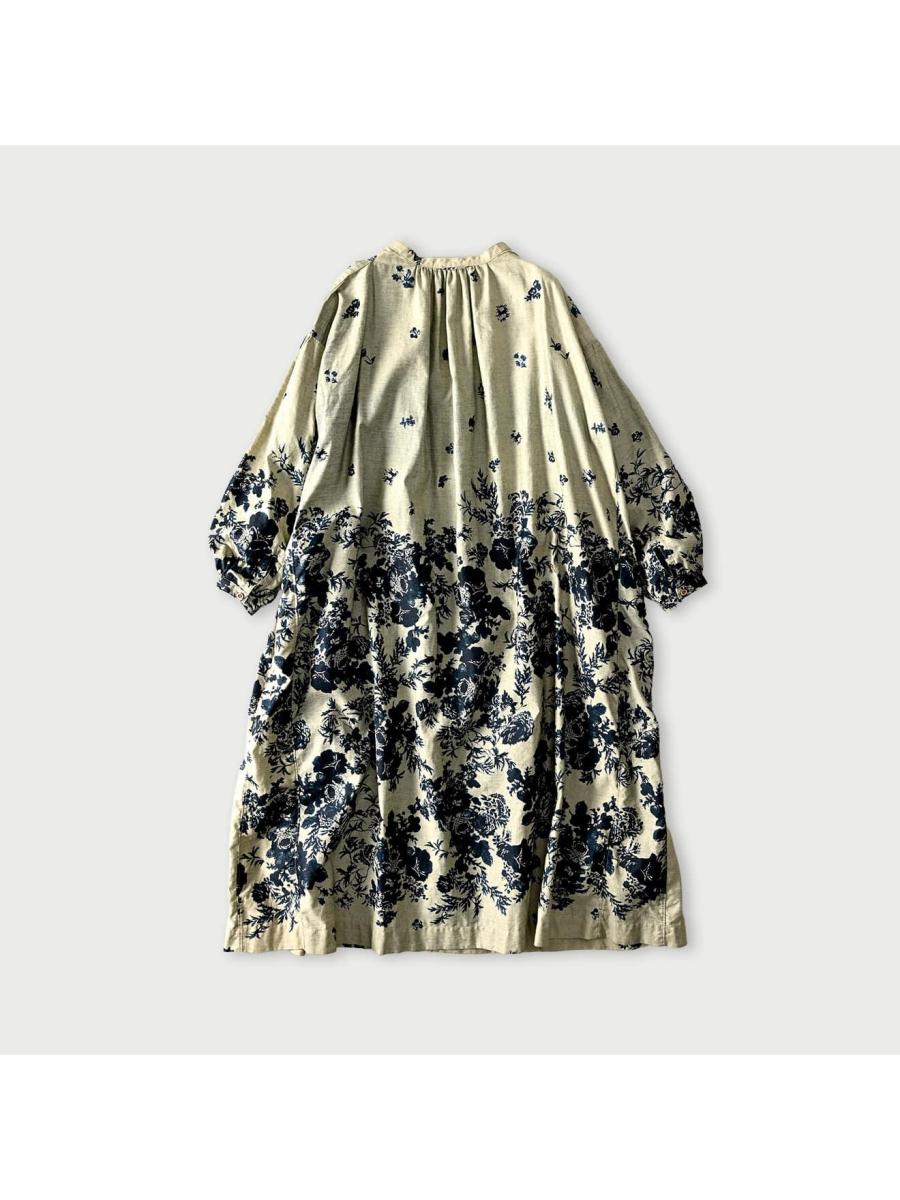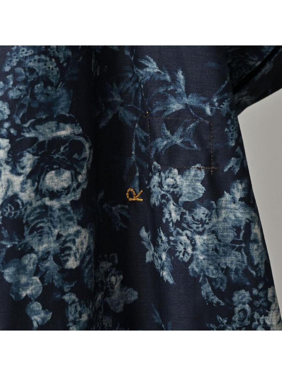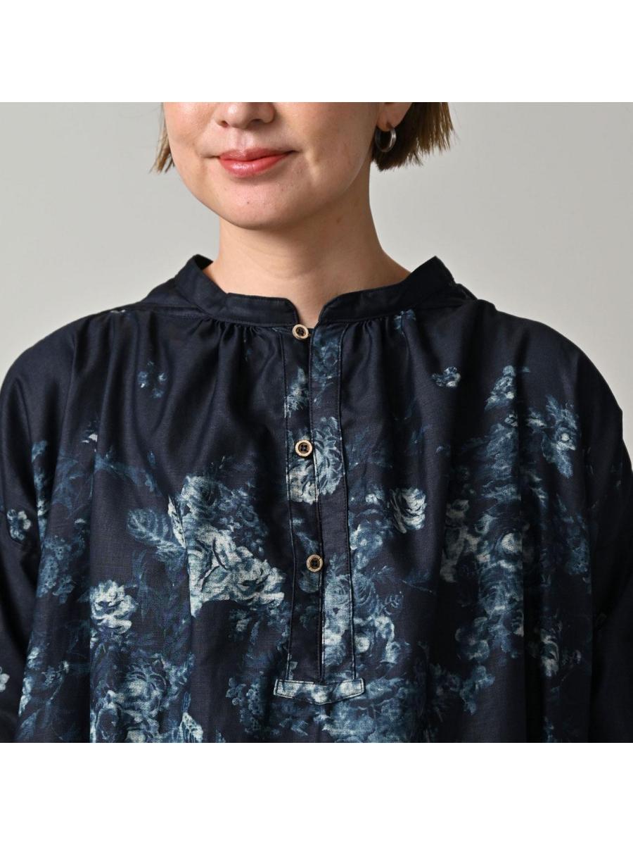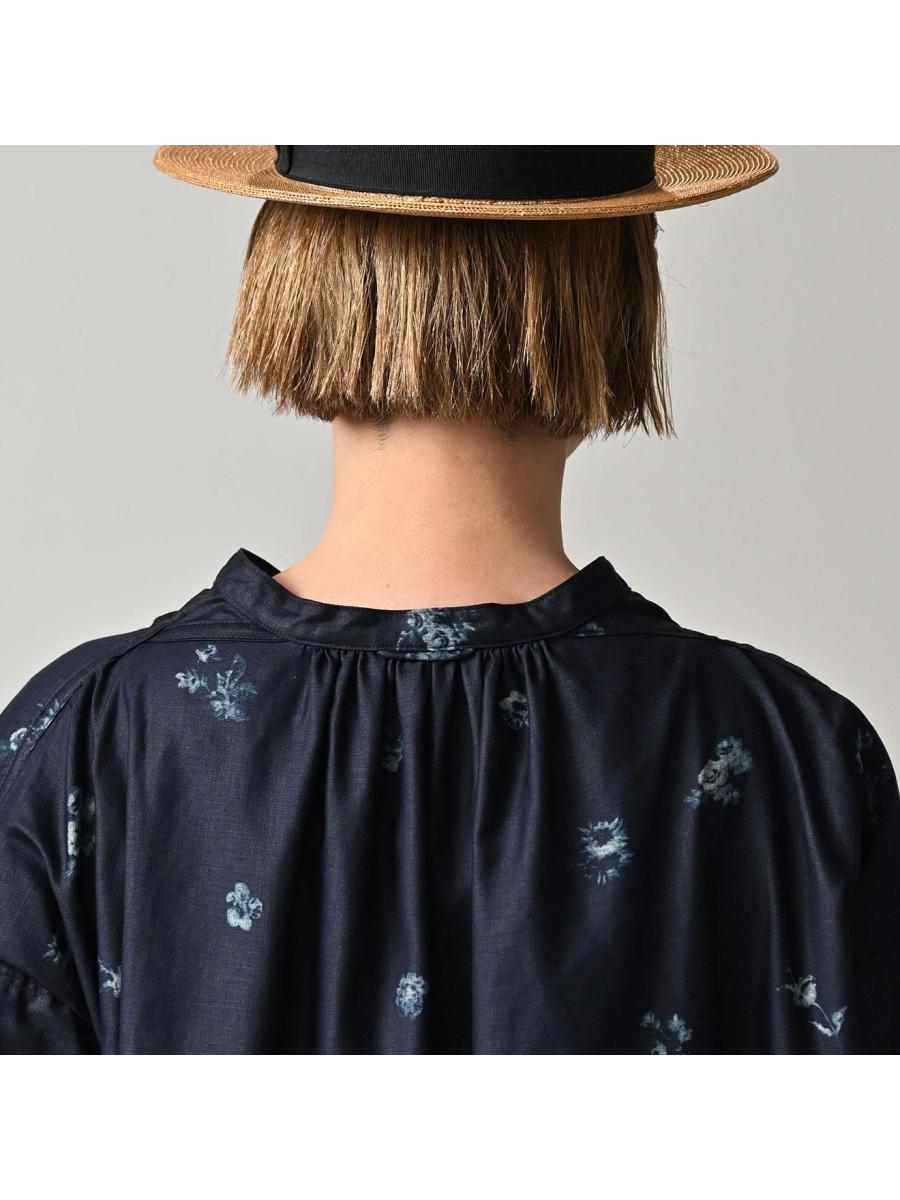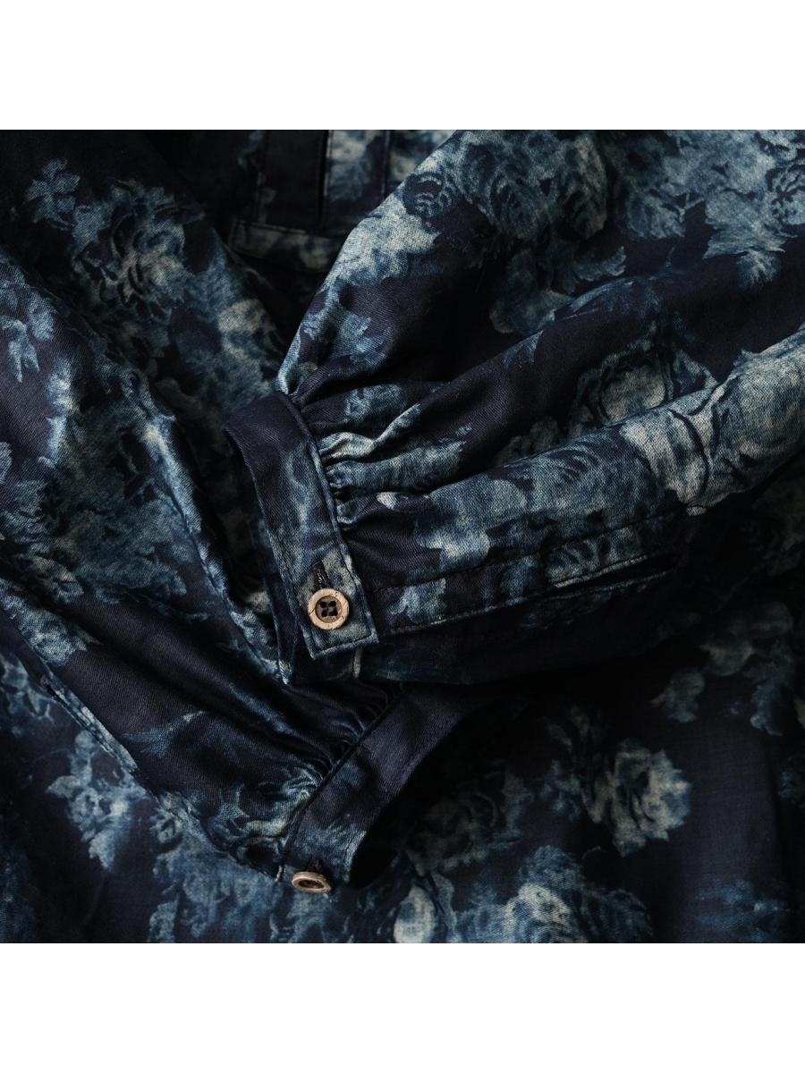 インディゴ抜染ローズプリントのスモックドレス